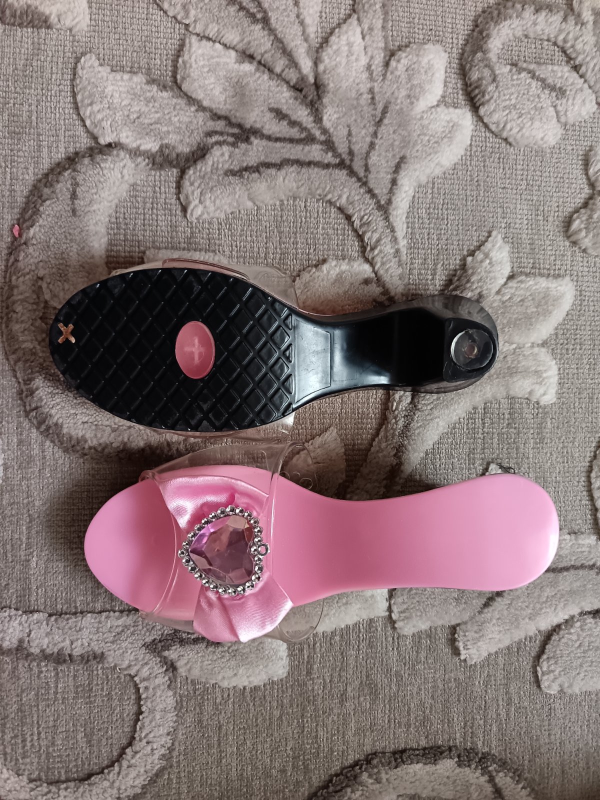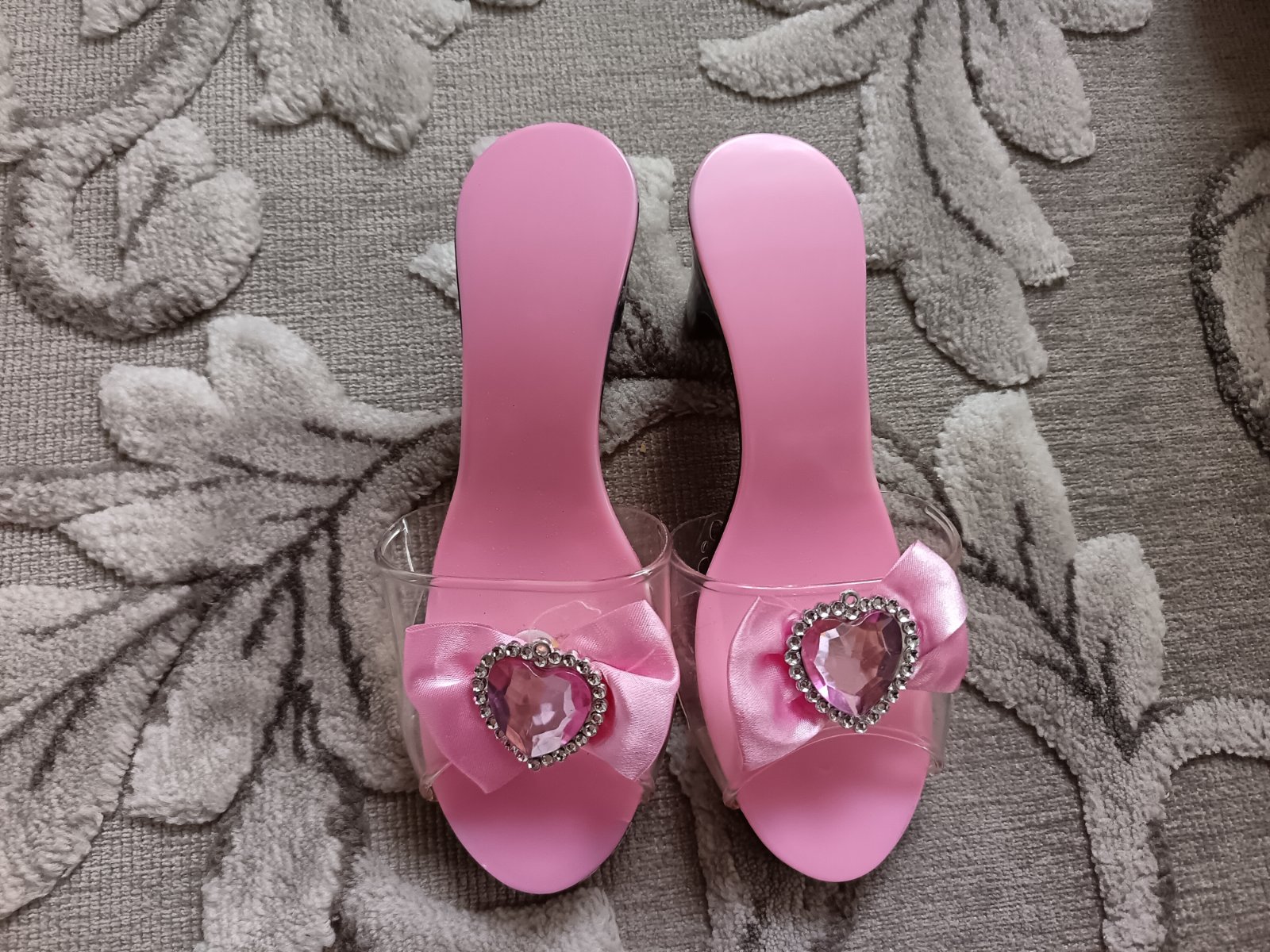Predám veľmi málo používané šľapky pre princezné. Vnútorná dĺžka je 18cm. Výška podpätku je 5cm. Cena je bez poštovného. Tovar nevymieňam za iný!