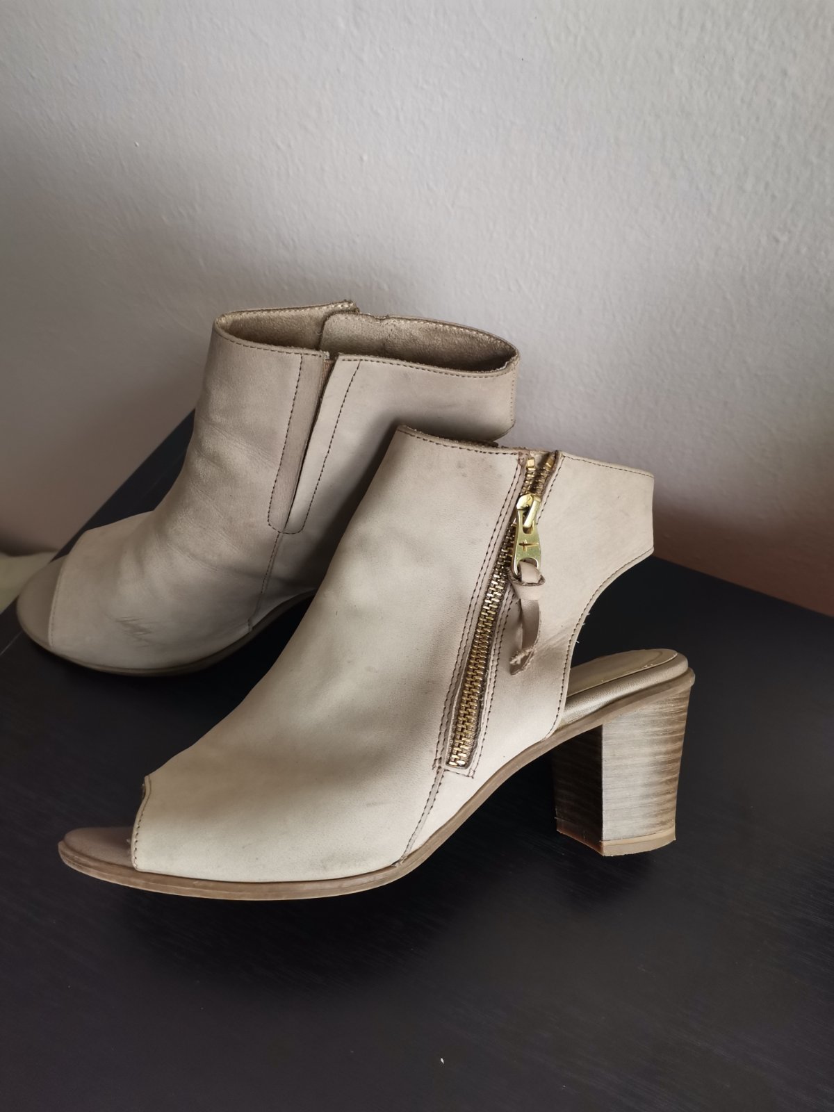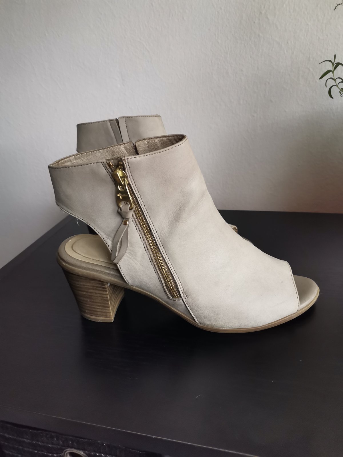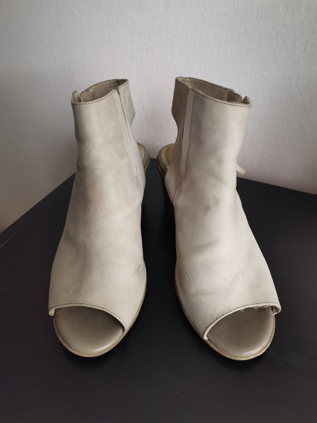 Kožené sandále na pohodlnom 6 cm širšom opätku, mäkké, zboku zapínanie na zips. Opätky neschodené, no z vnútornej strany majú šuchnutia a fliačik na jednej topánke, stielka sa miestami olupuje.