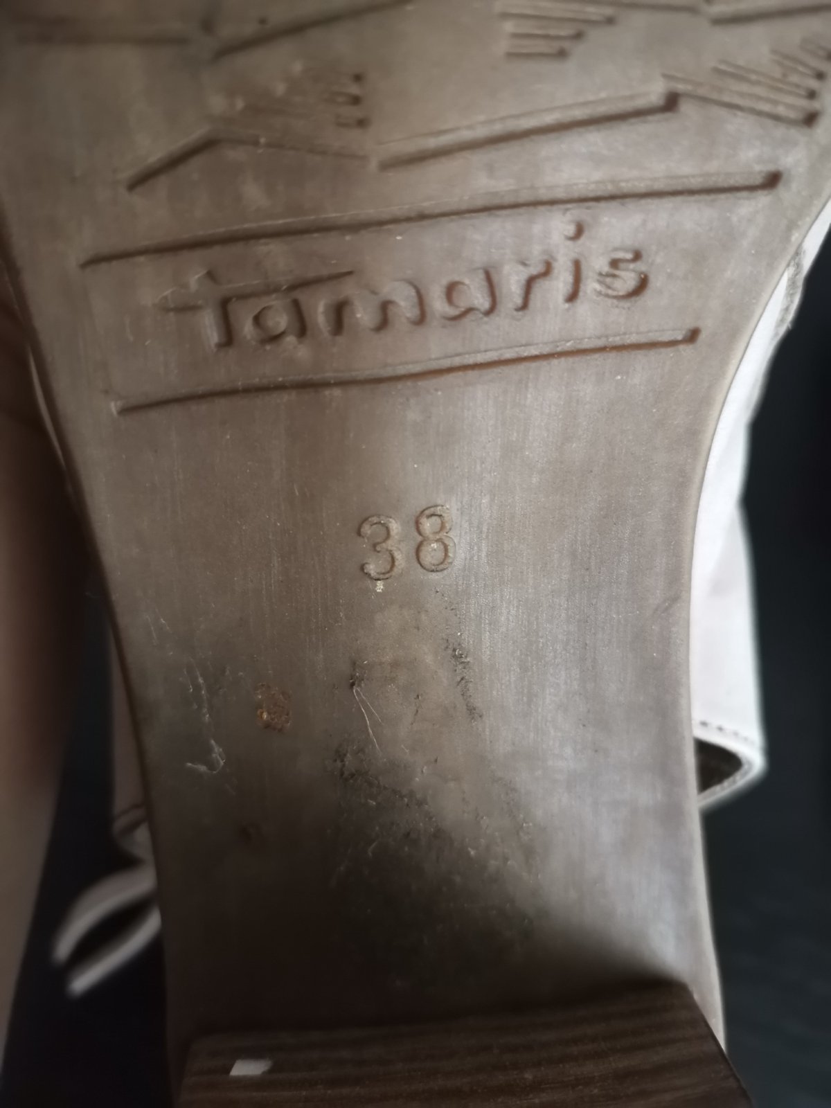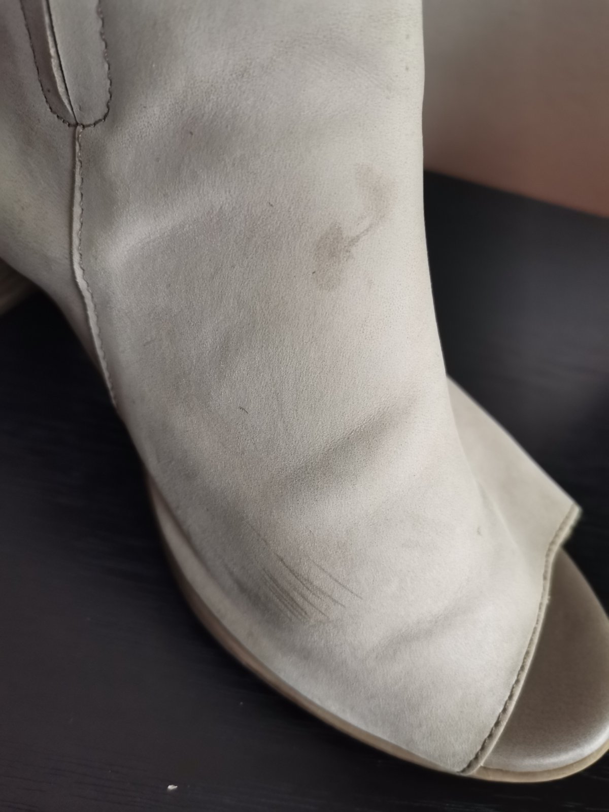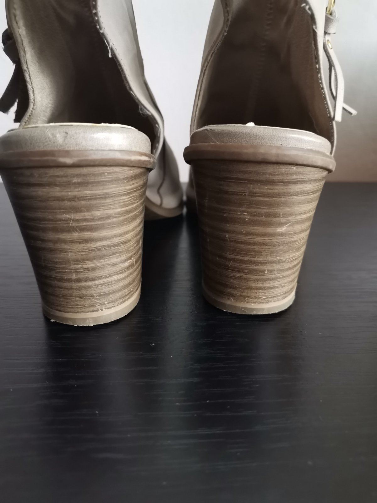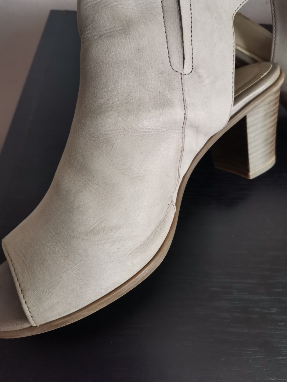 Kožené sandále na pohodlnom 6 cm širšom opätku, mäkké, zboku zapínanie na zips. Opätky neschodené, no z vnútornej strany majú šuchnutia a fliačik na jednej topánke, stielka sa miestami olupuje.