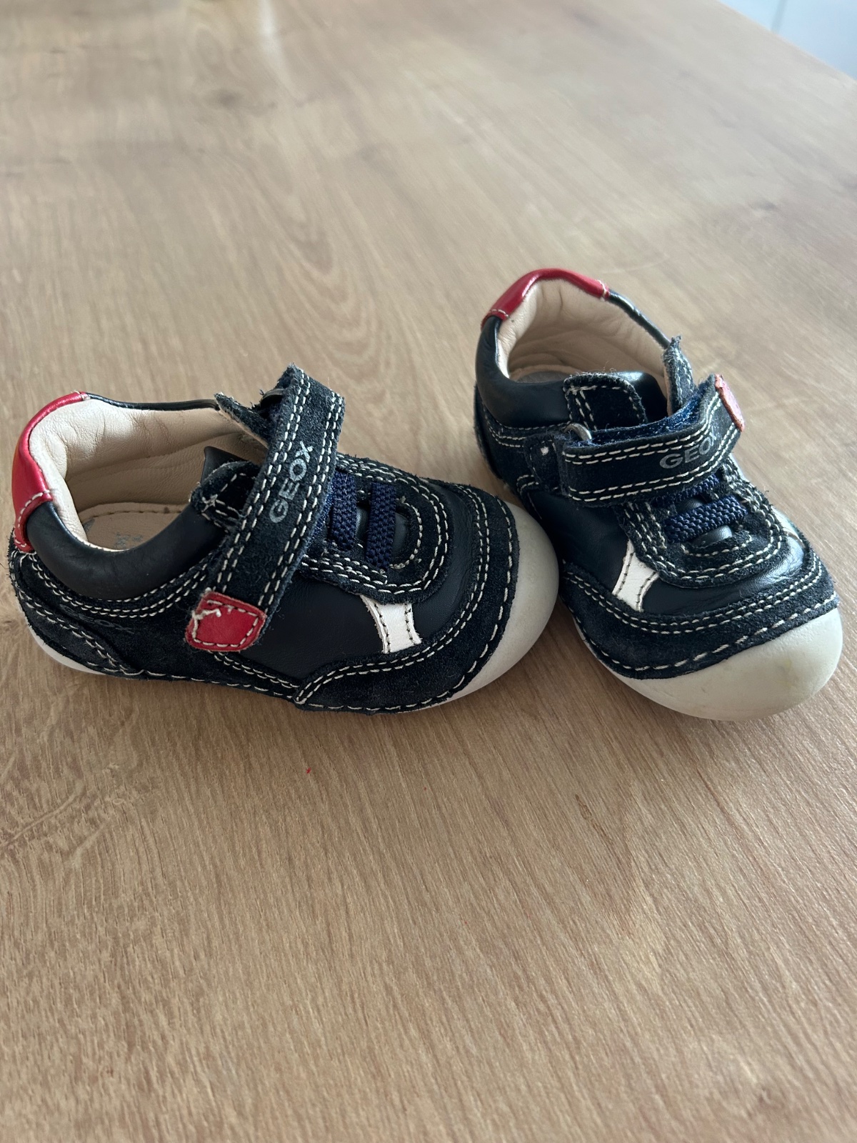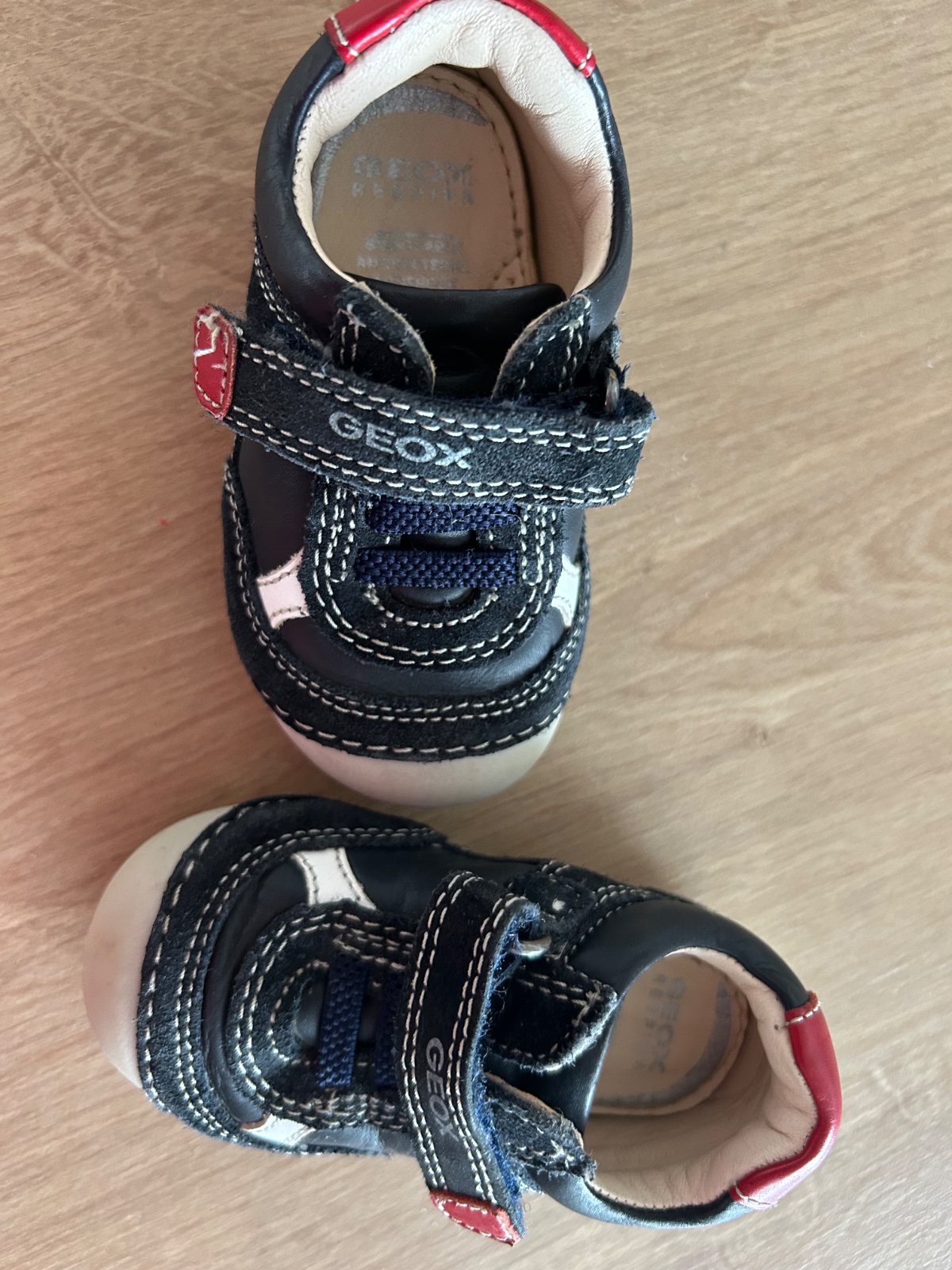 Jesenne topanky, zn. Geox, kozene, velkost 19, nosene, jedna topanka mierne suchnuta podrazka, odfotene, pri noseni nie je vidno,