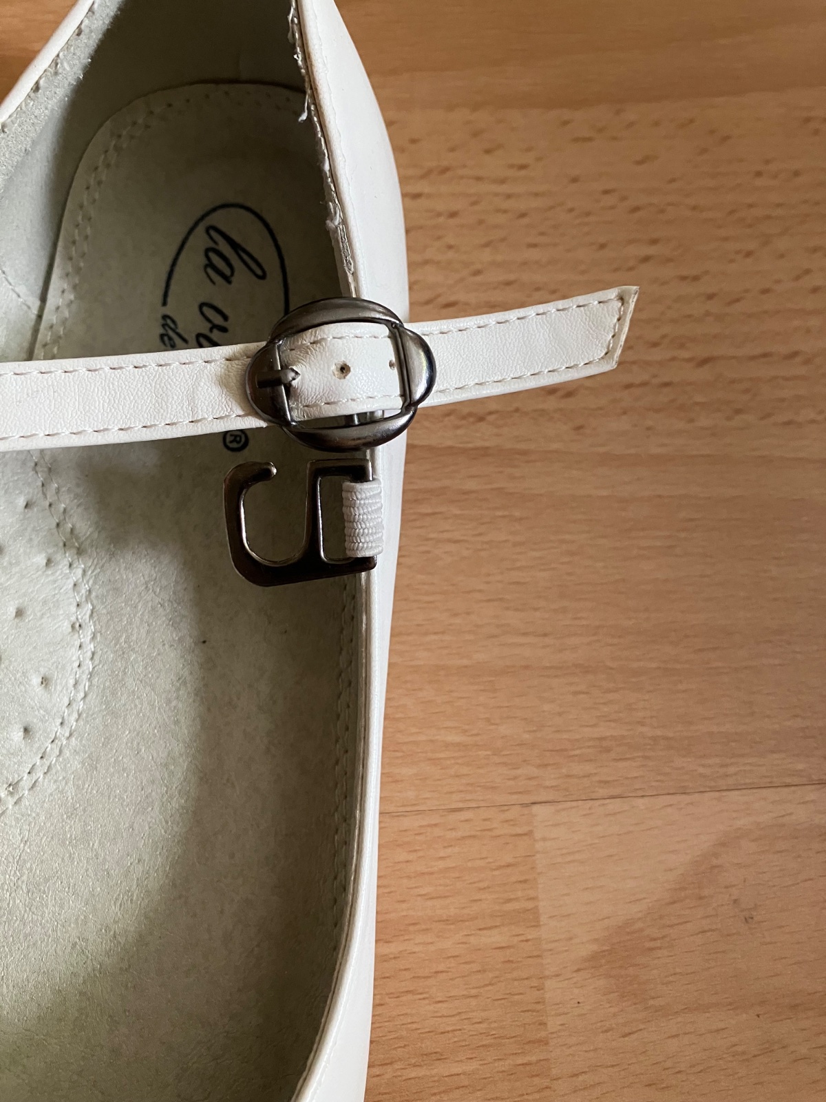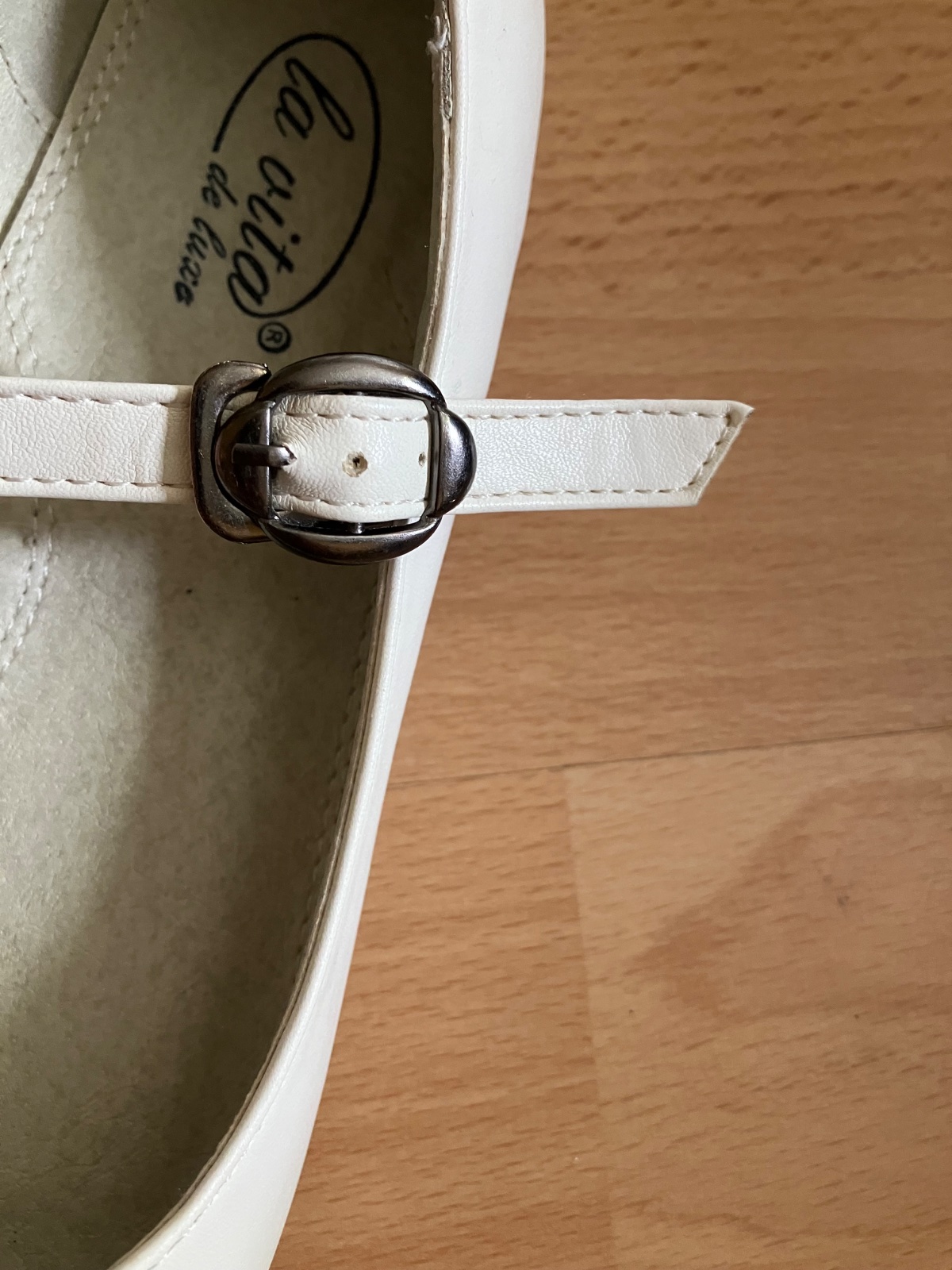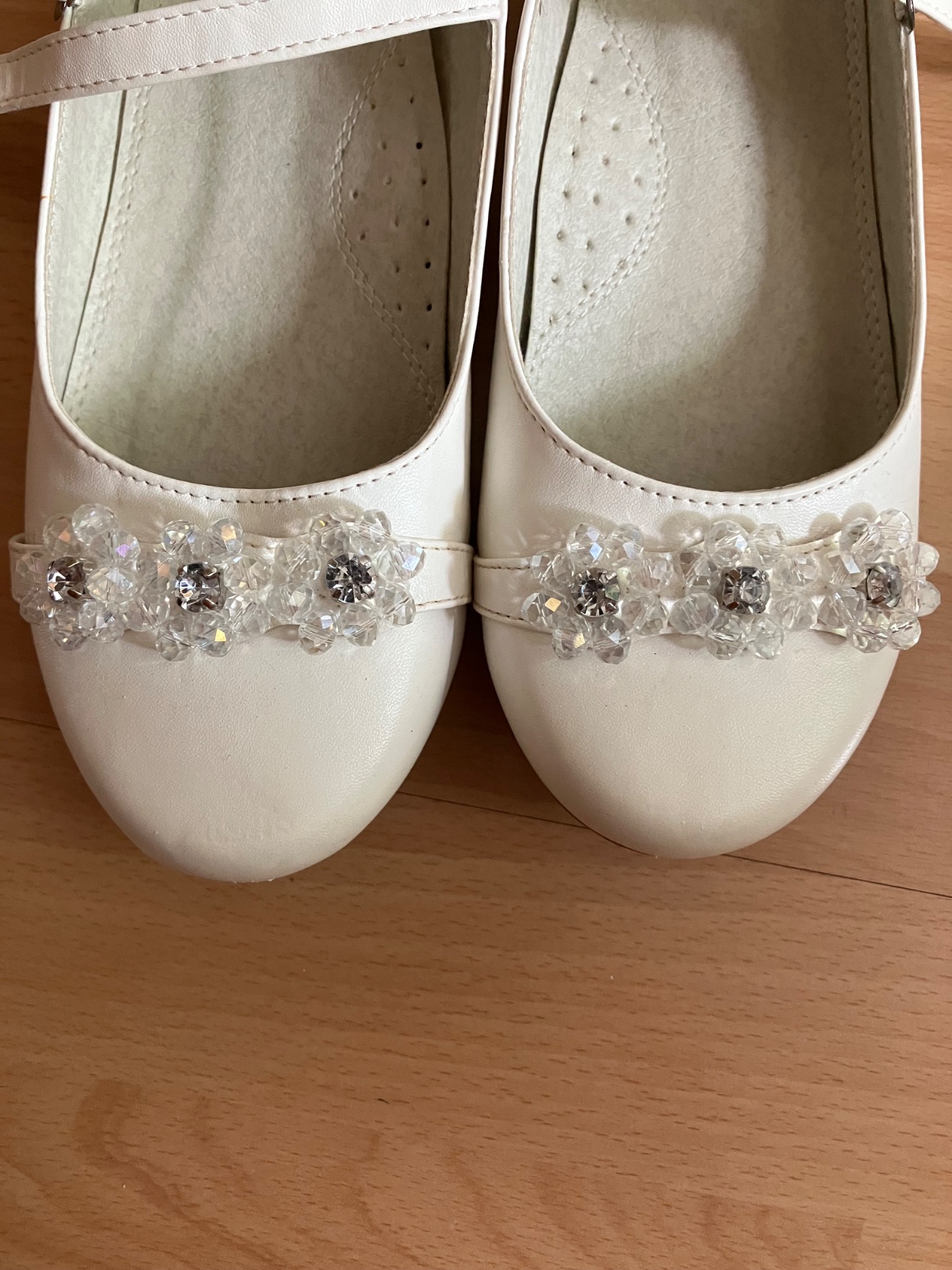 Krásne biele, lakované balerínky, použité asi 3 krát, s vnútornou dĺžkou 20-20,5cm. Uvedená veľkosť 35 podľa mňa menšie (dcéra ich obula v období, keď ostatné topánky mala č34)