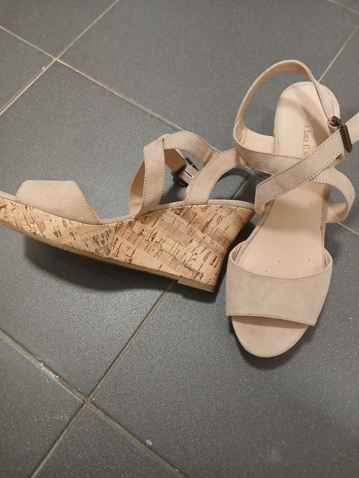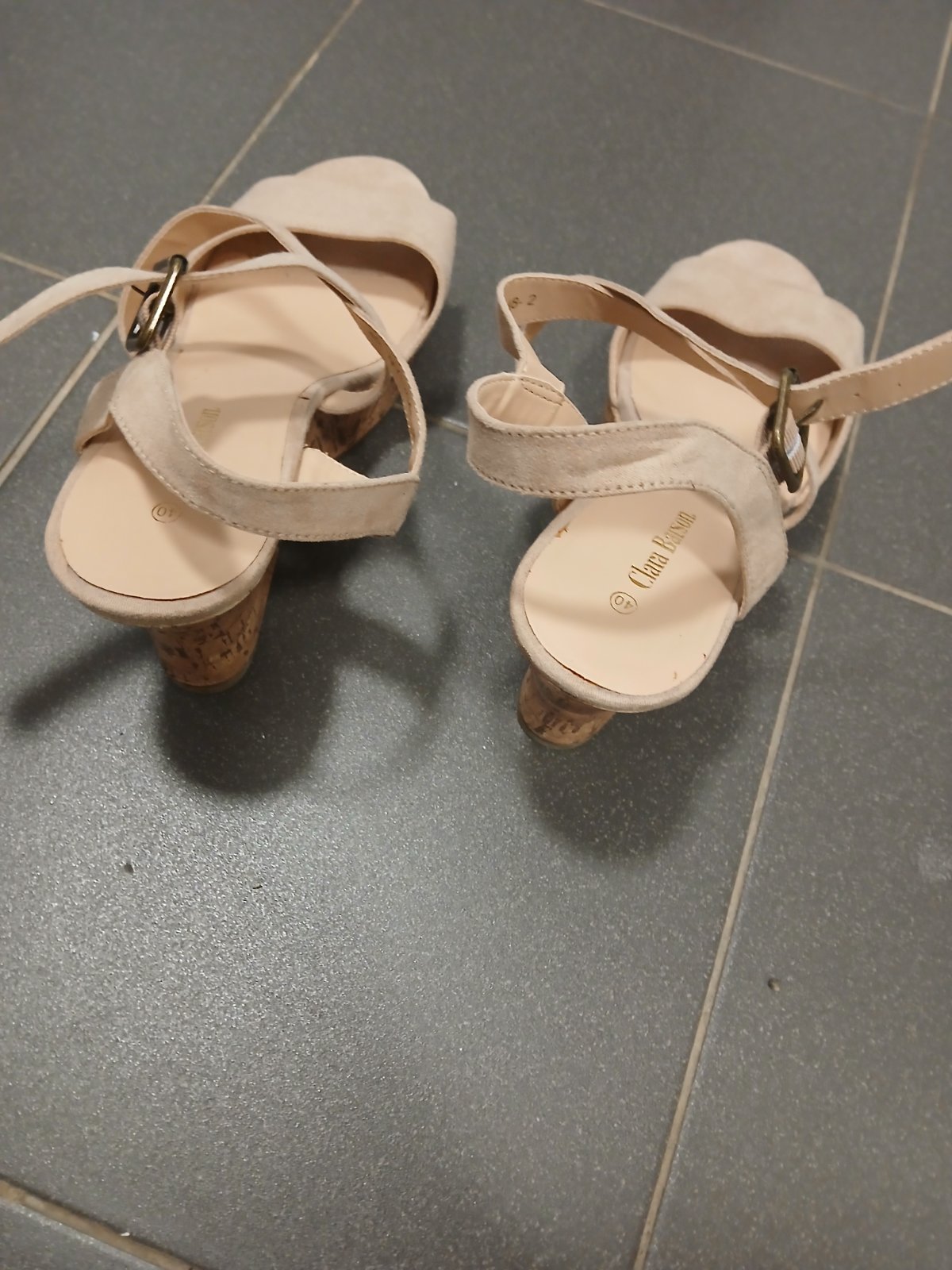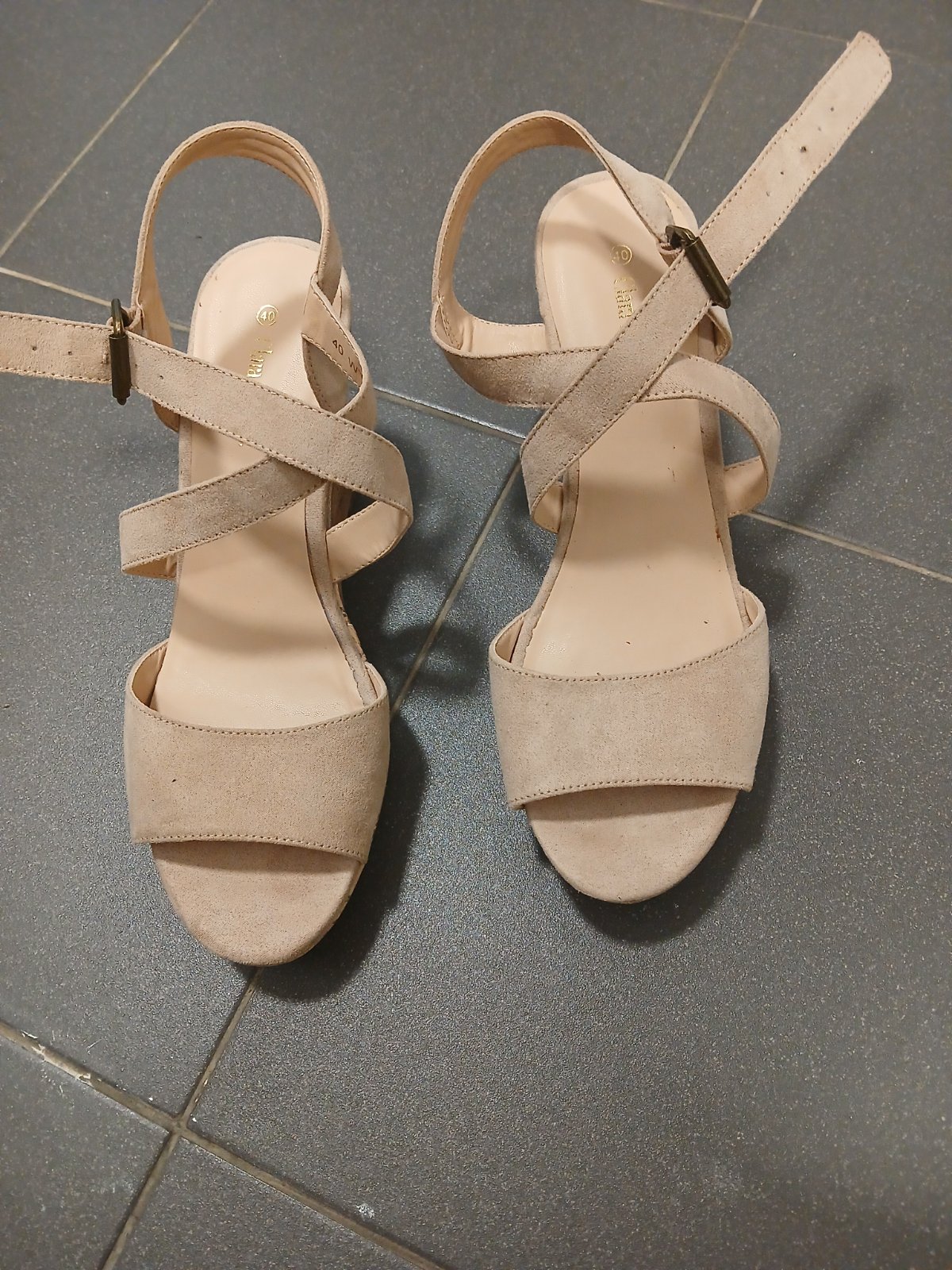 Predam damske sandale bezovej farby. Len odskusane, vonku som ich nikdy nemala. Vyska platformy vpredu 2.5 cm a vzadu opätok 9.5 cm. Cena 8€ plus posta