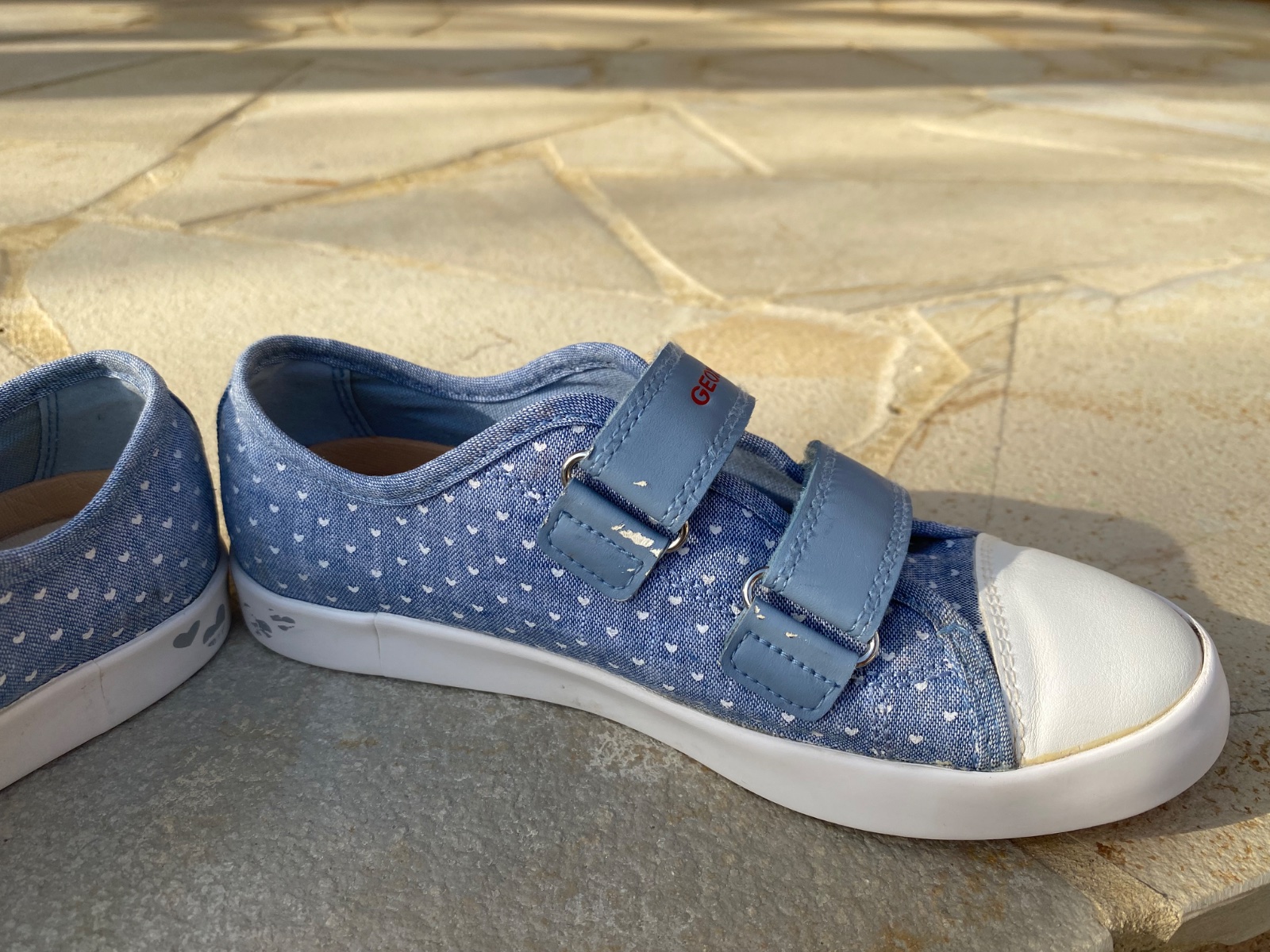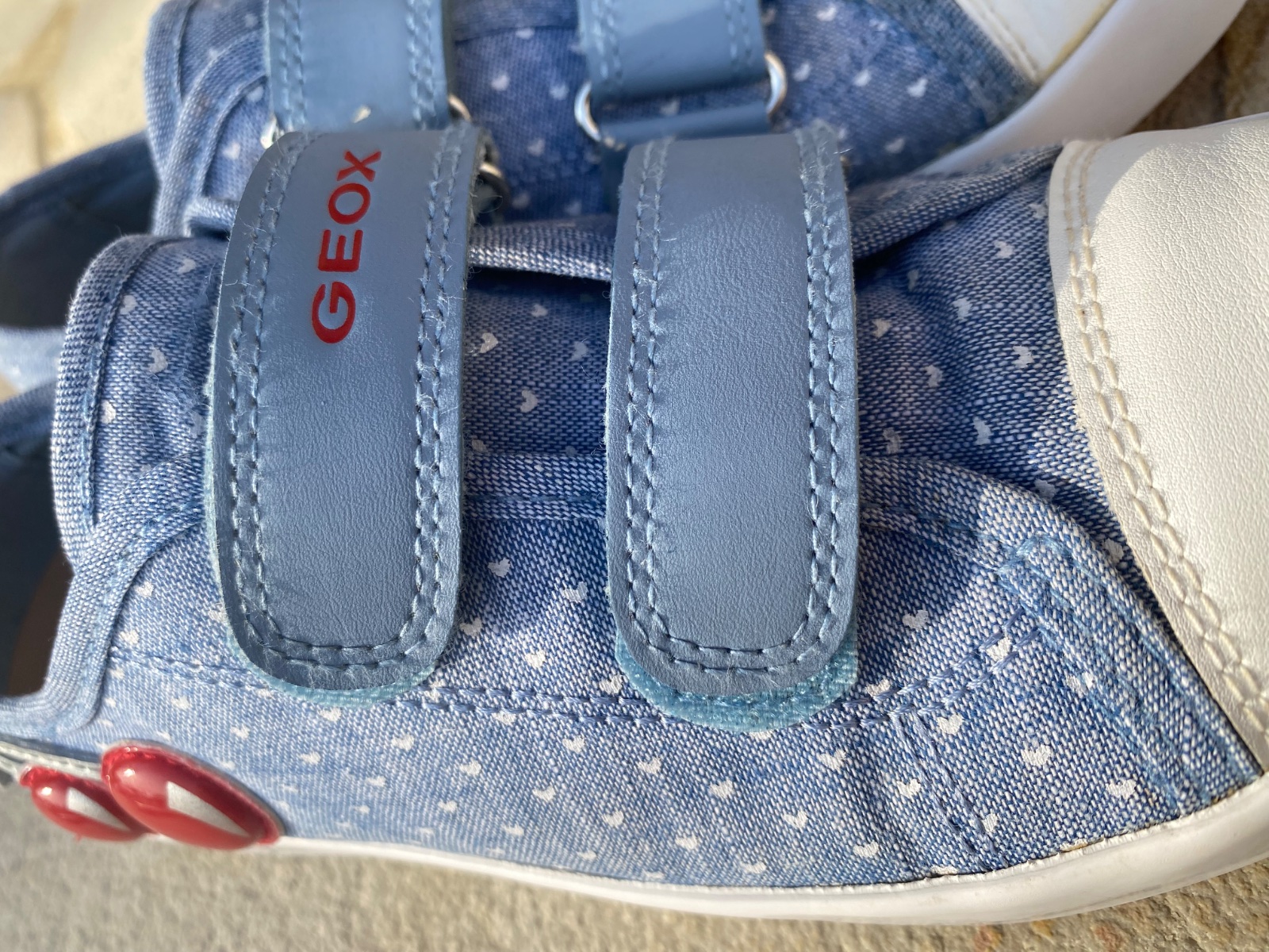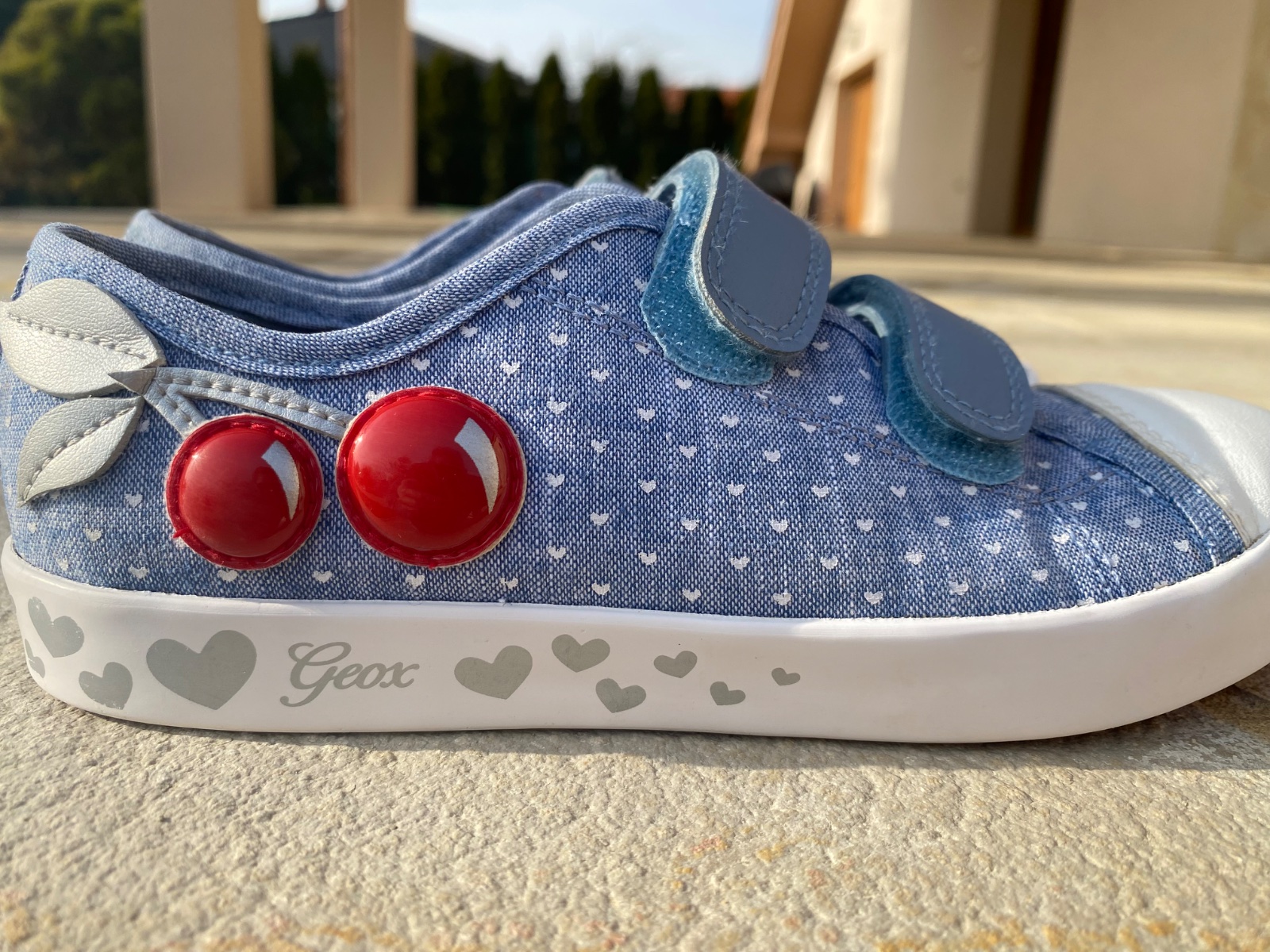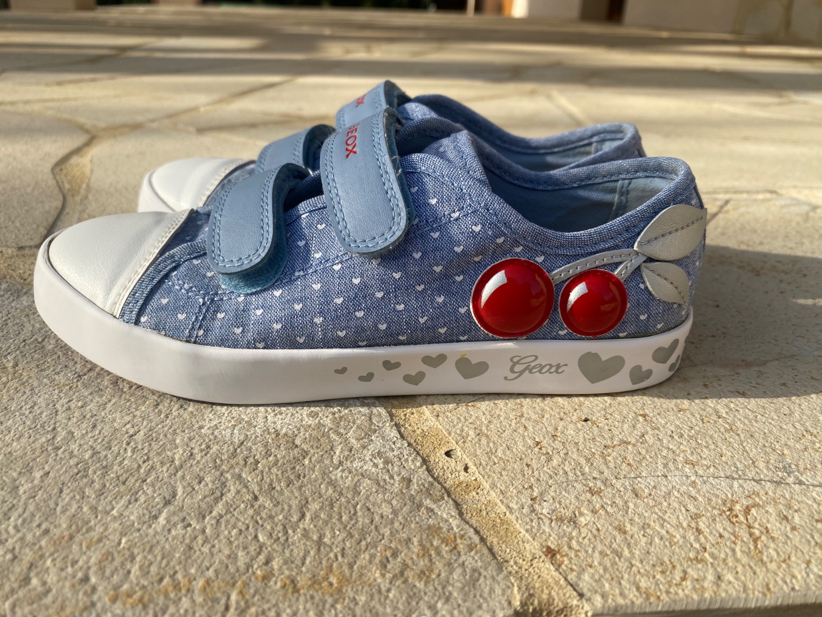 Krasne ceresnickove ako nove platenky geox,asi 3 krat obute,nestihli sme nosit, jedina vada - v zadu osuchnute strieborne srdiecka lebo je to na gume -vid foto,inak nemaju nic,odporucam :)cena je bez posty