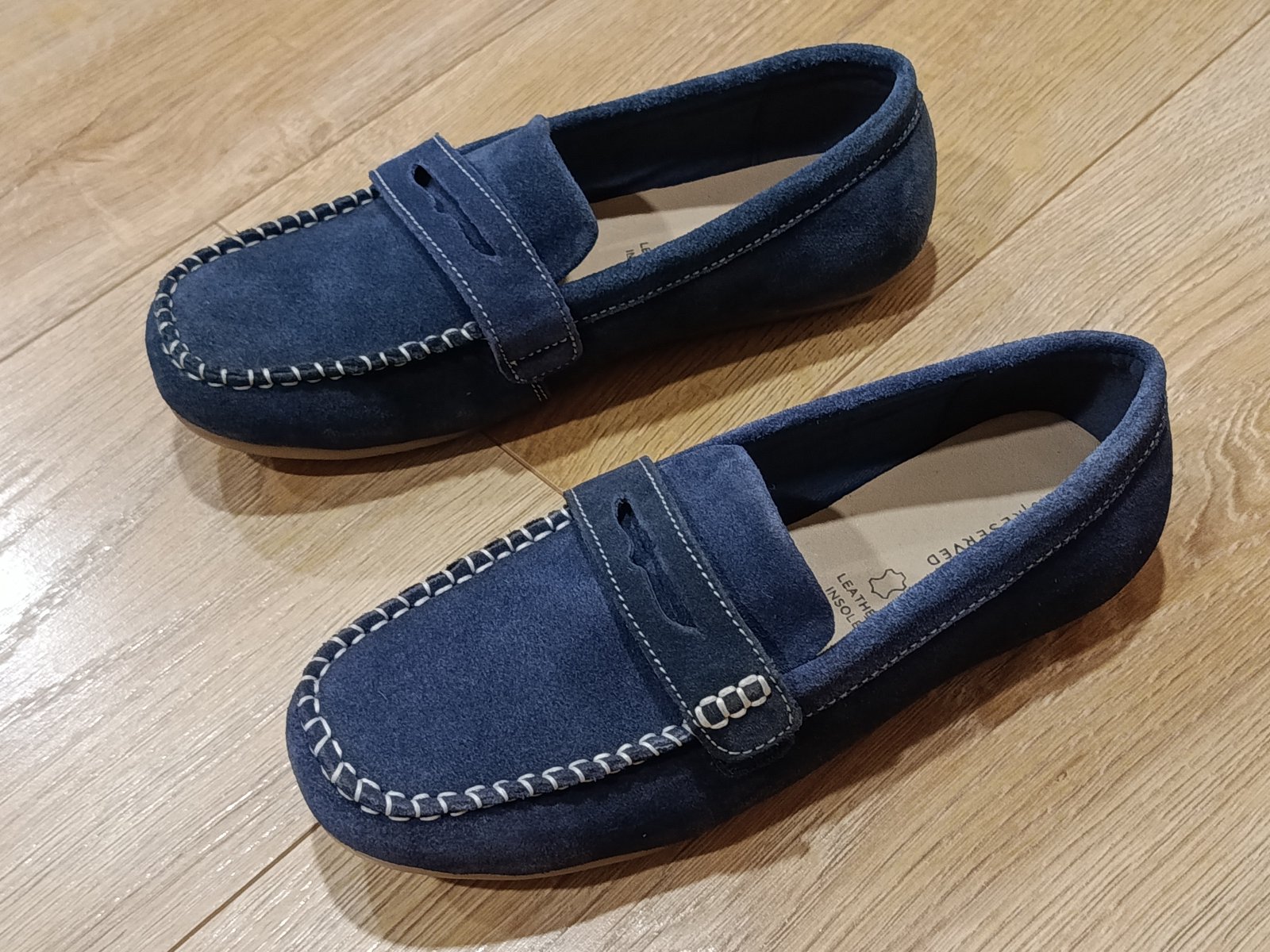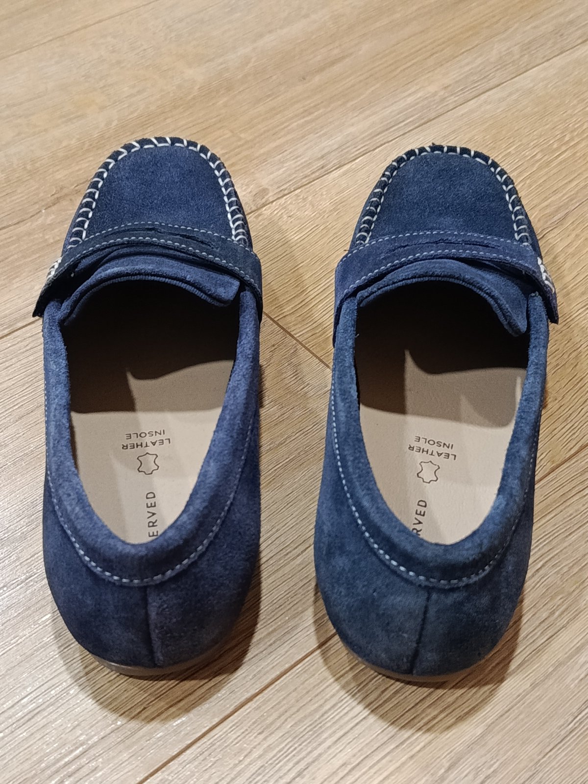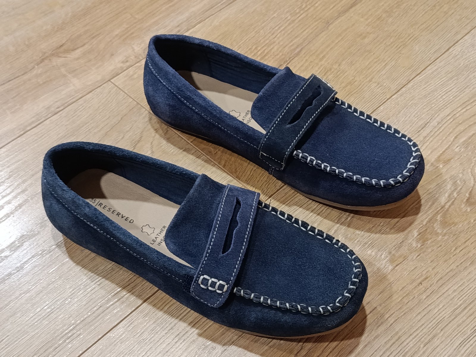 Predám parádne semišové mokasíny, tmavomodrá farba, nemali sme obuté ani raz, ešte zospodu nálepka, zn. RESERVVED, veľ. 35, ako NOVÉ.