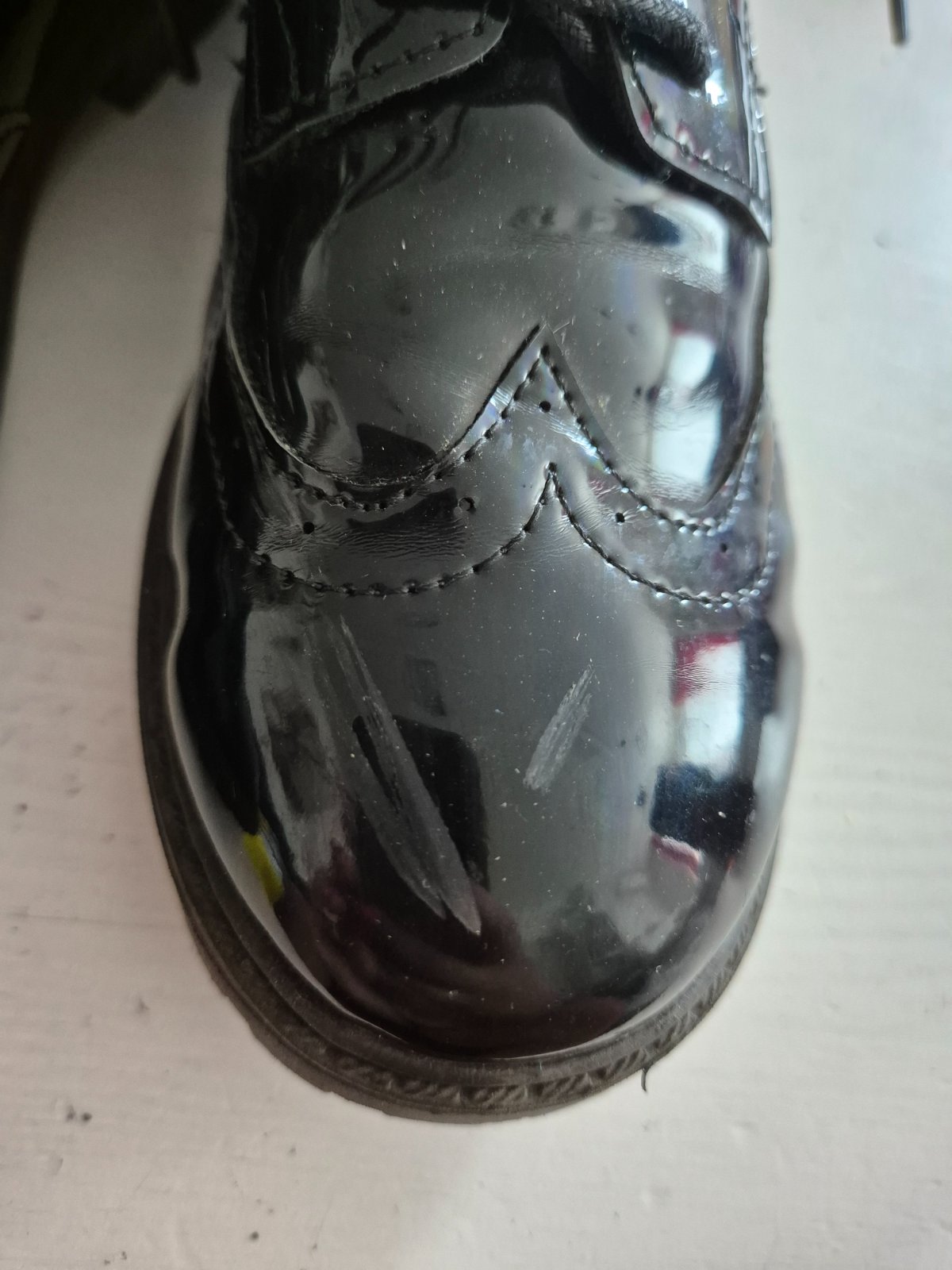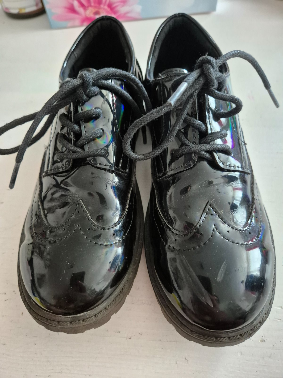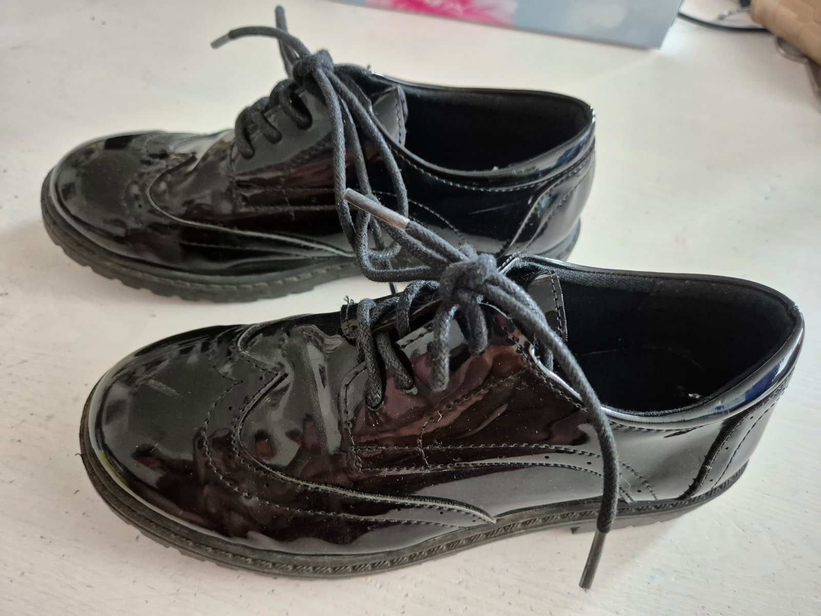 Pekné lesklé poltopánky, na svetlo majú farebné odlesky. Špička "oškretá" ale pri nosení to vôbec nie je vidieť