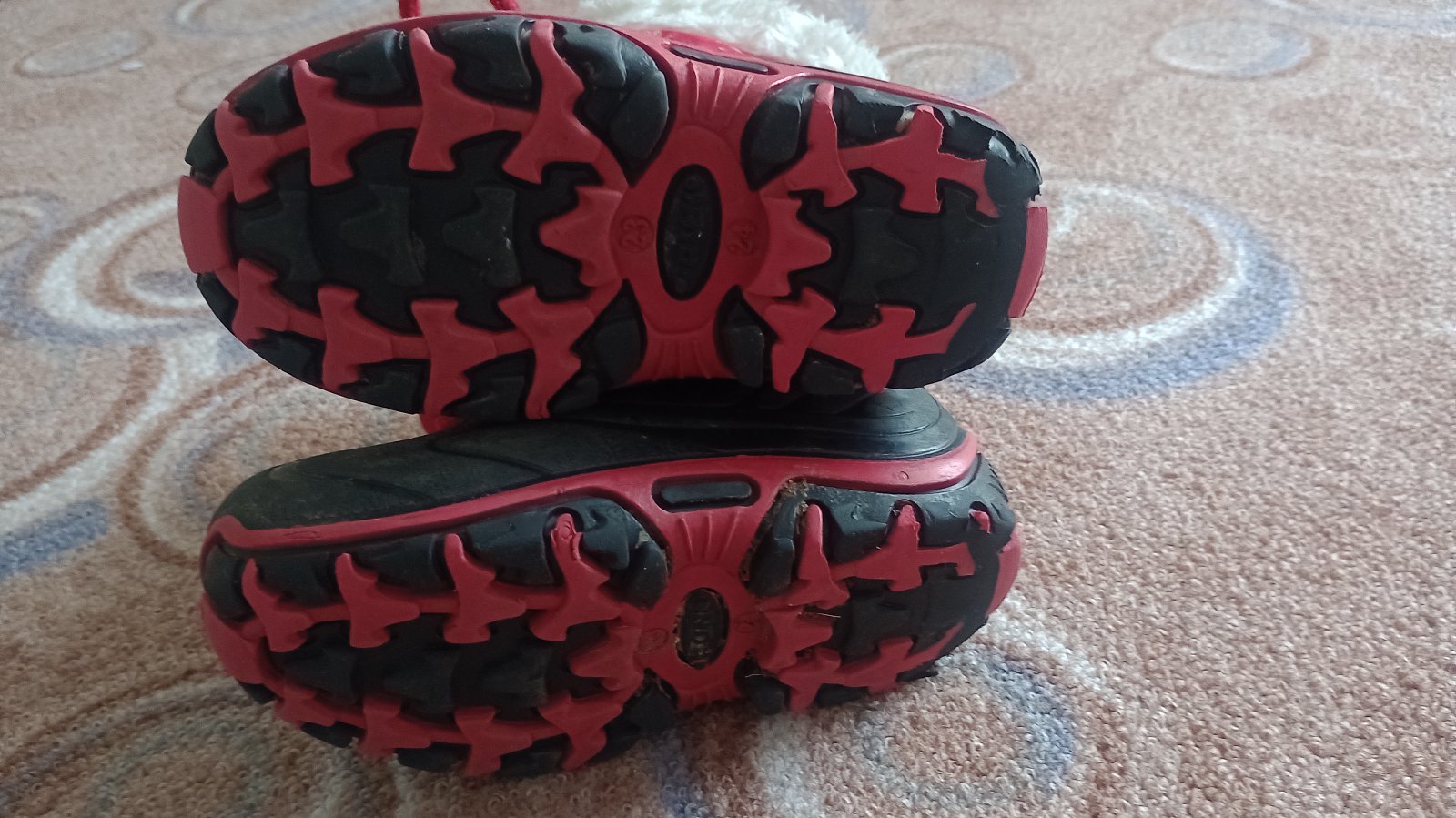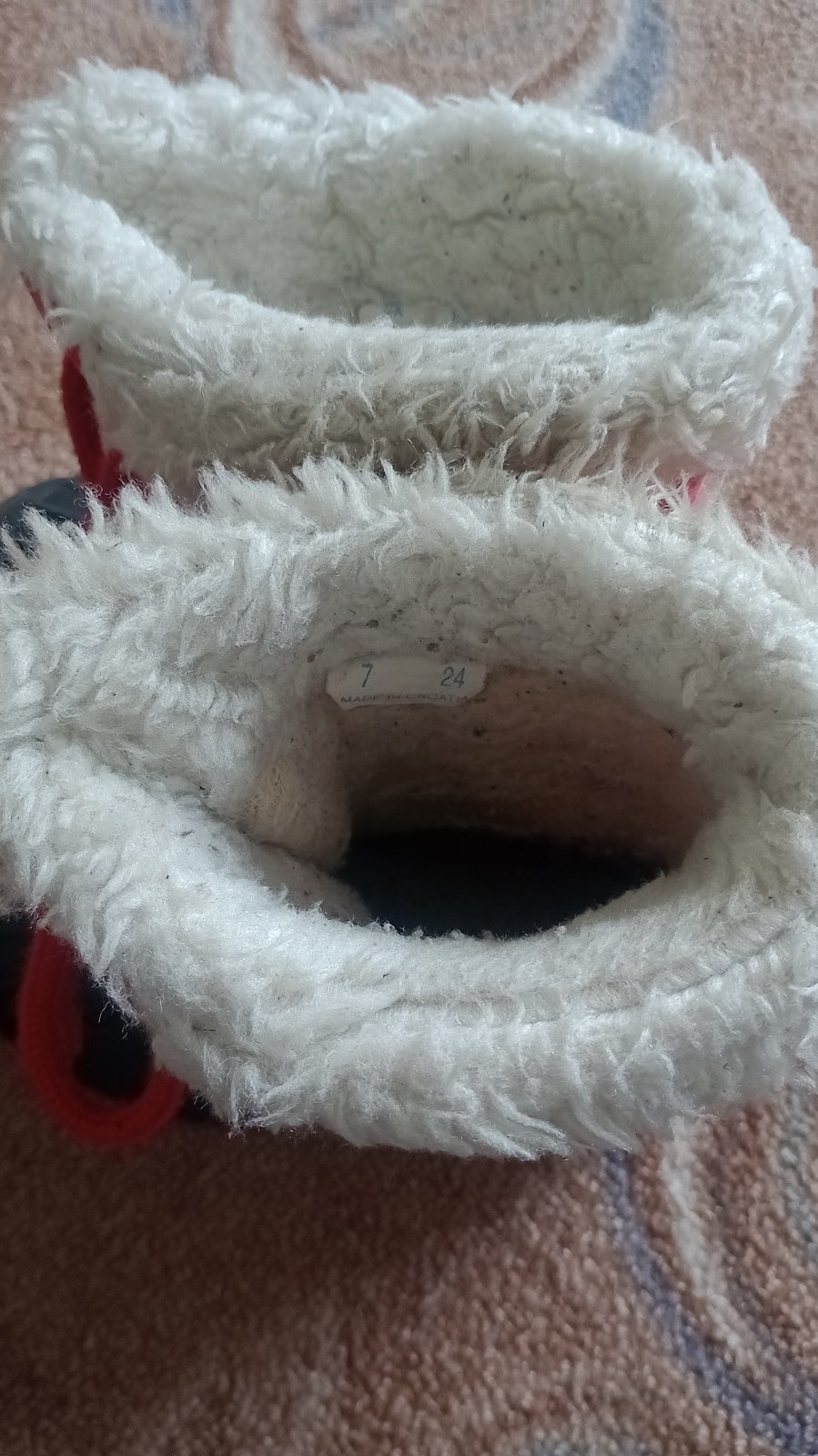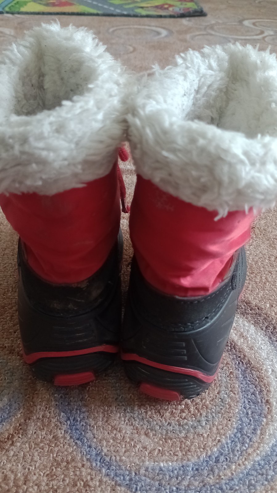 Nosené, vidno už na nich, ale je to len estetická vada, že už nie sú tak žiarivo červené, a kožušinka je zašednutá, možno treba oprať ... inak nositeľné, sú celé, nič nie je roztrhané ani popukané.