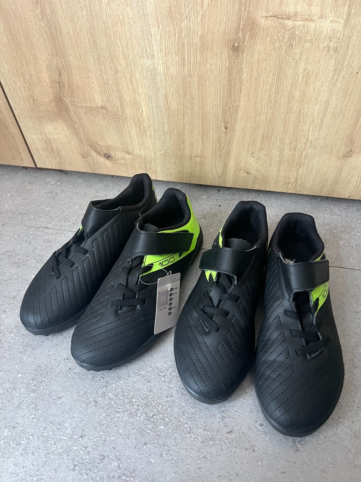 Kopačky Kipsta 100 sú určené re mladých začínajúcich futbalistov na hru na tvrdom alebo umelom povrchu. Jeden pár je veľkost 33 a je ešte s visačkami, nenosený. Druhý pár je veľkosť 32.