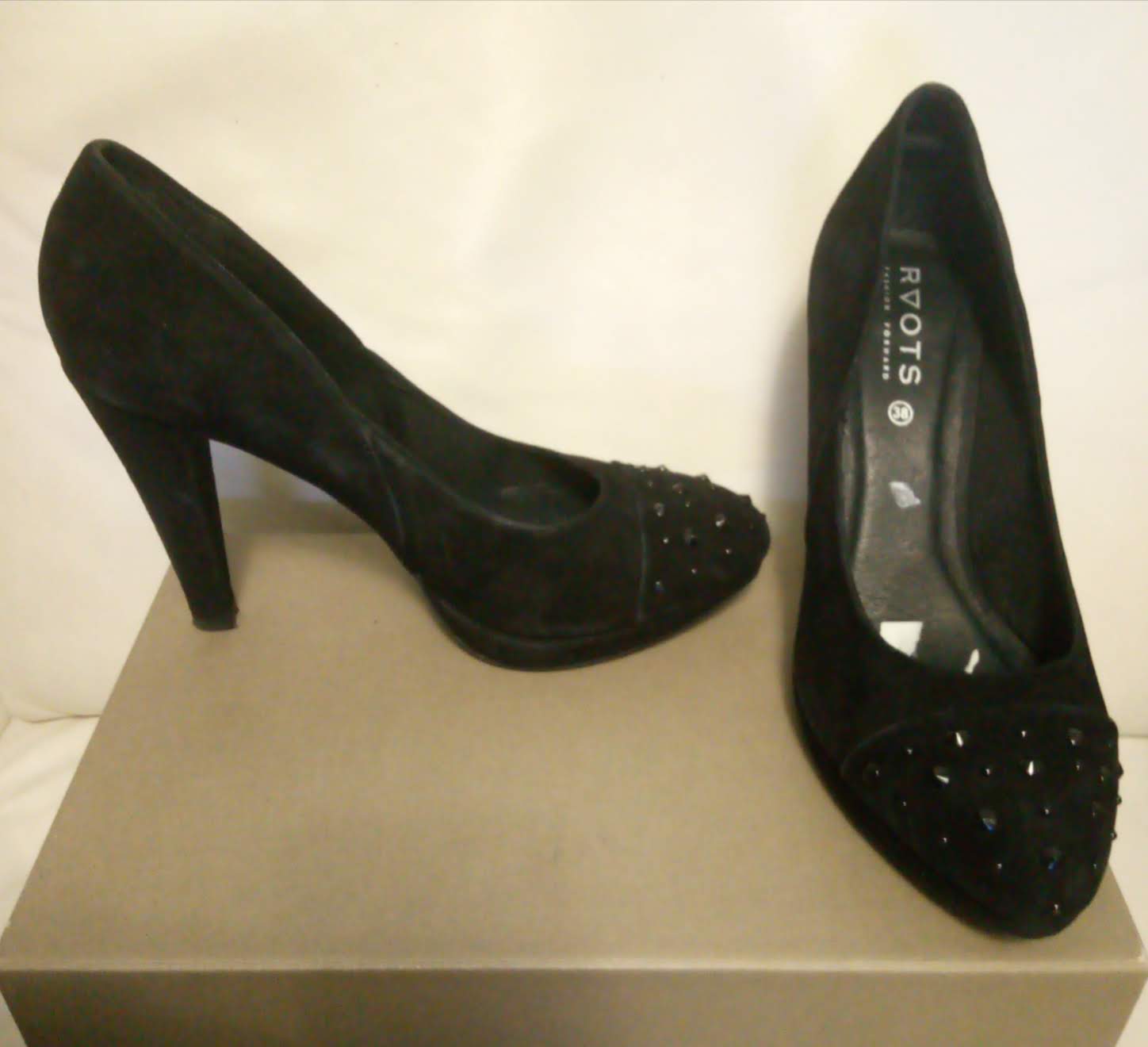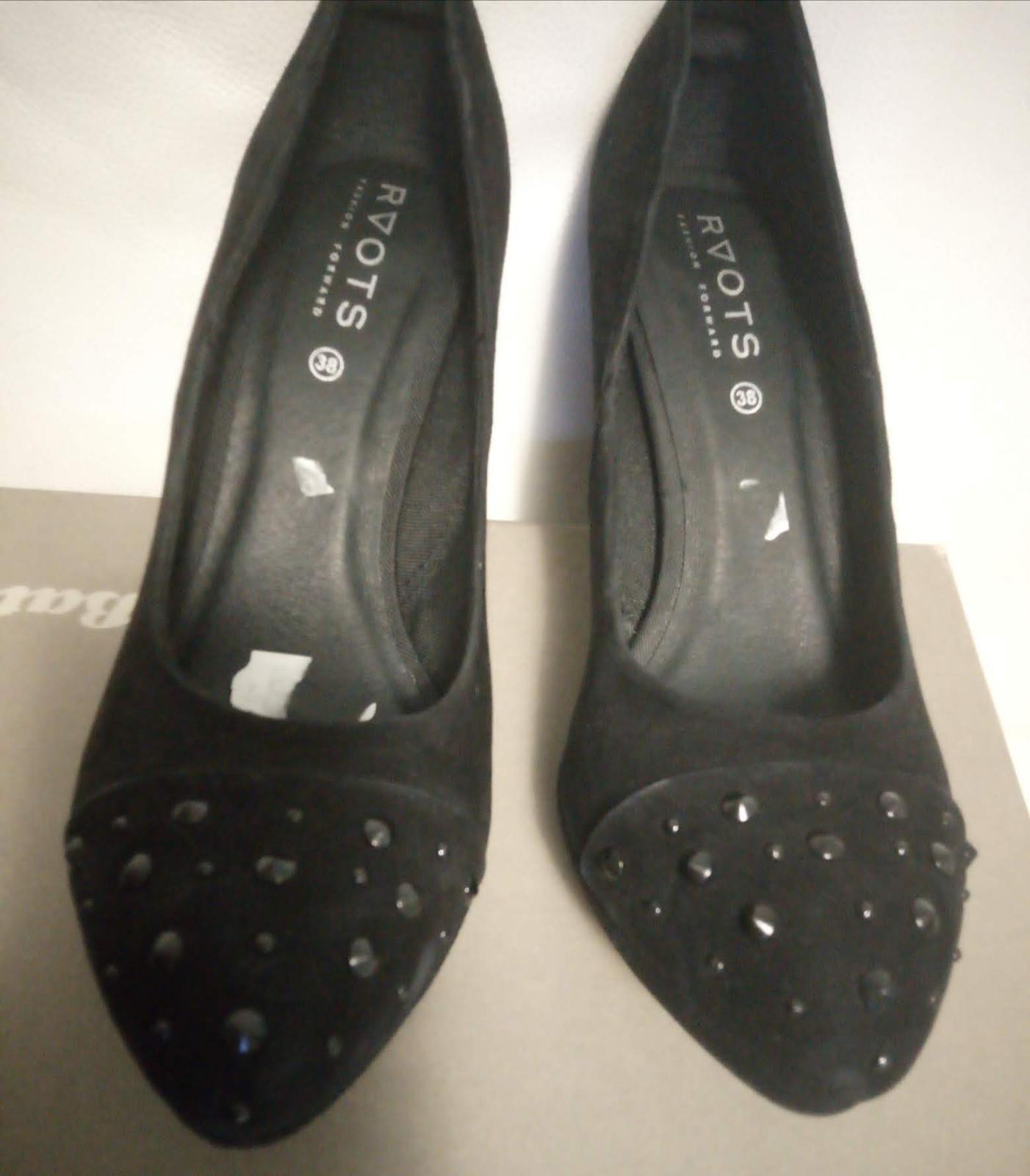 mäkká vnútorná kožená stielka, na špičke pekné detaily. Veľkosť 38, na ktorú aj sedia. Výška opätku 11 cm, platforma 1,5 cm. Hrubší stabilný opätok. Bez poškodení.