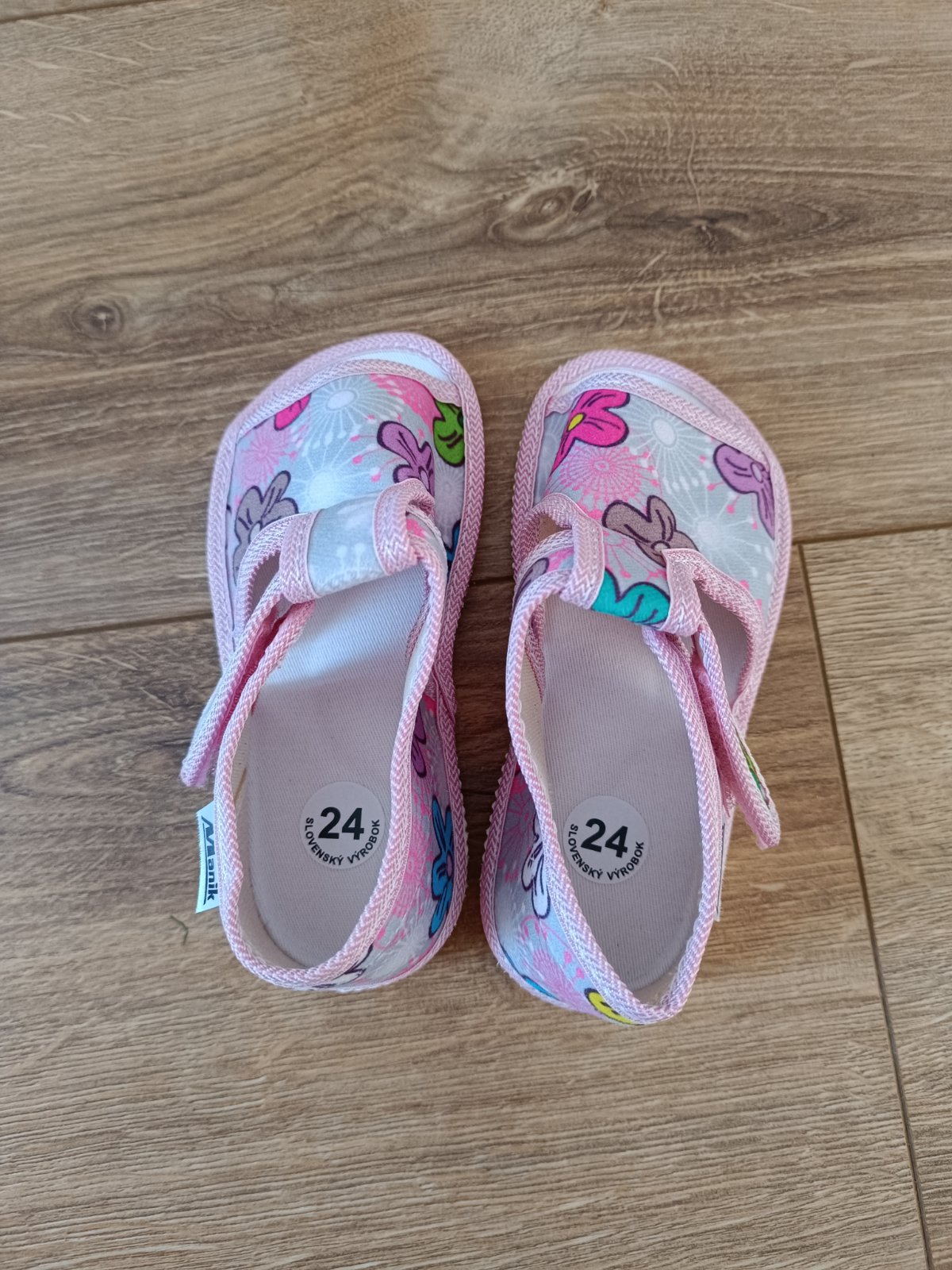 Krásne papučky Manik,veľkosť 24,nosené v školke,sú v dobrom stave,suchý zips lepí. Cena za 1 pár 7€.
