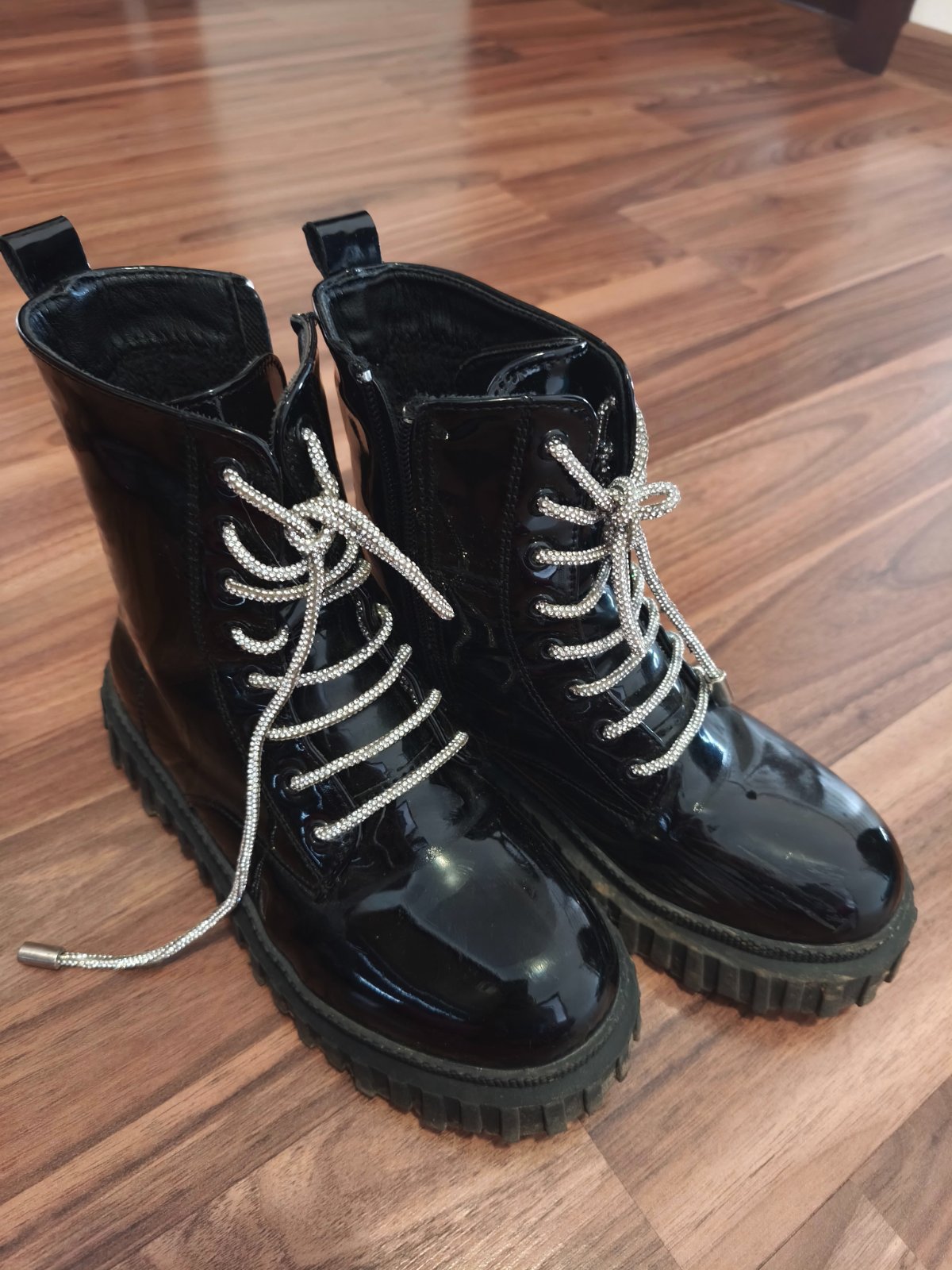 Lakovo-kožené oteplené čižmy s prackou na boku, ktorá sa dá posúvať, známky používania, viď. foto, na pravej čižme treba dať vymeniť zips, majú ozdobné pracky aj dole, v. 35, výška čižiem 40,5 cm, ...