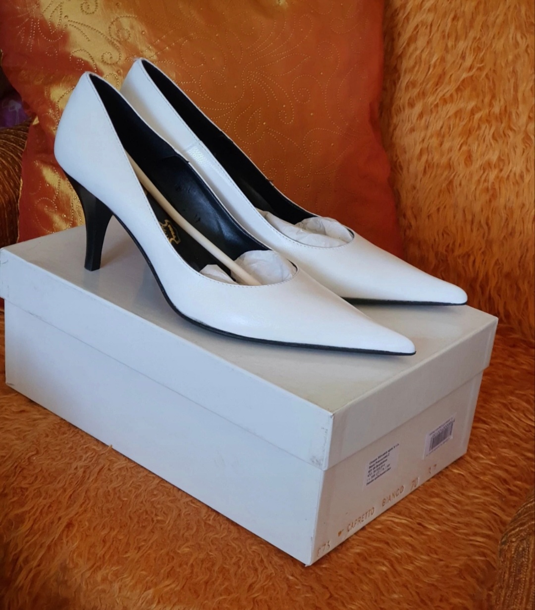 Presne 4x obuté svadobné lodičky. Na jednej je ruzovkasta skvrnka veľmi malá. Ak by mi nepadla klenba po deťoch nepredam ich. Sú kožené. Vhodné aj na dotvorenie. Veľkosť sedí na 37. Cena bez pošto...