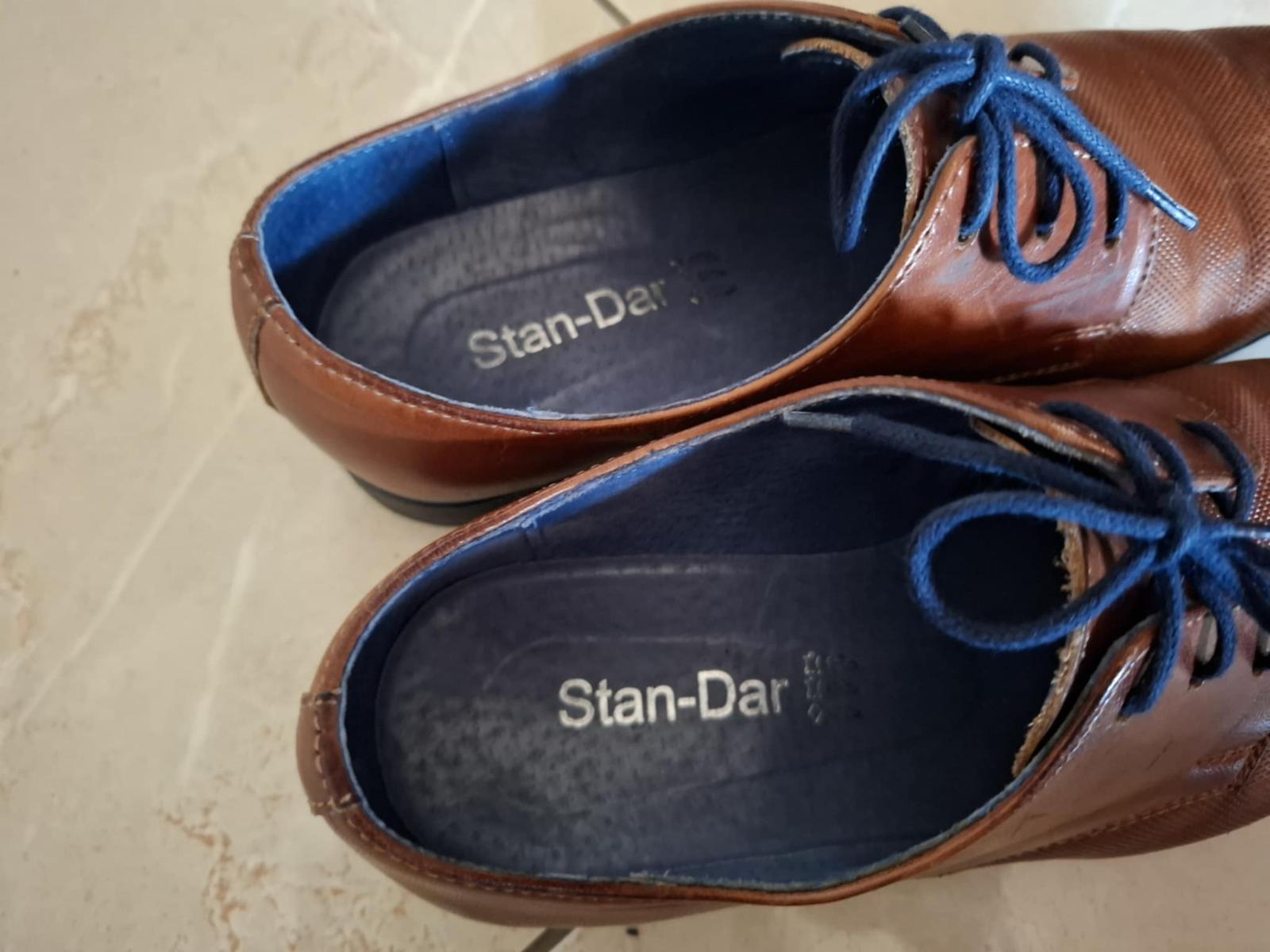 Kožené poltopánky vhodné k obleku. Veľkosť 36 ale sú trocha väčšie, kľudne aj na nohu 37. Minimálne nosené, syn ich mal na prvé sväté prijímanie.