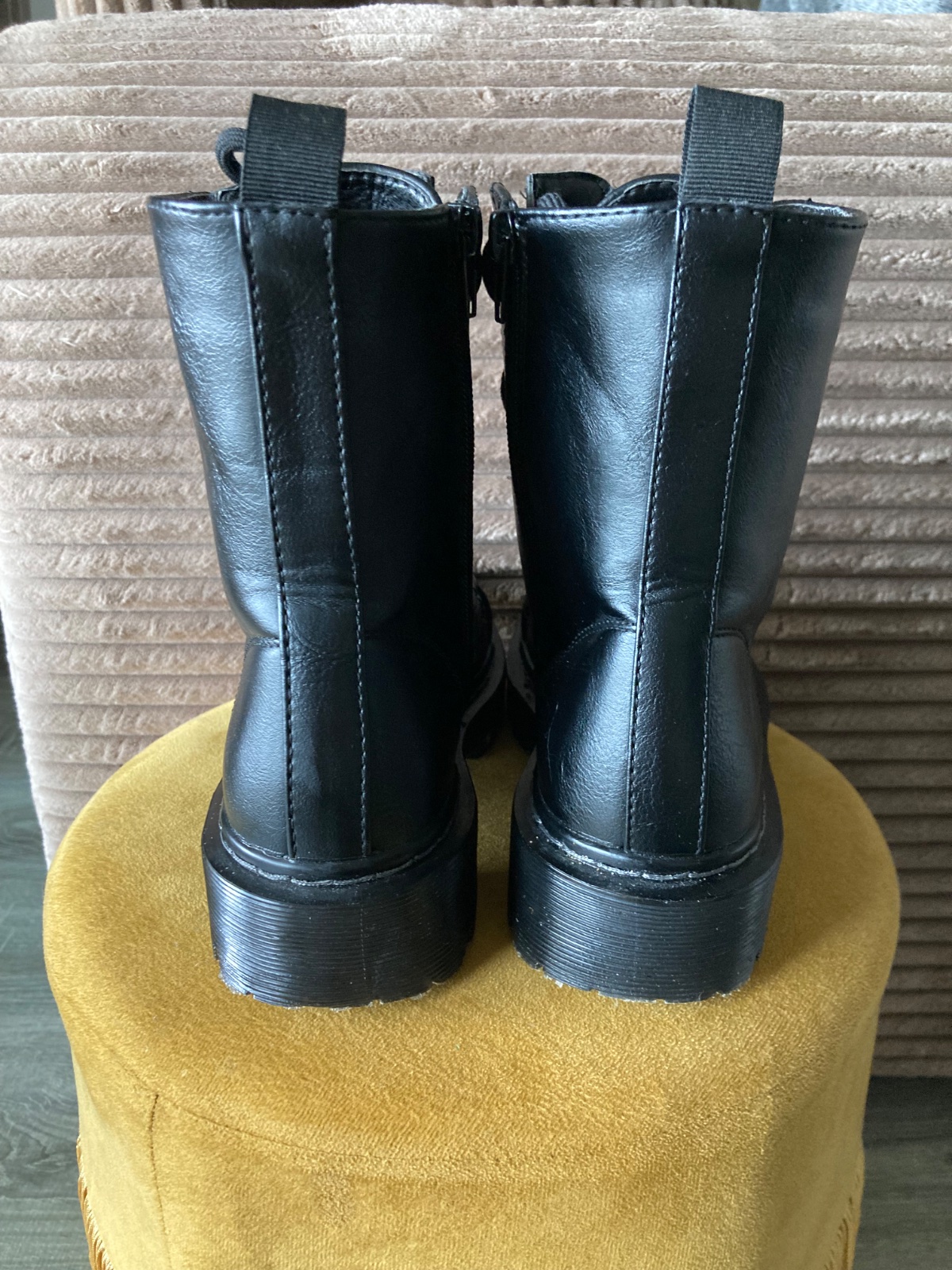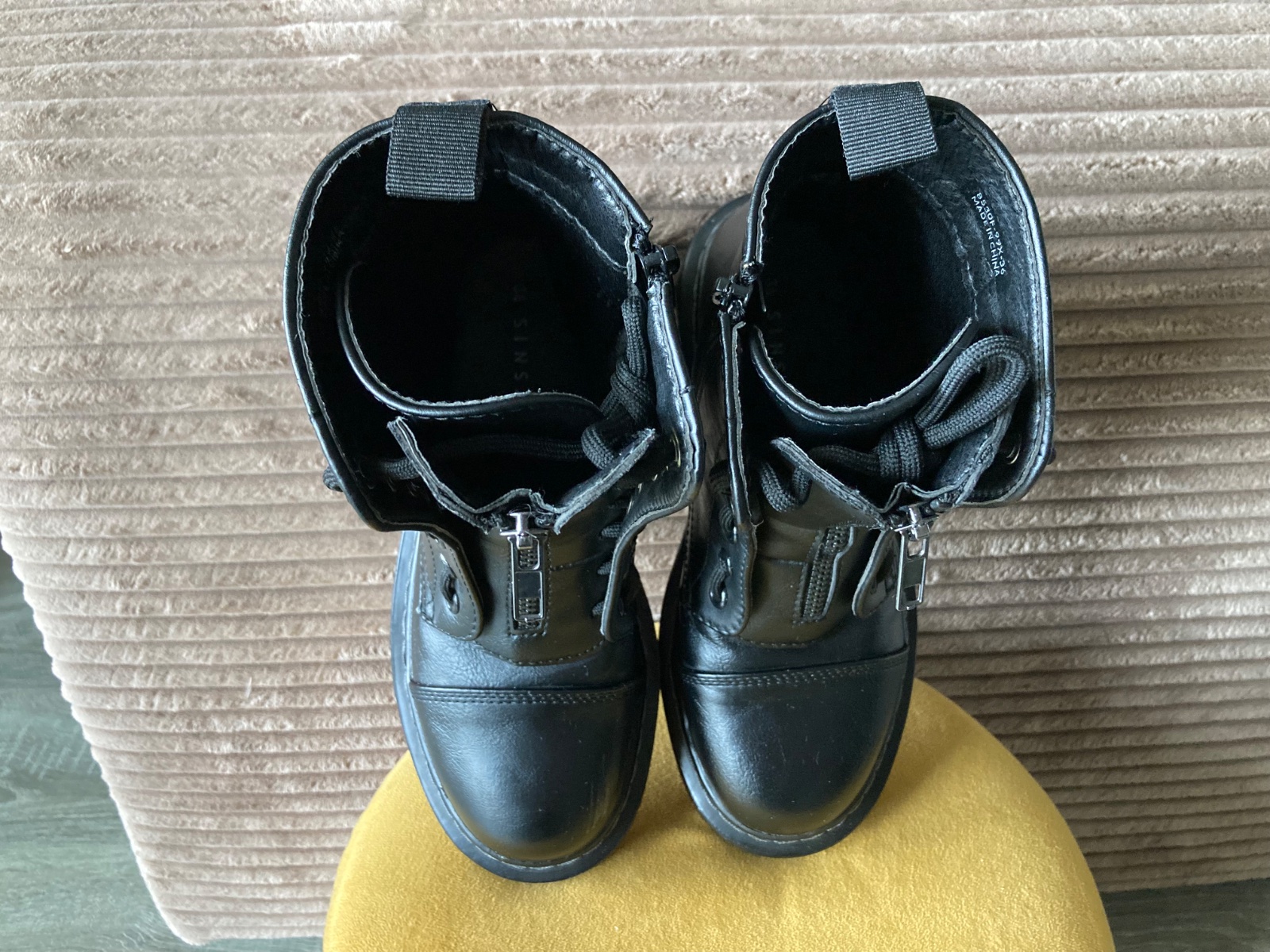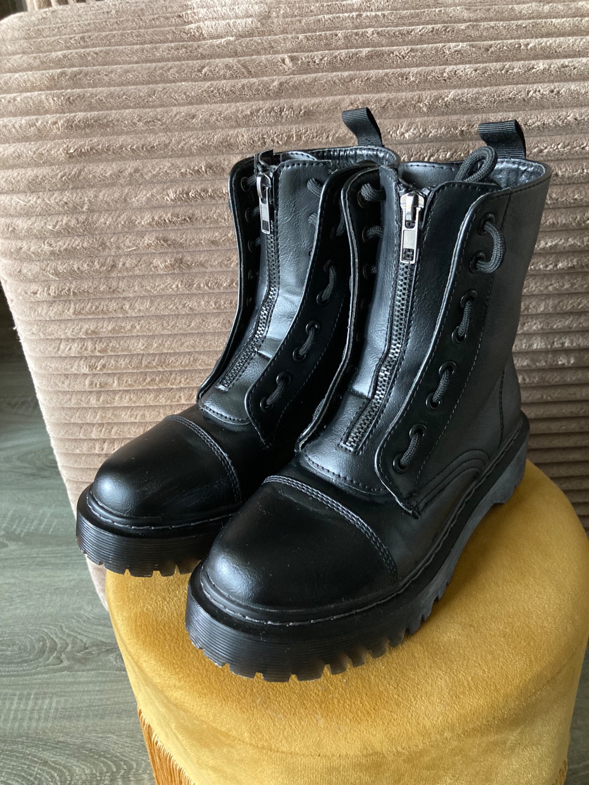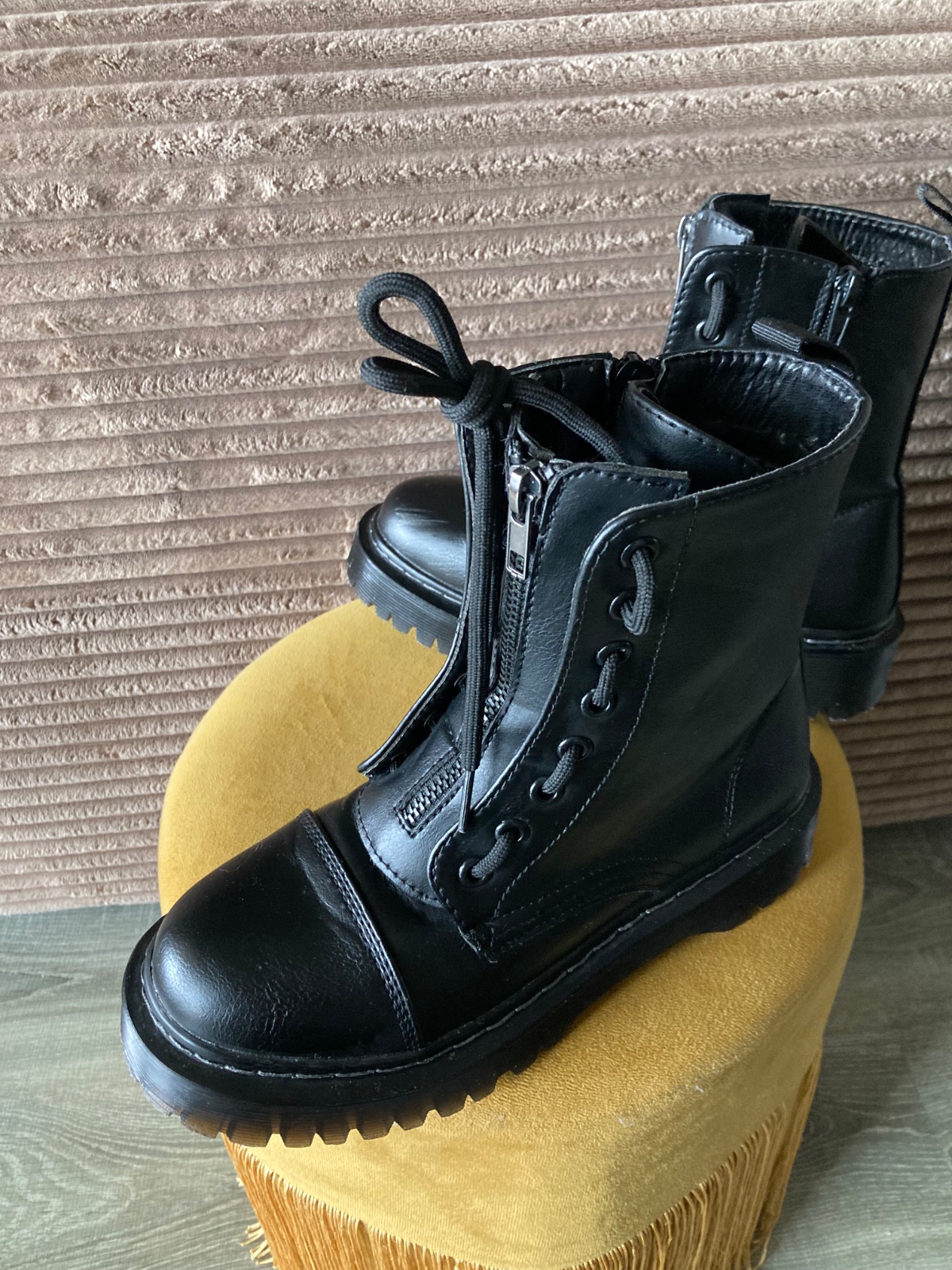 veľmi pekný stav, krásne bez poškodení, málo nosené, na šnúrky, na boku a vpredu zips, podrážka nepoškodená, len na jednej topáke vpredu ošuchy, štýlové, my sme mali šnúrky nezaviazané tak ako na fotkách, môžu sa aj navliecť klasicky