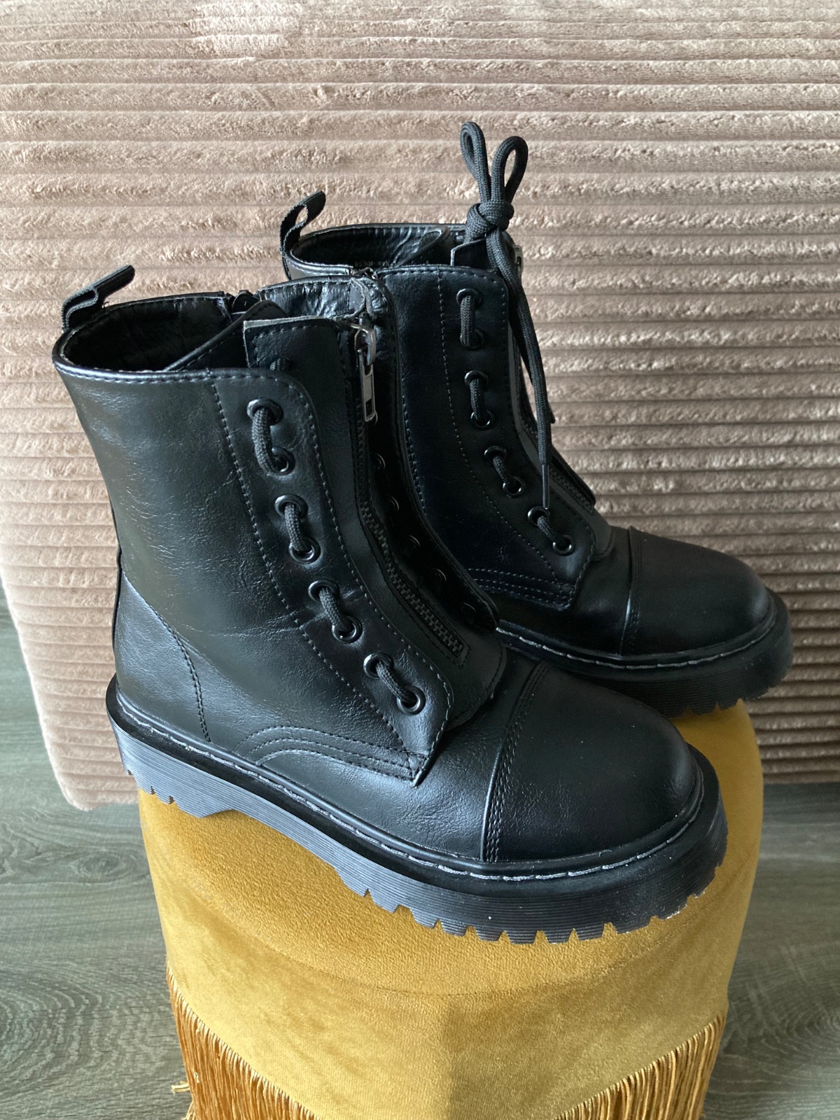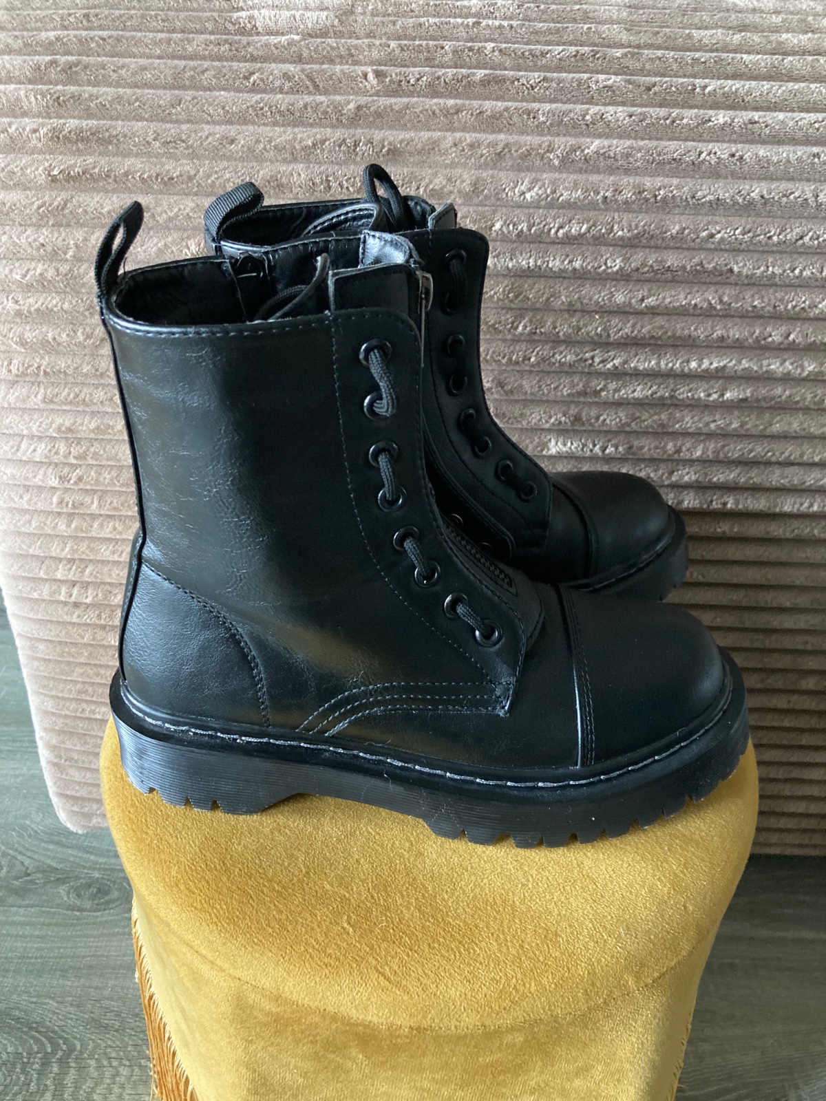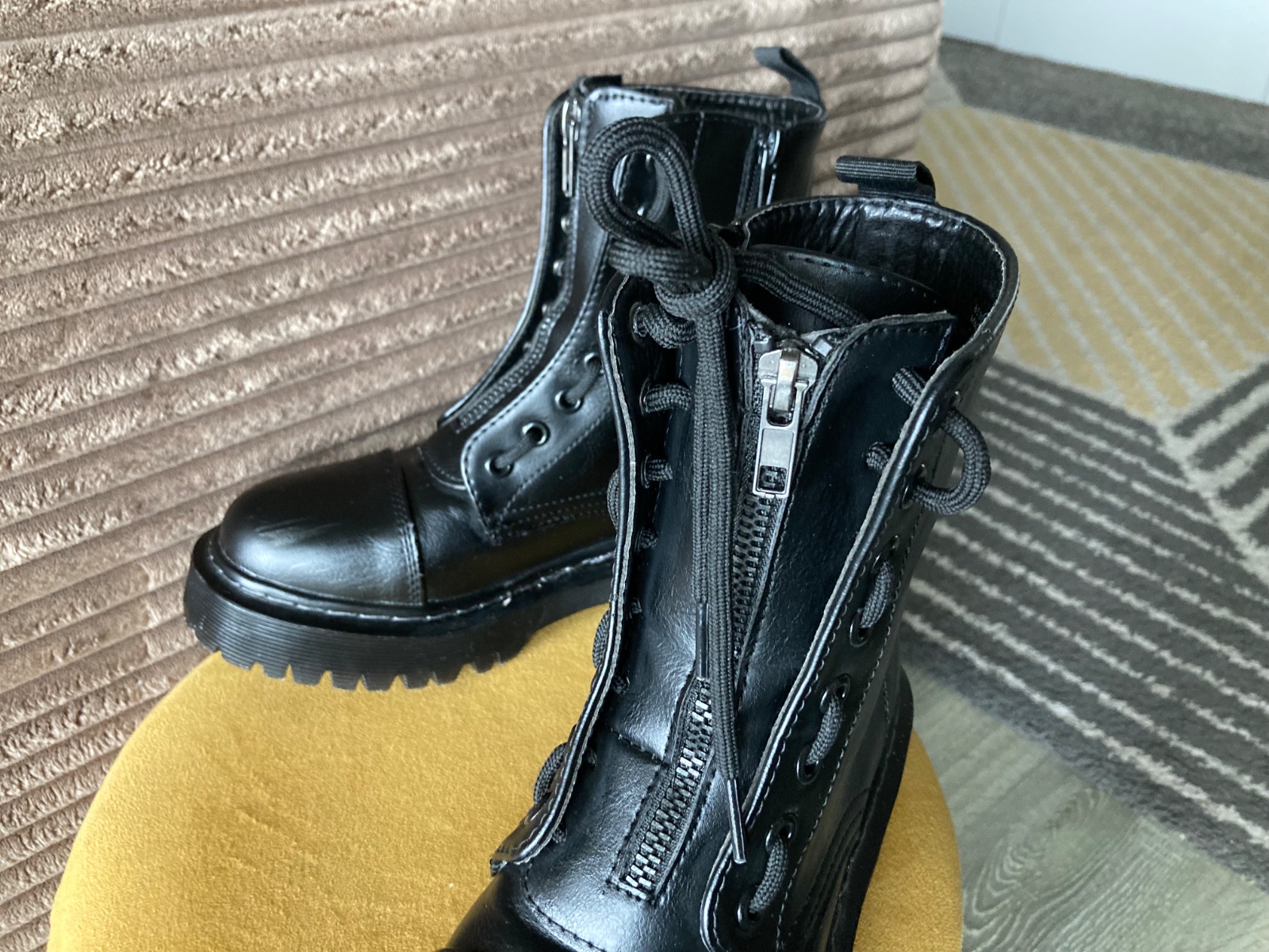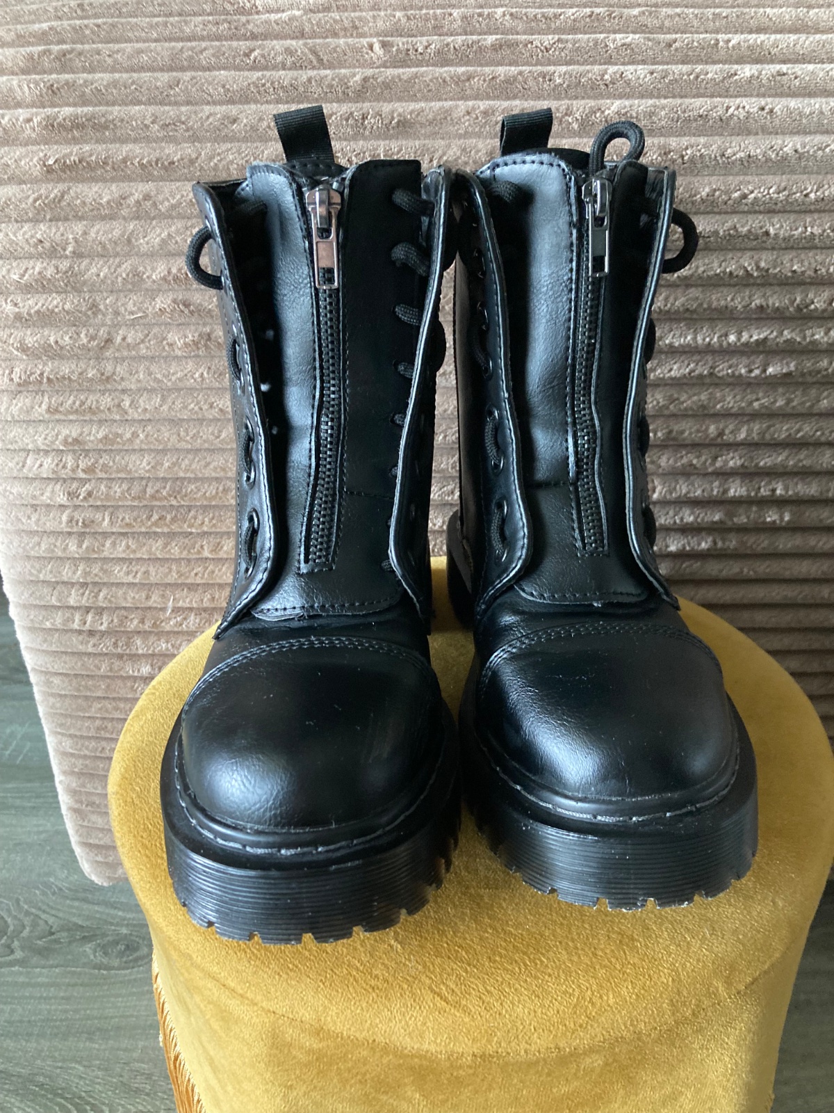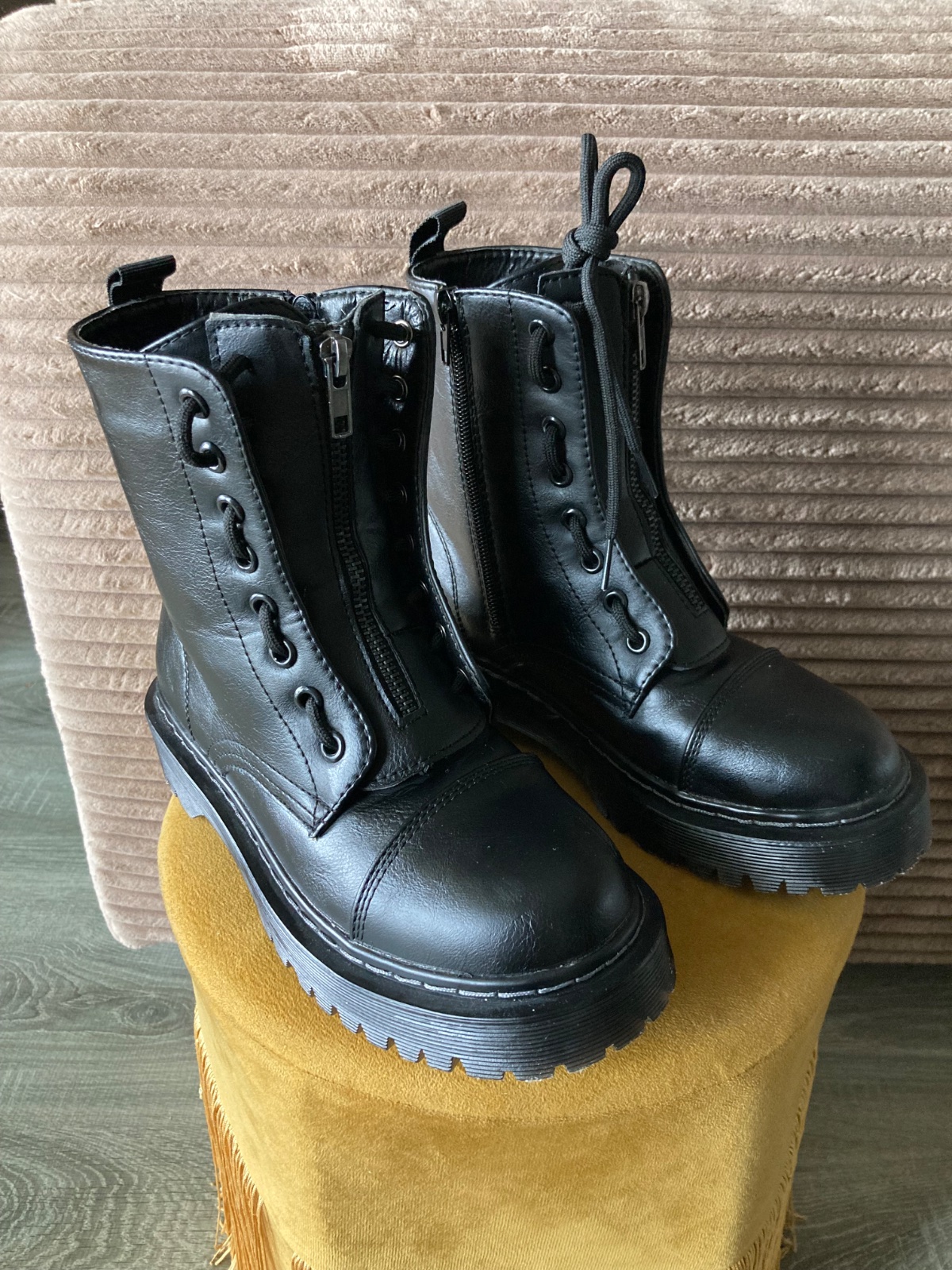 veľmi pekný stav, krásne bez poškodení, málo nosené, na šnúrky, na boku a vpredu zips, podrážka nepoškodená, len na jednej topáke vpredu ošuchy, štýlové, my sme mali šnúrky nezaviazané tak ako na fotkách, môžu sa aj navliecť klasicky