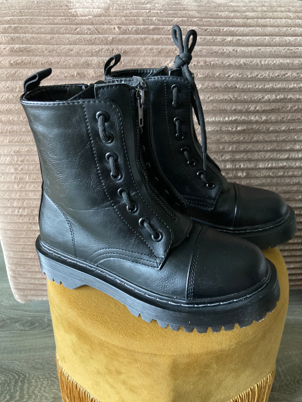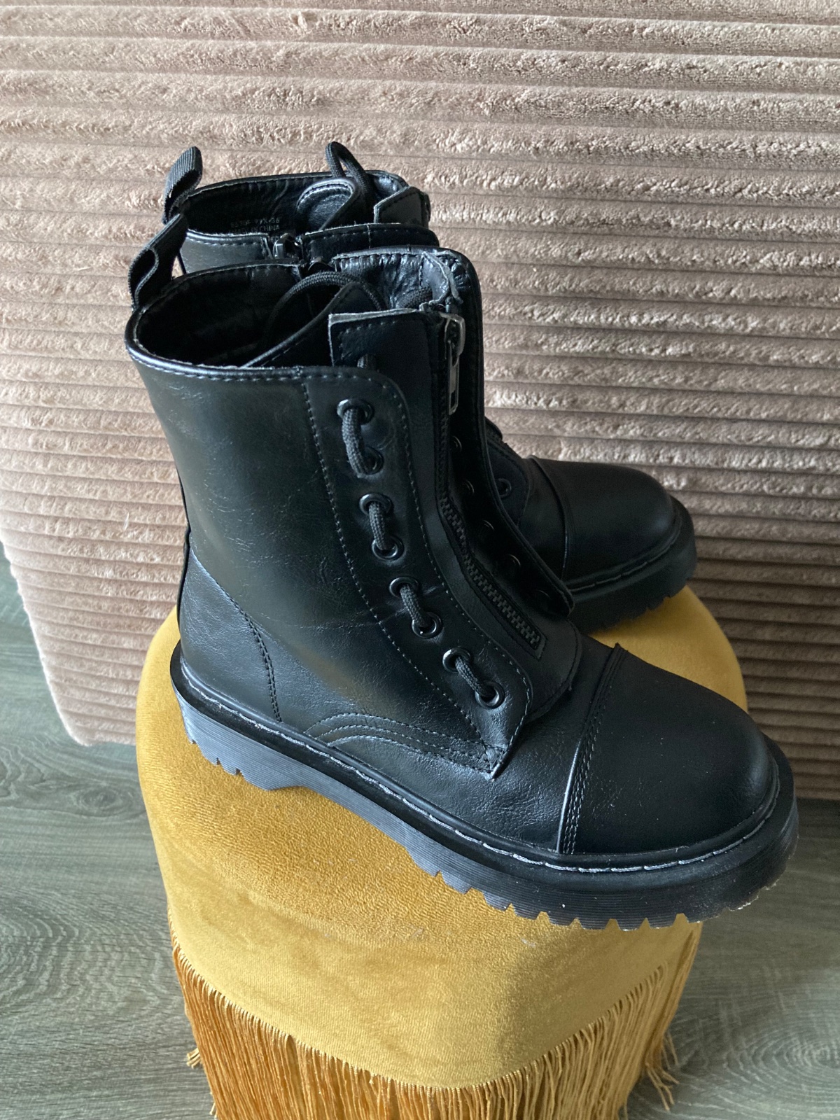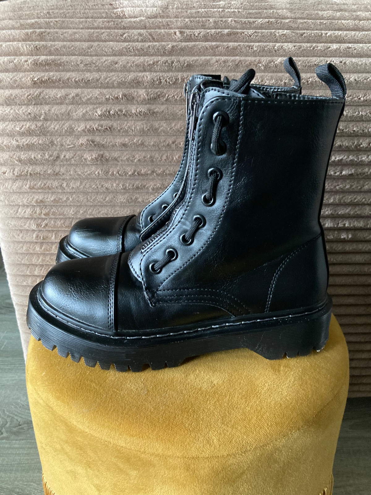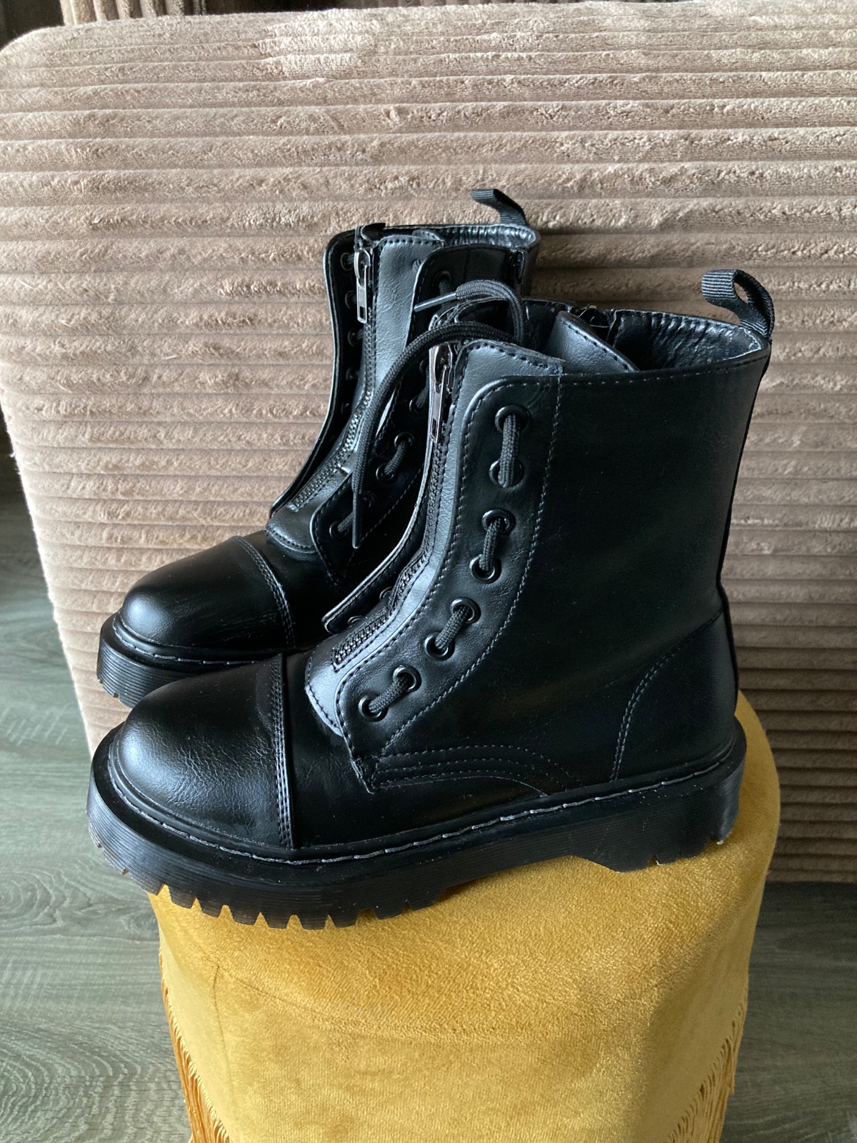 veľmi pekný stav, krásne bez poškodení, málo nosené, na šnúrky, na boku a vpredu zips, podrážka nepoškodená, len na jednej topáke vpredu ošuchy, štýlové, my sme mali šnúrky nezaviazané tak ako na fotkách, môžu sa aj navliecť klasicky