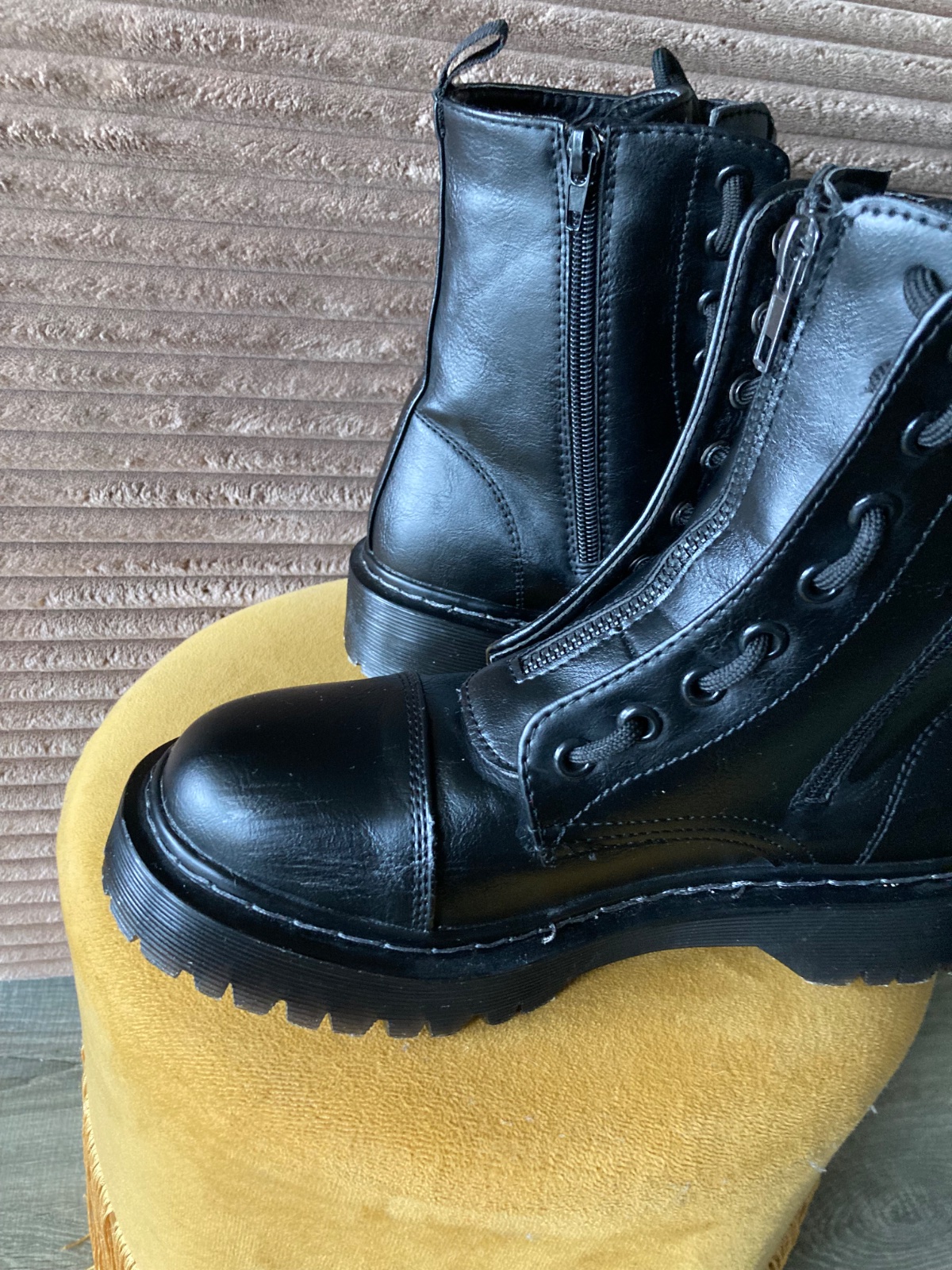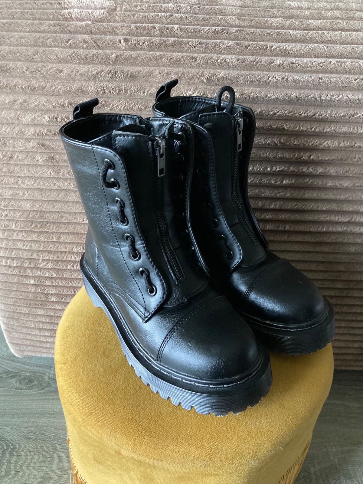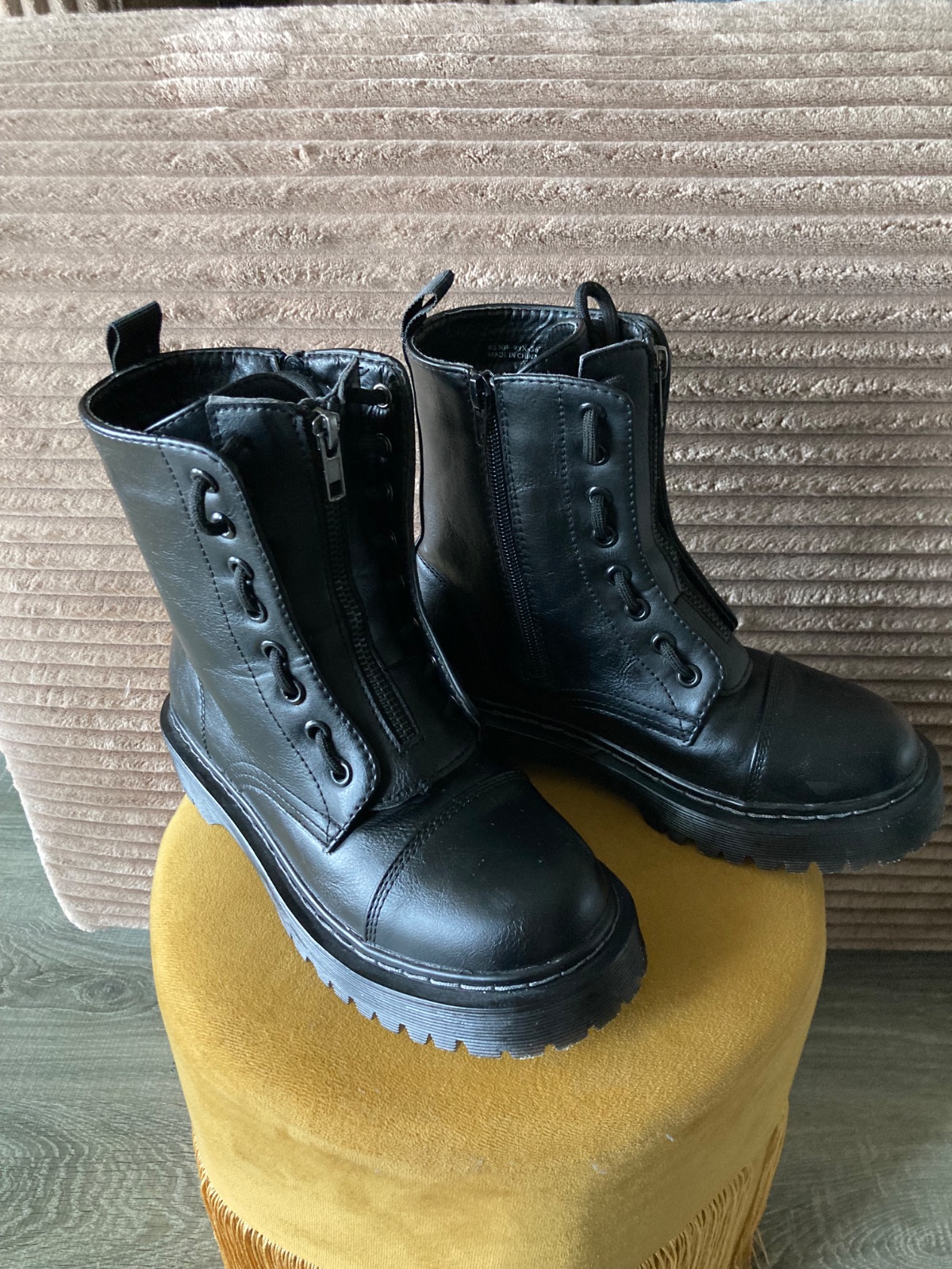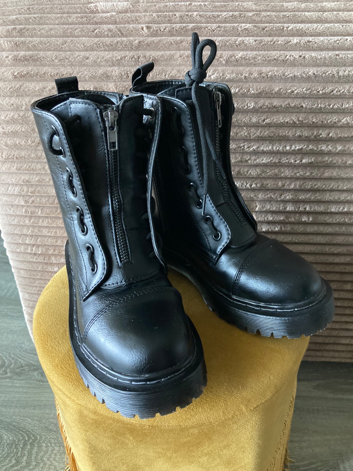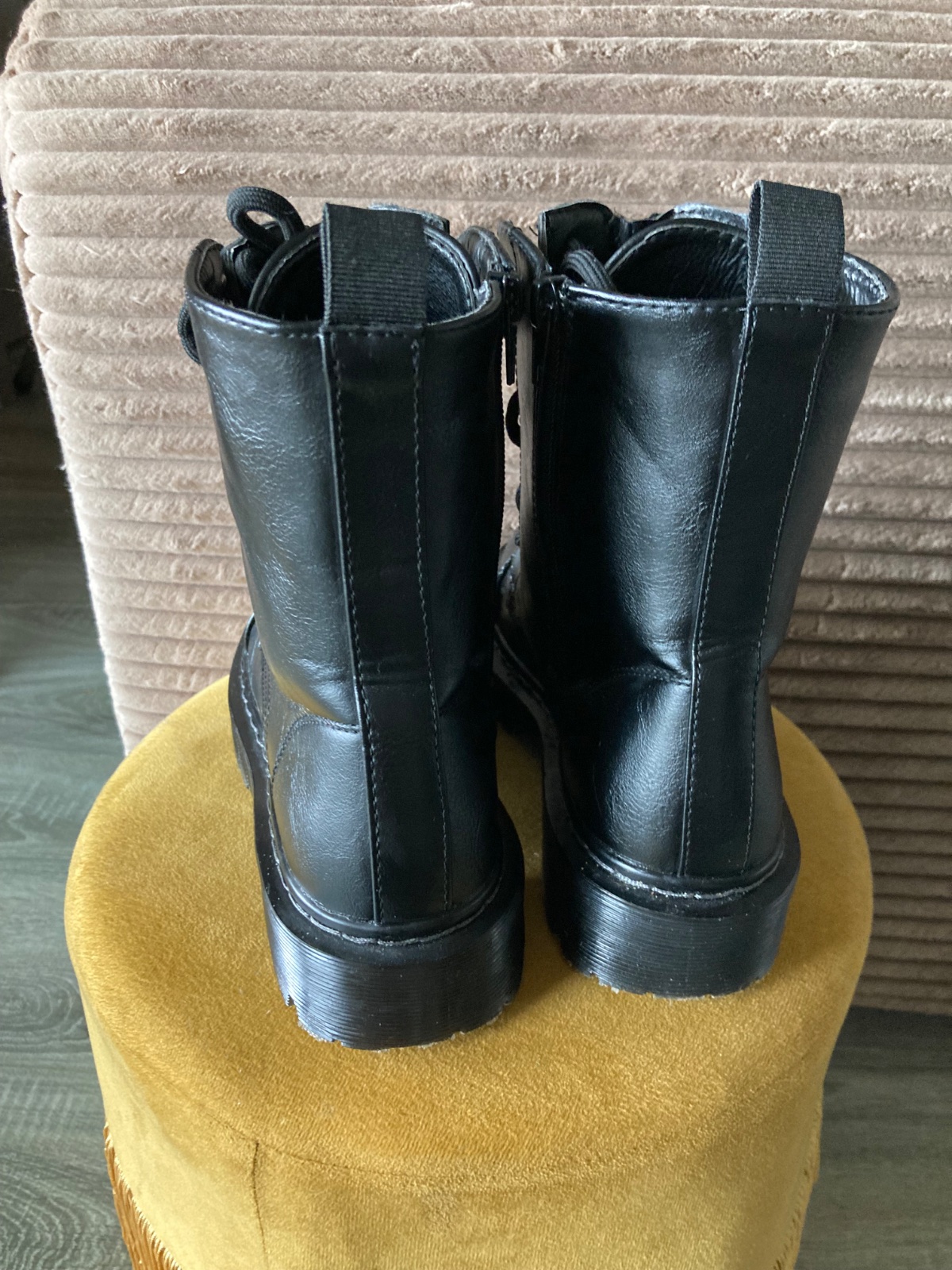 veľmi pekný stav, krásne bez poškodení, málo nosené, na šnúrky, na boku a vpredu zips, podrážka nepoškodená, len na jednej topáke vpredu ošuchy, štýlové, my sme mali šnúrky nezaviazané tak ako na fotkách, môžu sa aj navliecť klasicky