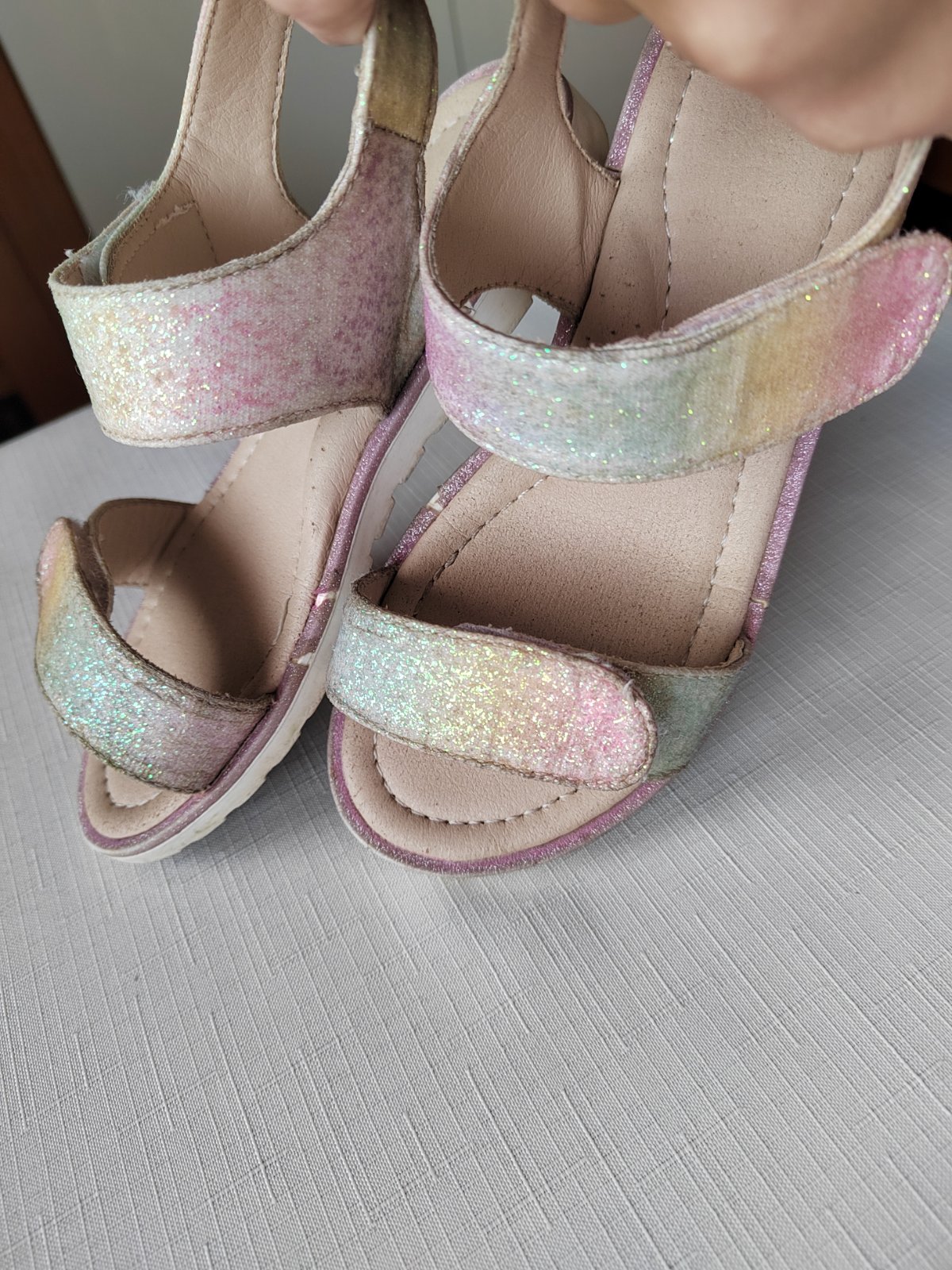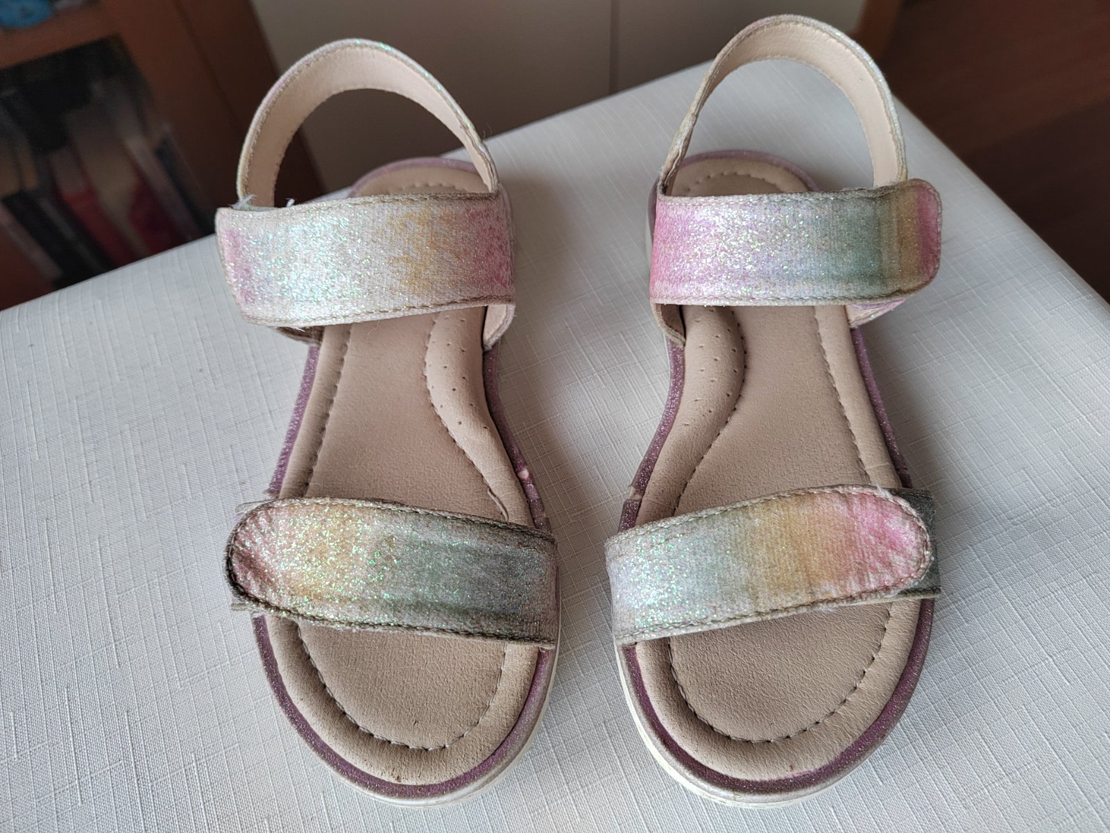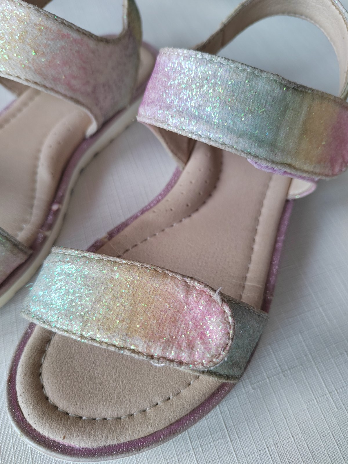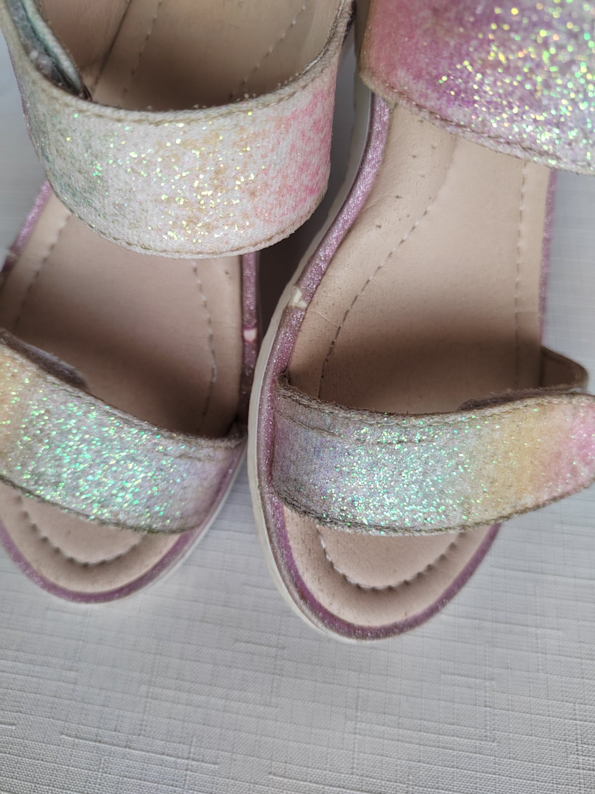 Žiadne poškodenie, len trošku odlúpené trblietky po obvode sandálok (viď. posledná foto)