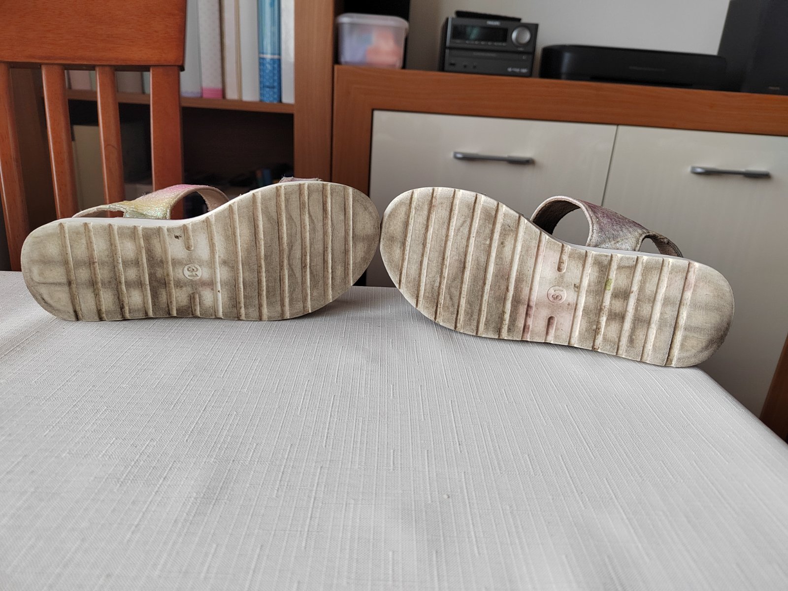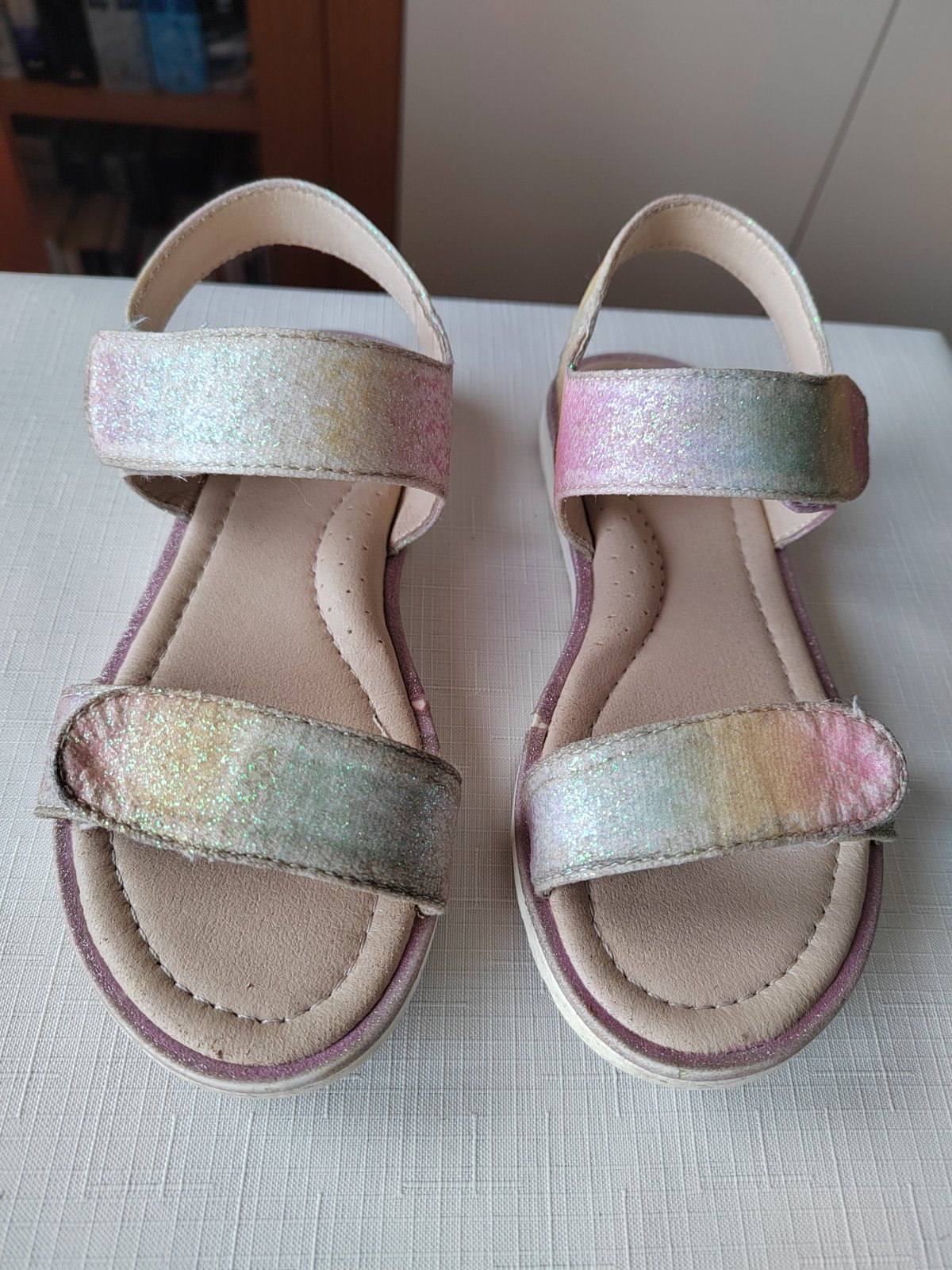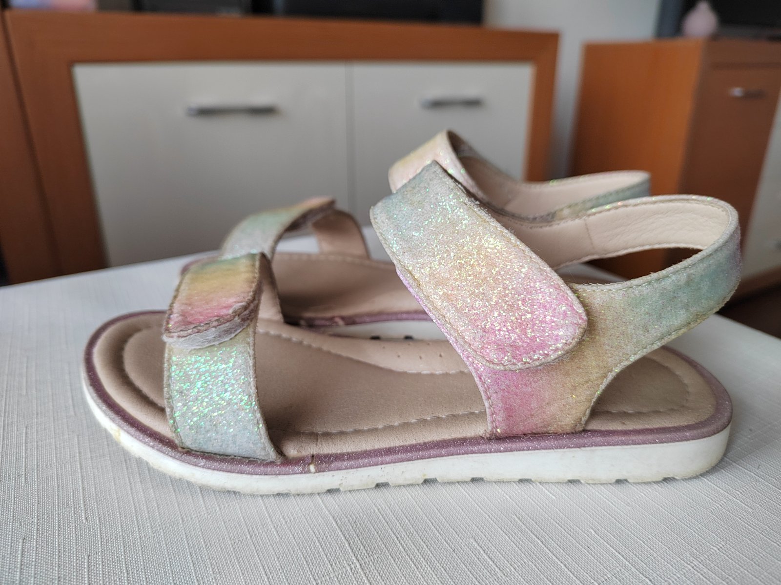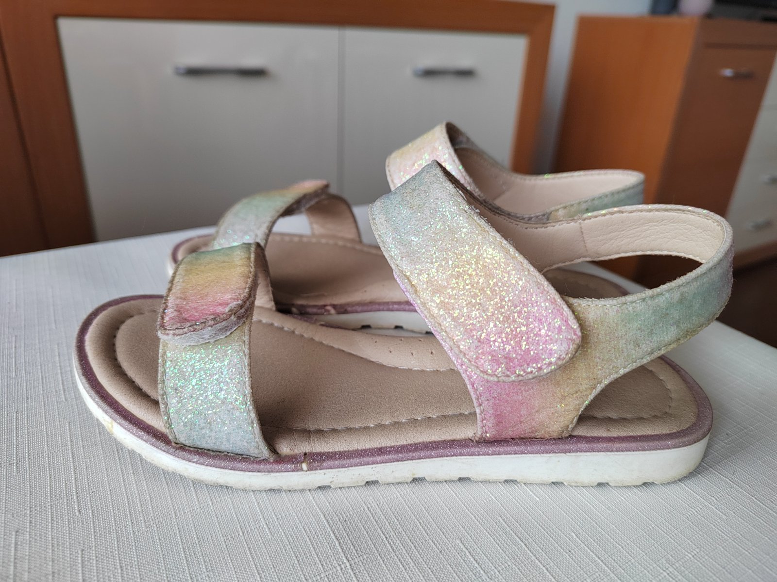 Žiadne poškodenie, len trošku odlúpené trblietky po obvode sandálok (viď. posledná foto)