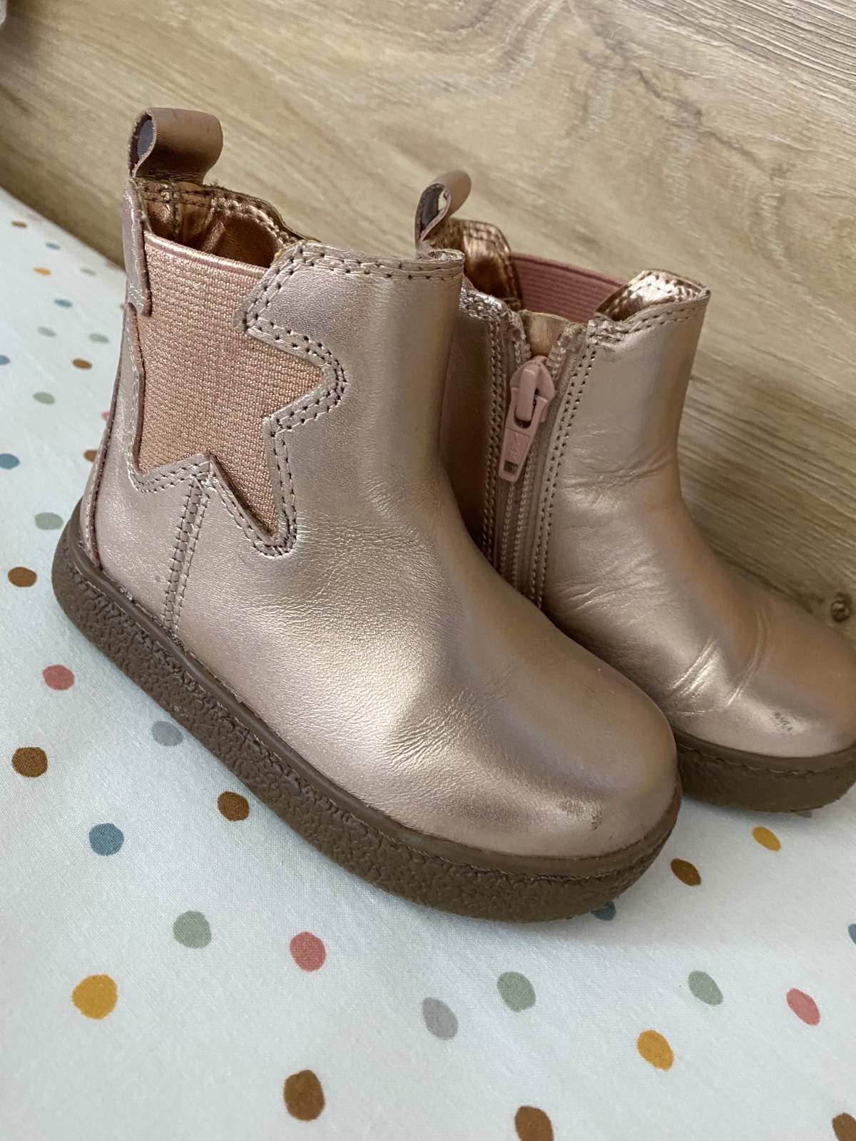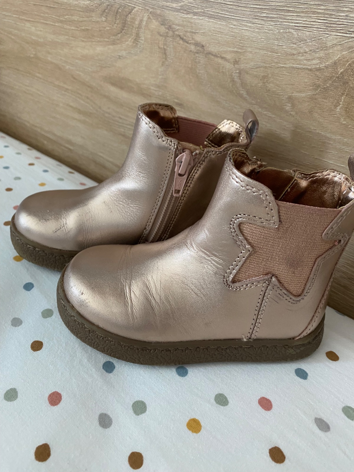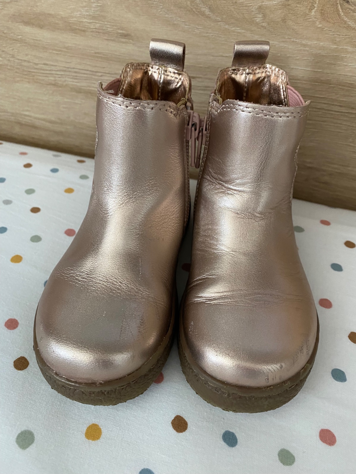 Dievčenské metalické prechodné čižmy, vo farbe staroružová. Veľkosť 23, VD 14,5 cm.