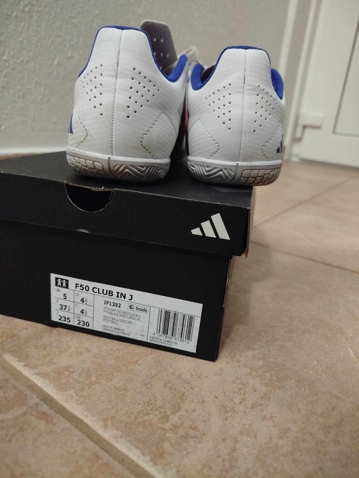 Predam parkrat obute kozene halovky vhodne pre dievca i chlapca. Kombinacia farieb bielej a tmavomodrej so zlatymi adidas ciarami. Velkost to je 36 2/3.