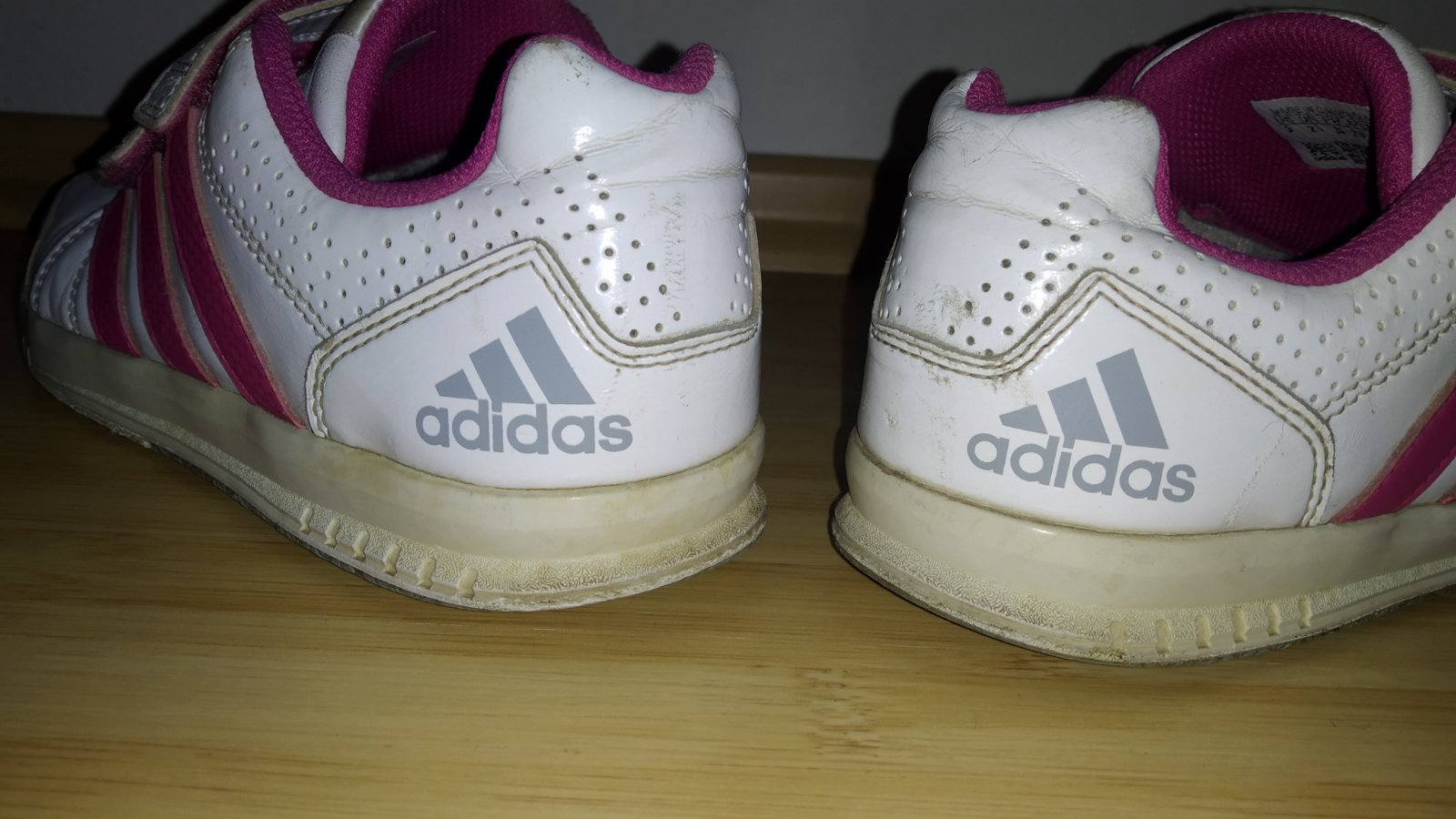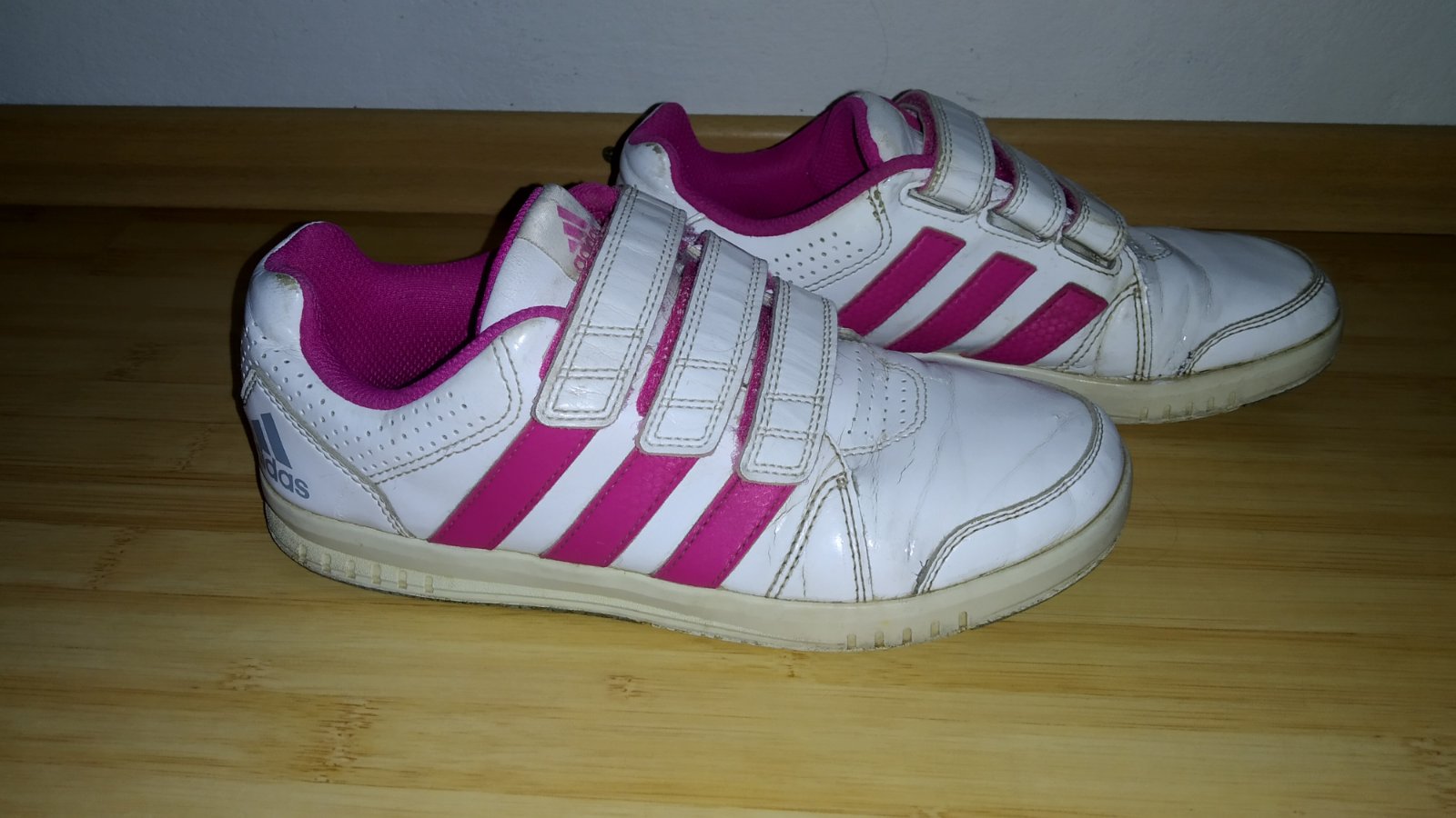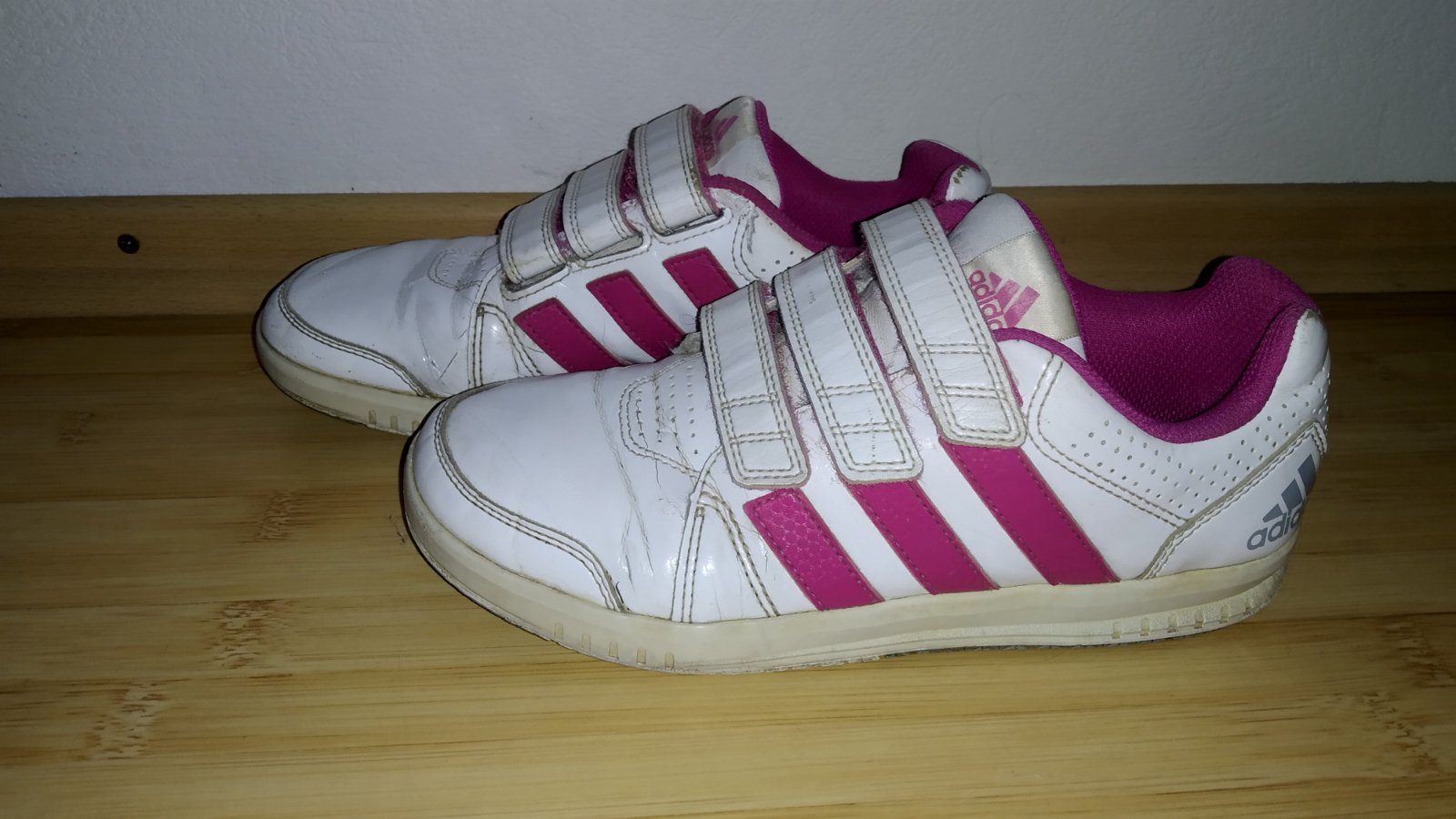 Dievčenské, adidas botasky. Kupované v obchode. Sú zachovalé z vonkajšej strany bez poškodenia. Akurát v zadných vnútorných stranách na pätách ošúchané /fotka/. Pri obutí to nevidno.