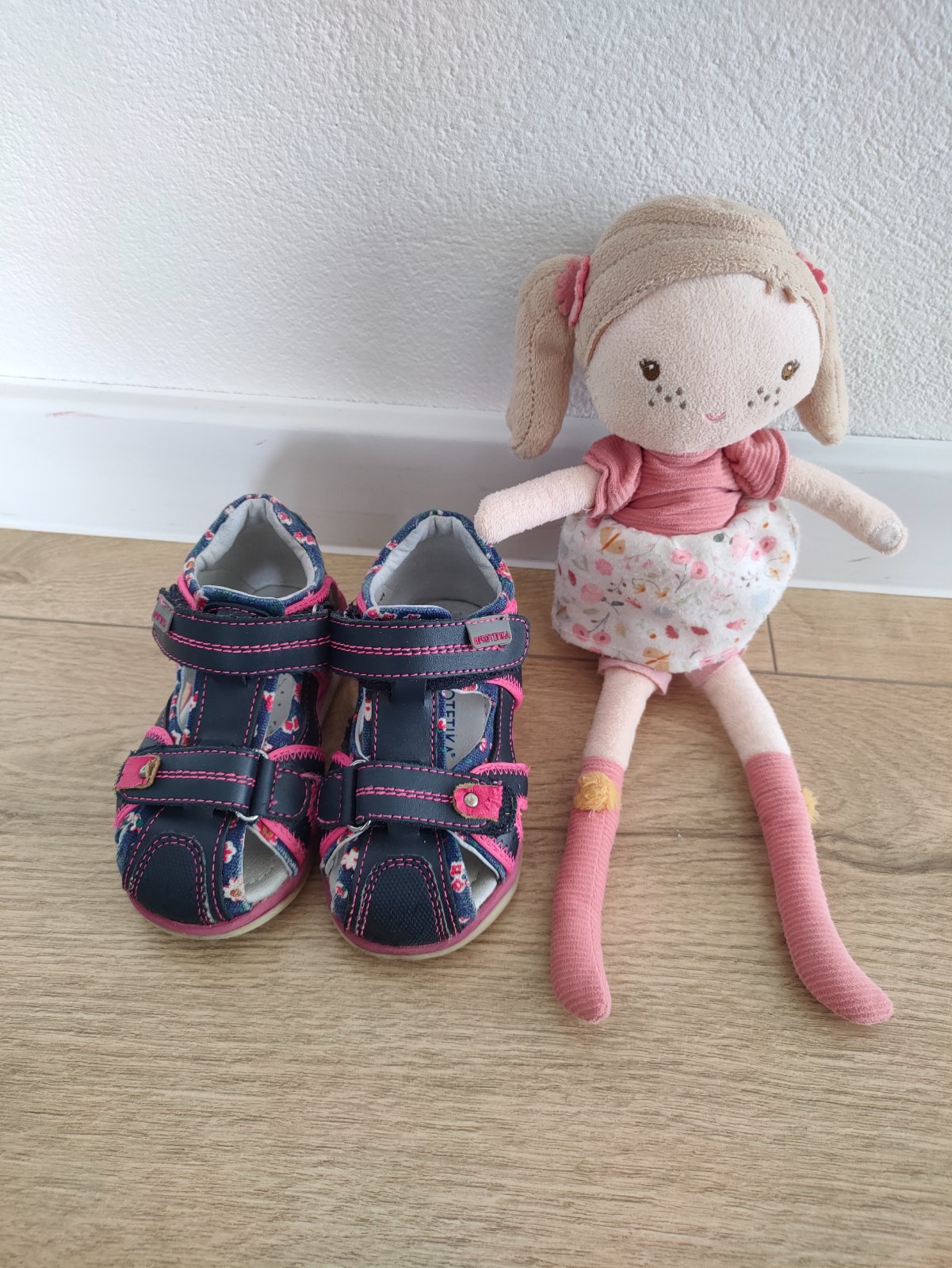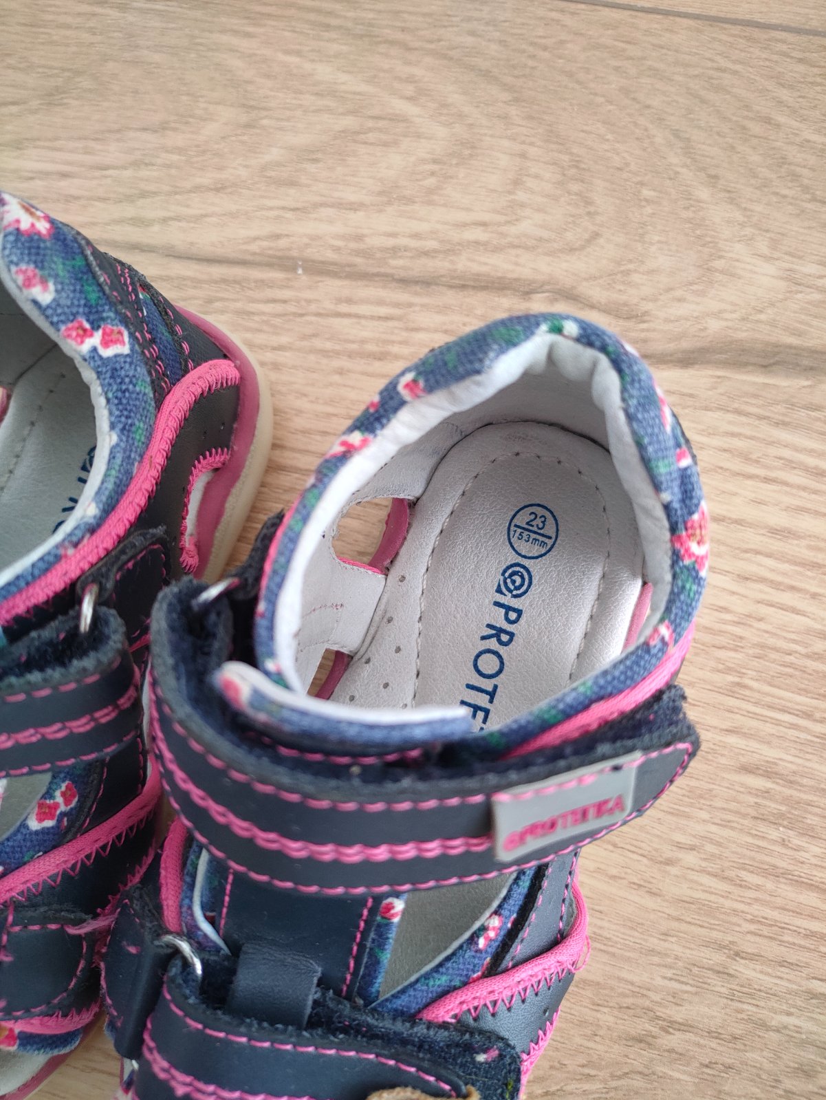 Sandále značky PROTETIKA, veľkosť 23. V dobrom stave, nosené len ako papučky do škôlky, plne funkčné. V prípade záujmu môžem premerať aj dĺžku vnútornej stielky.