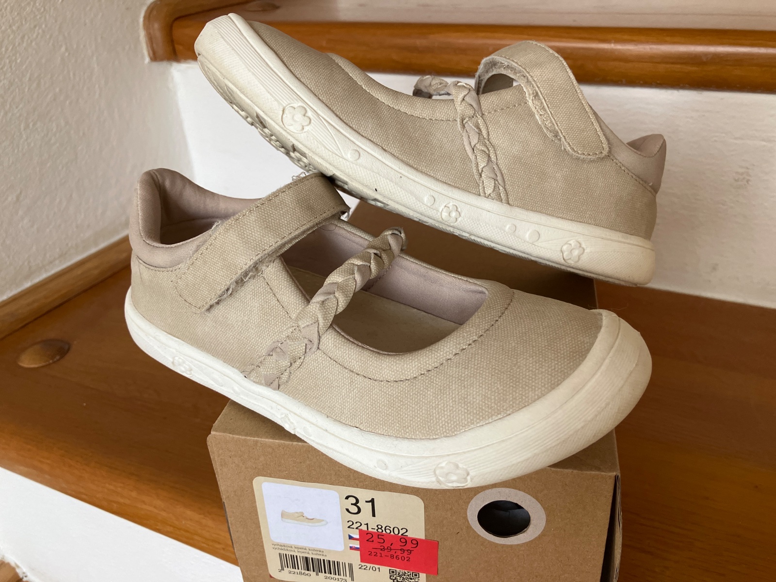 Balerínky s vyššou gumou na prstoch, takze vôbec nie sú okopané. Výborný stav, málo nosené. Na koženke je jemná zaujímavá potlač, na prvý pohľad vyzerajú ako textilné.