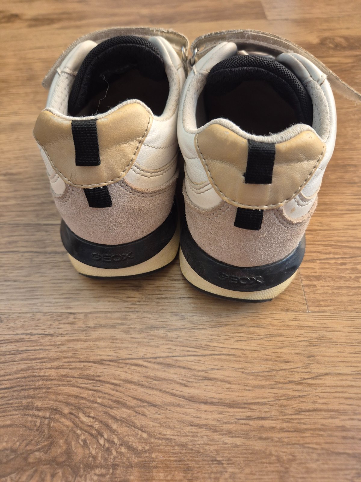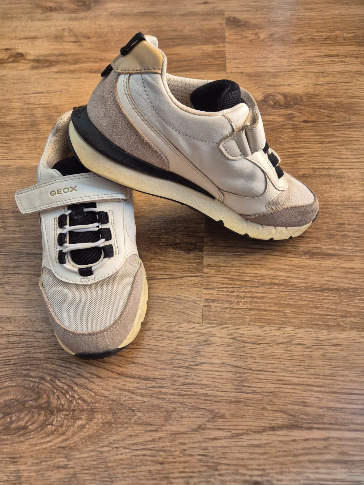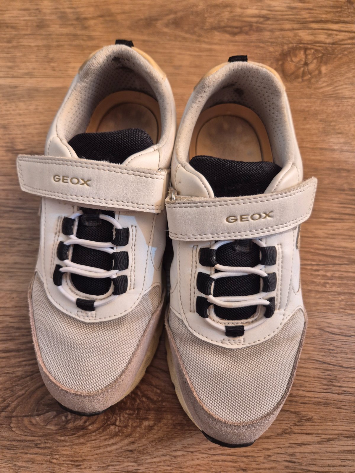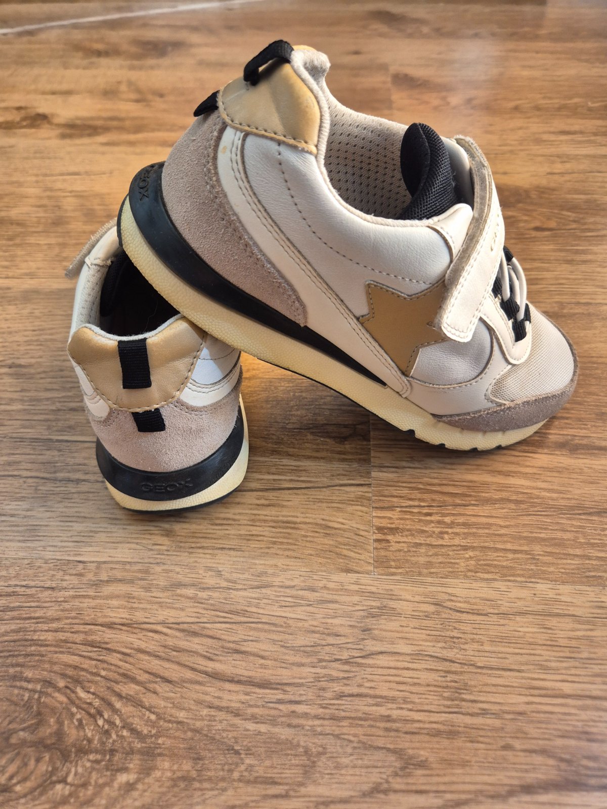 Tenisky Geox biele v kombinácii s čiernou a zlatou, málo nosené, zachovalé bez odretia a zosliapanej podrážky,