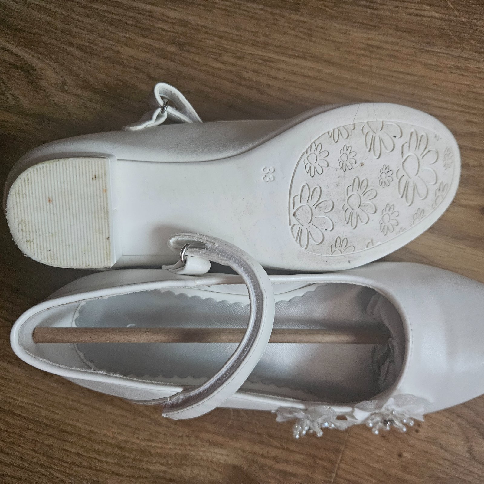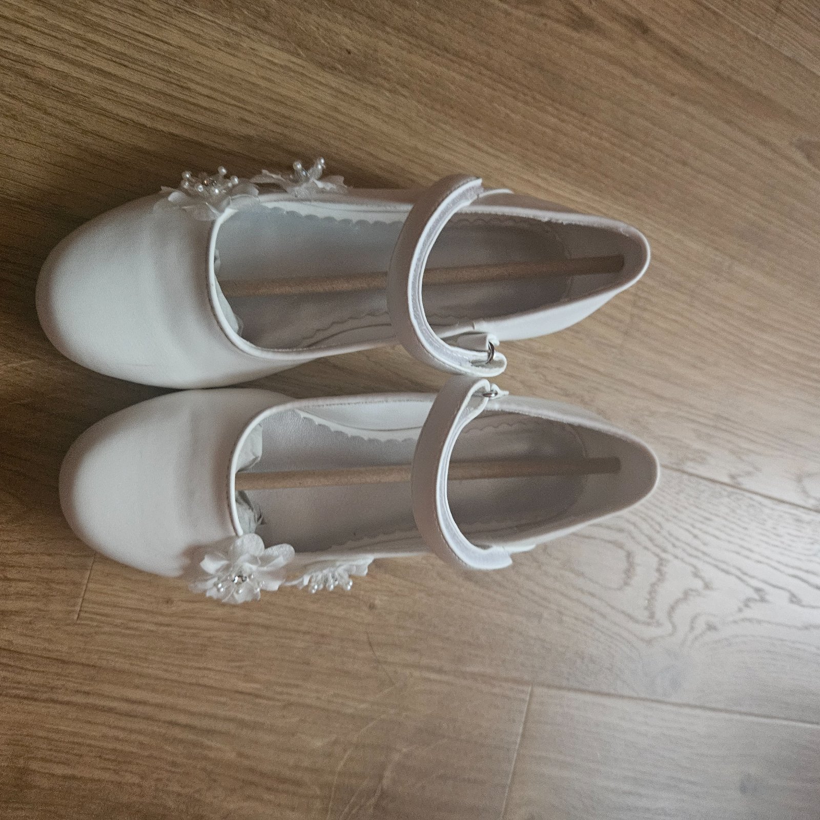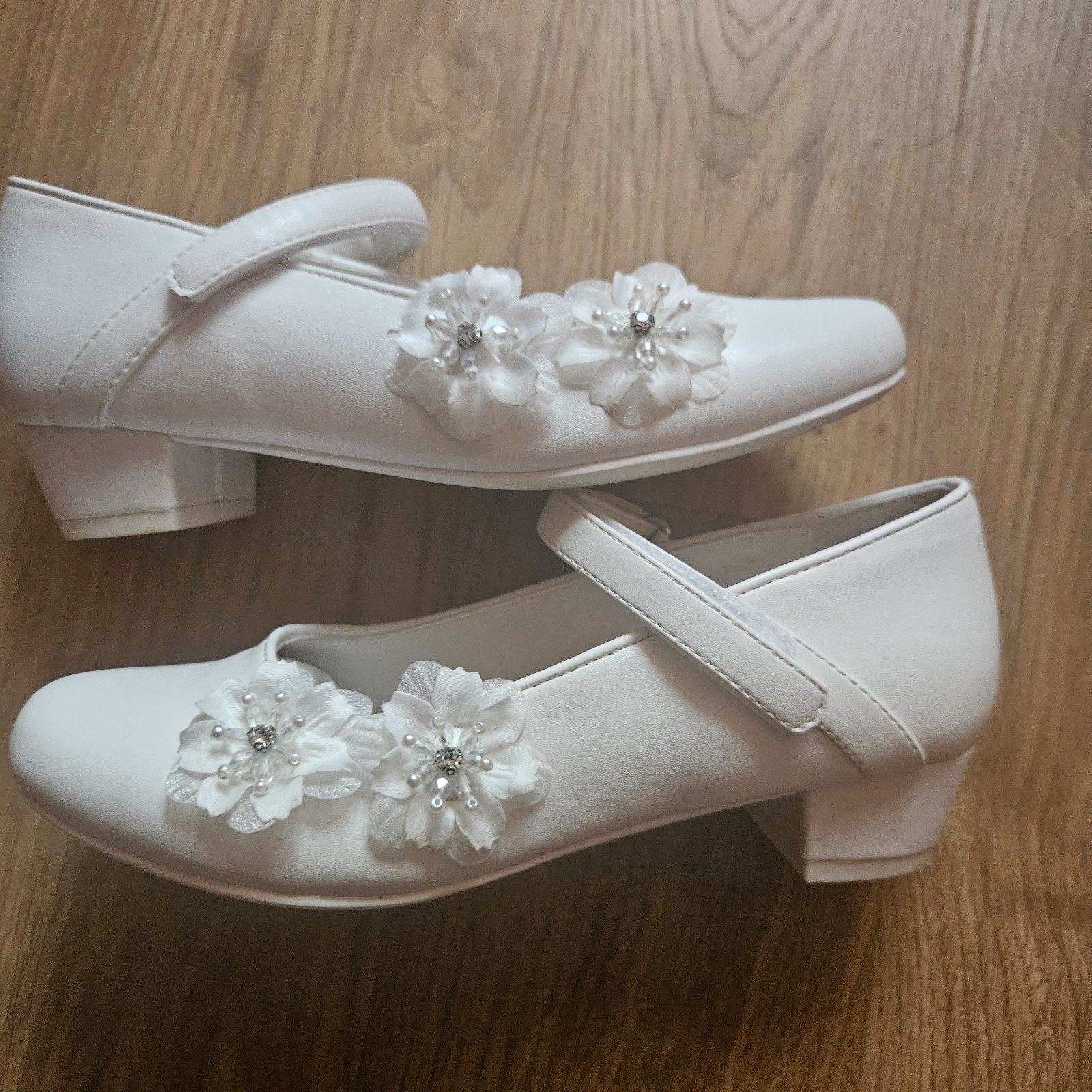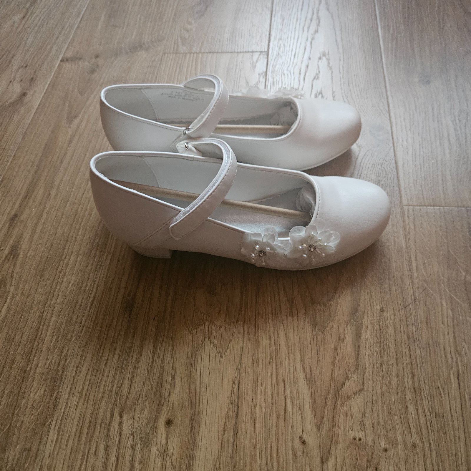 Biele dievcenske lodicky s malym opatkom a kvetinovou ozdobou. Velkost 22, dlzka 21 cm. Vhodne na 1.sv.prijimanie.