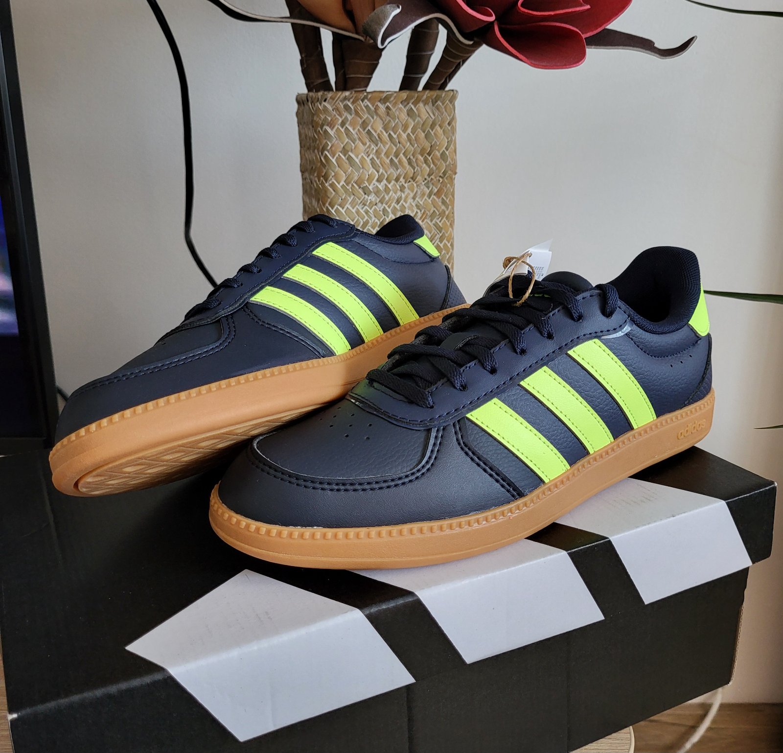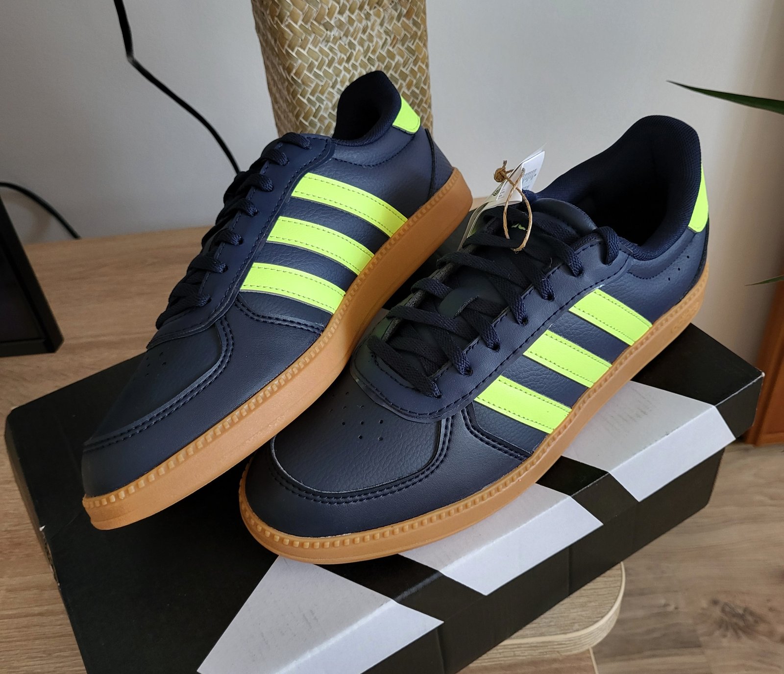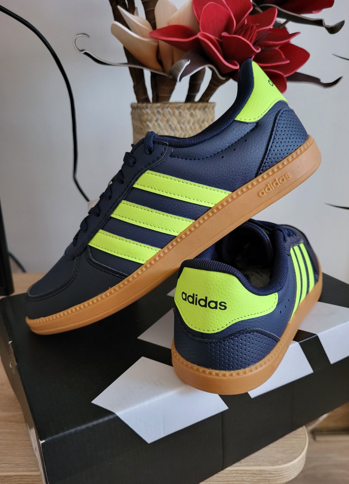 Adidas Breaknet Sleek (model JQ8265) dámske lifestylové tenisky v tmavomodrom prevedení, ktoré kombinujú retro tenisový štýl s modernou eleganciou, farebná kombinácia Legend Ink /Hi-Res Yellow / Gum.