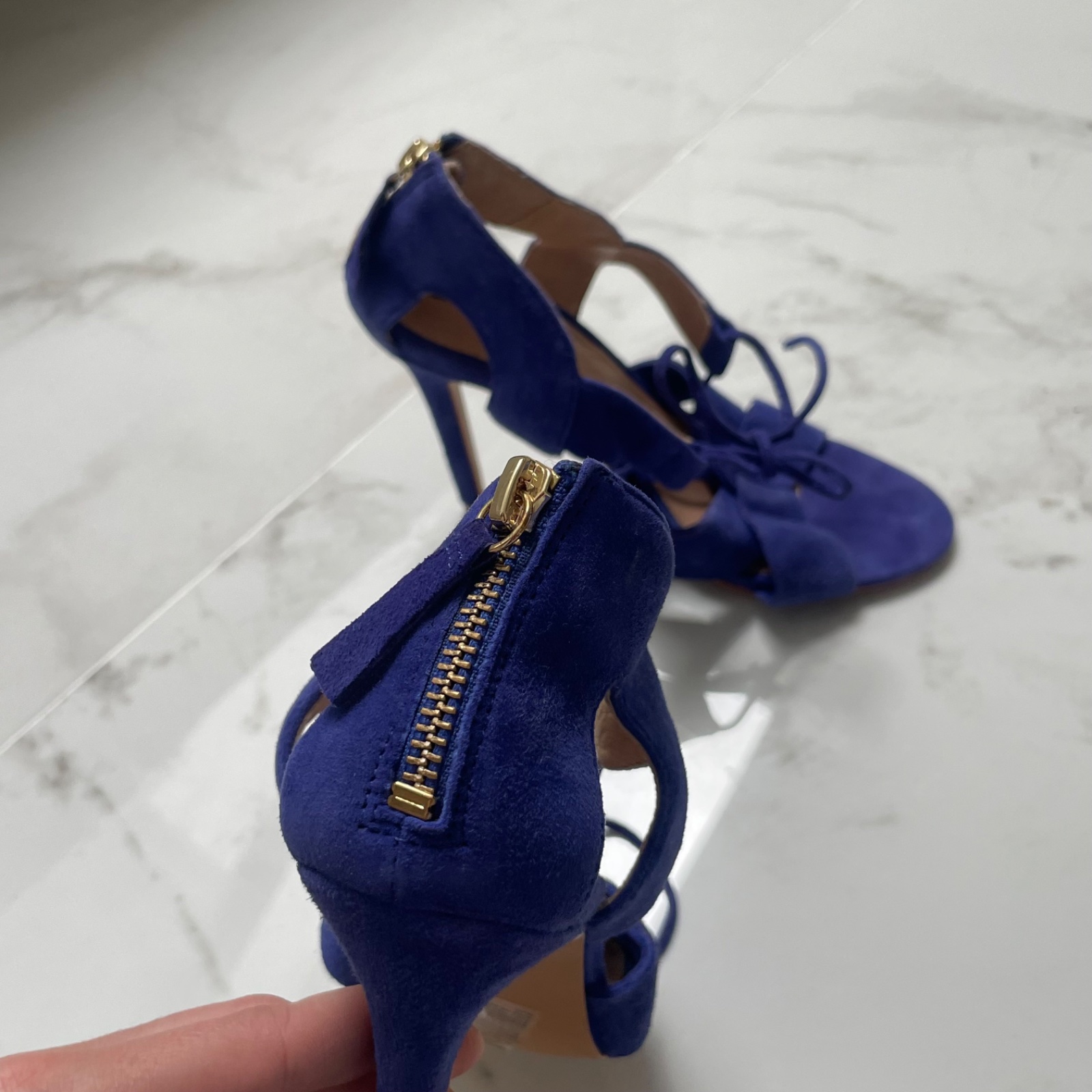 Absolútne výnimočné sandále z pravej semišovej kože (REAL SUEDE) v odtieni kráľovskej modrej. Originálny dizajn so šnurovaním, zlatým zipsom na päte a otvorenou špičkou pôsobí elegantne a zároveň veľmi štýlovo.