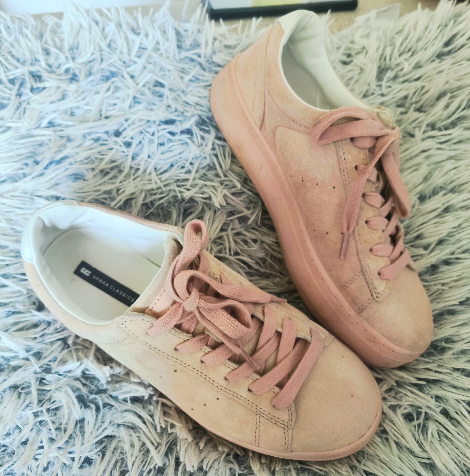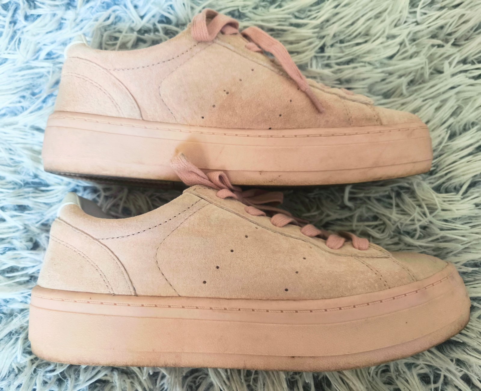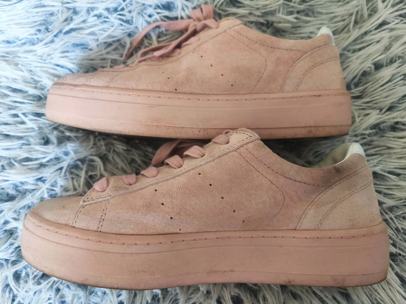 Farba je staroružová nie bledoružová foťák to nevedel zachytiť. Tenisky sú nosené pol roka na striedačku s inými no v dobrom stave . Kúpené na Modivo. Je to brúsená semišková koža . Pôvodne 45€. Vnútorná dĺžka 24,3, písané 38 ale sadnú skôr na 37-37,5