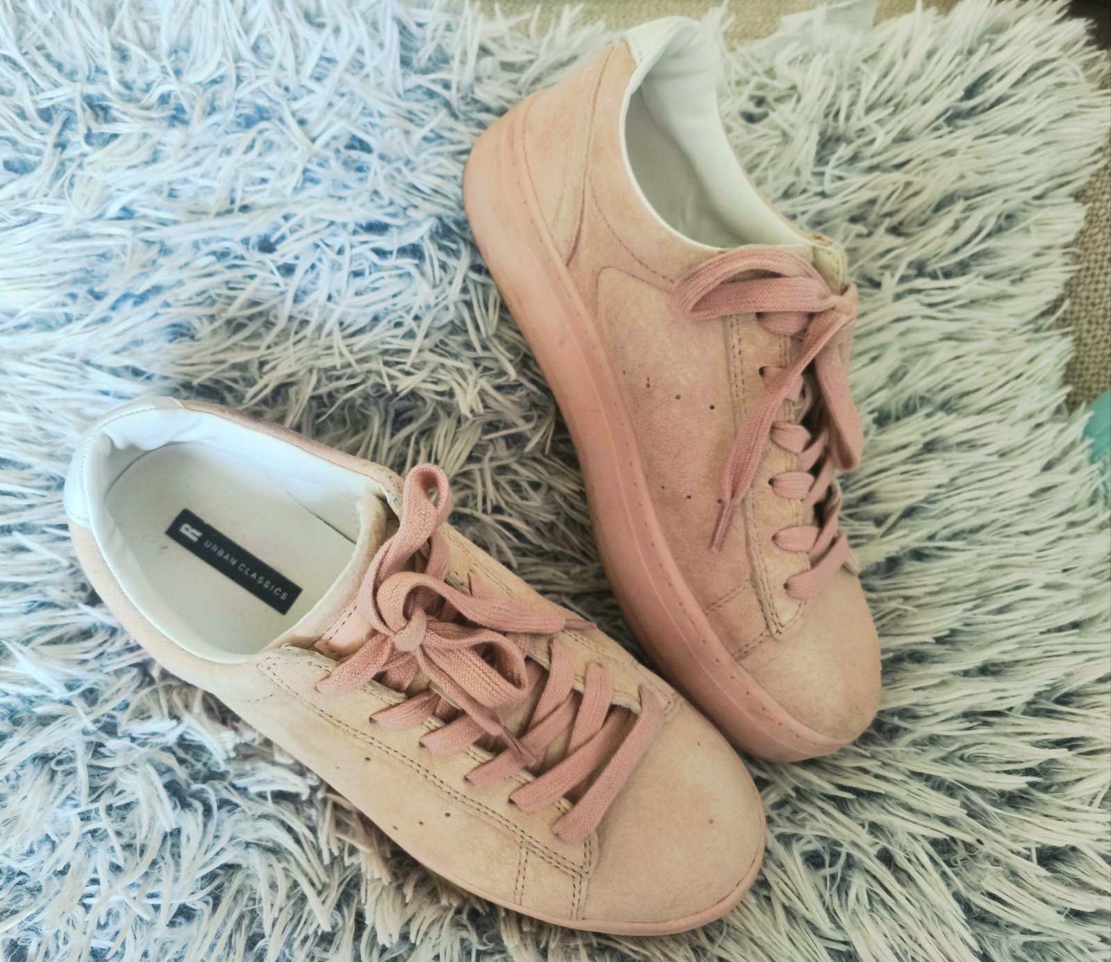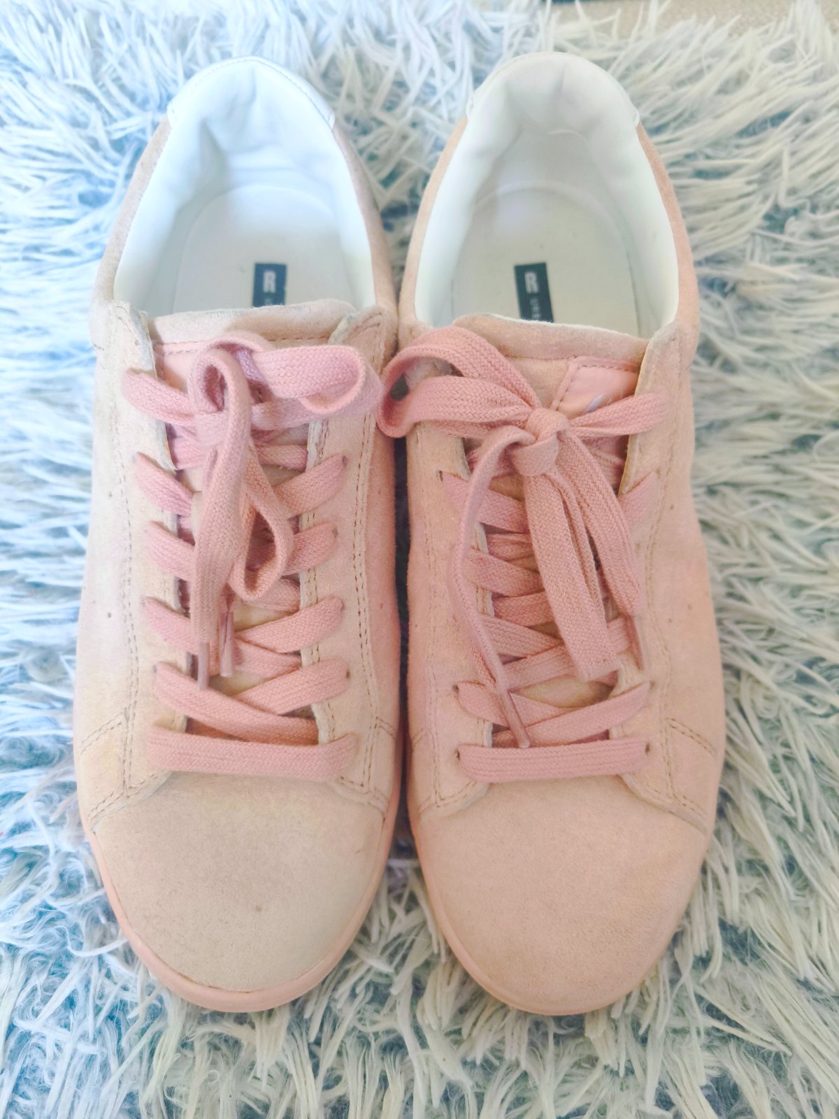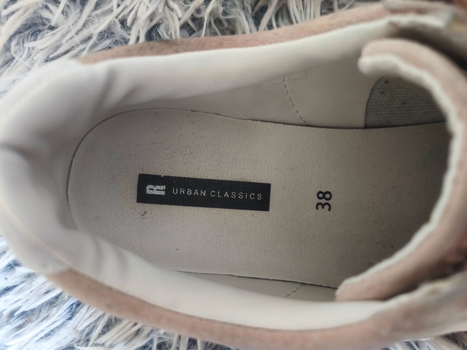 Farba je staroružová nie bledoružová foťák to nevedel zachytiť. Tenisky sú nosené pol roka na striedačku s inými no v dobrom stave . Kúpené na Modivo. Je to brúsená semišková koža . Pôvodne 45€. Vnútorná dĺžka 24,3, písané 38 ale sadnú skôr na 37-37,5