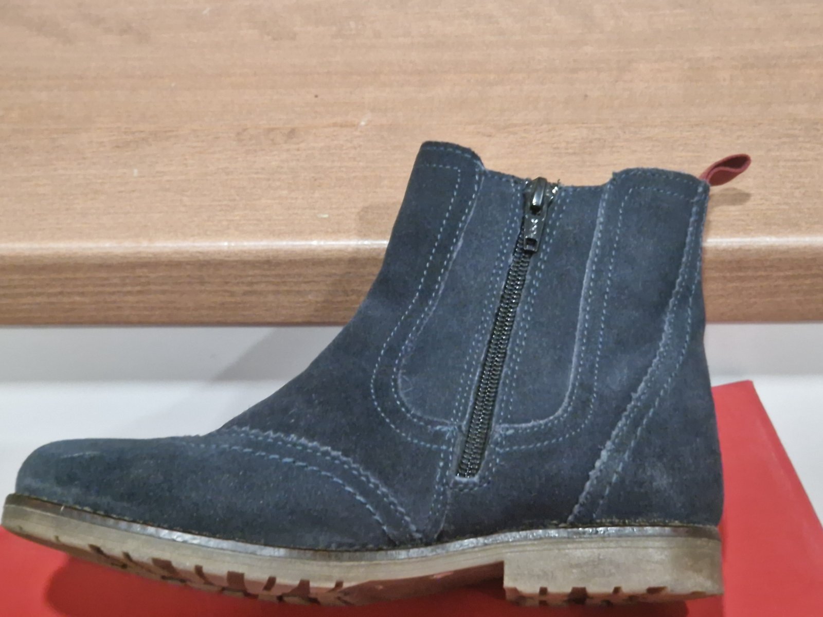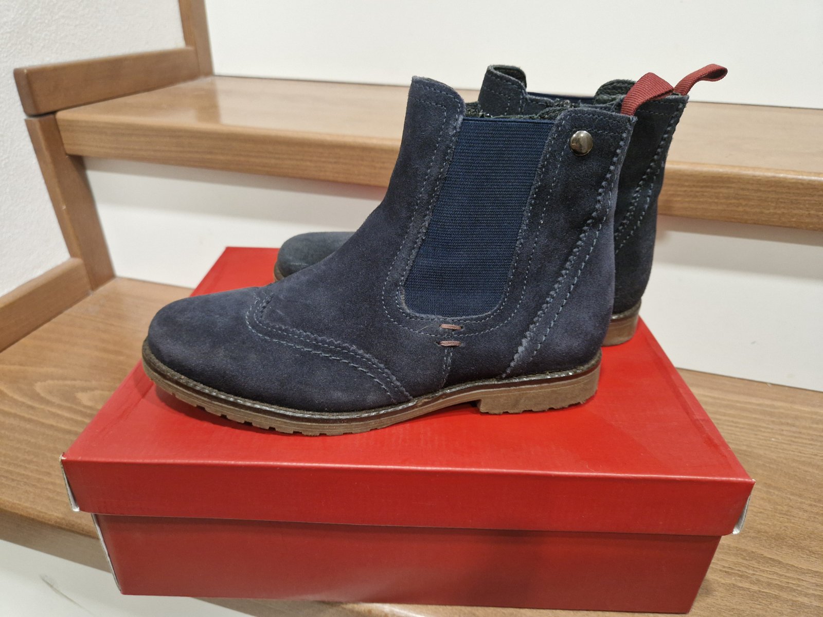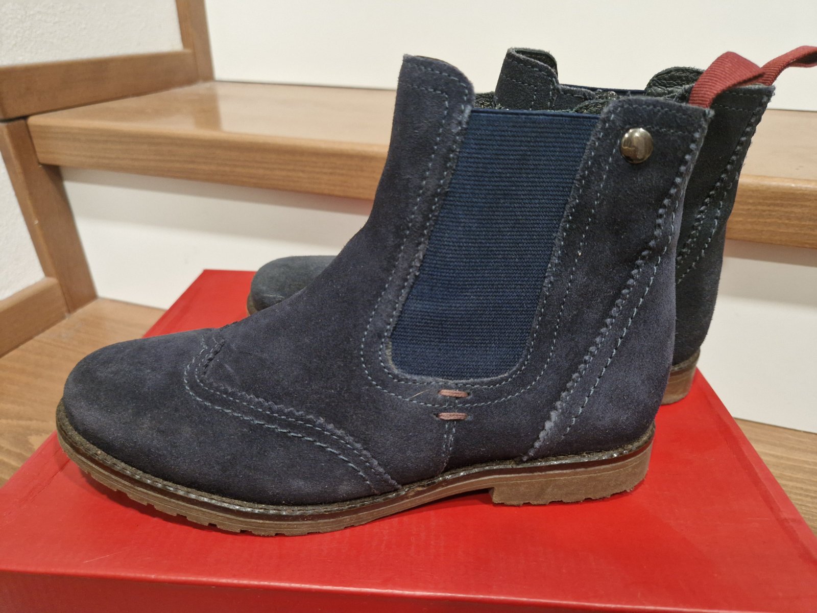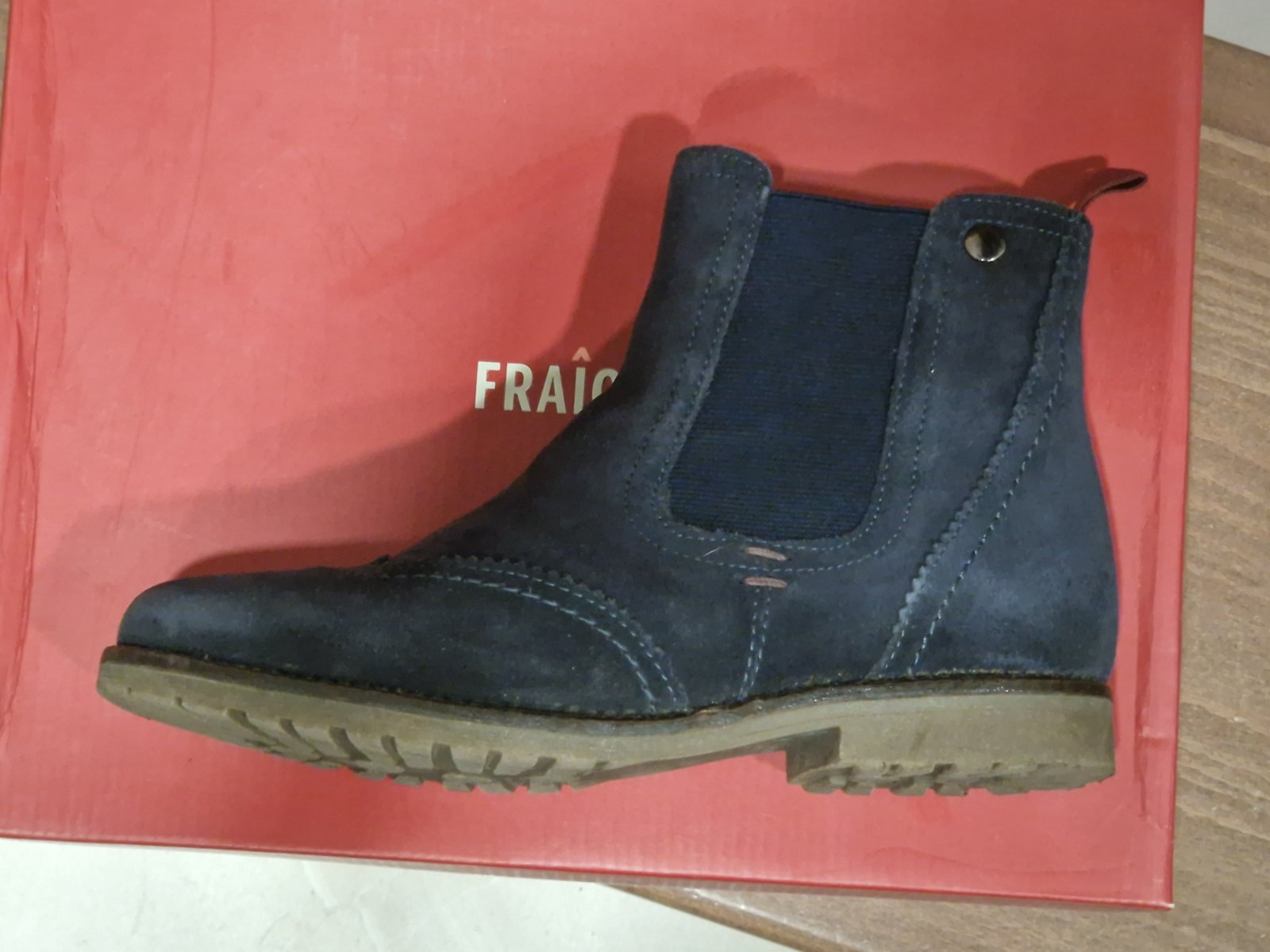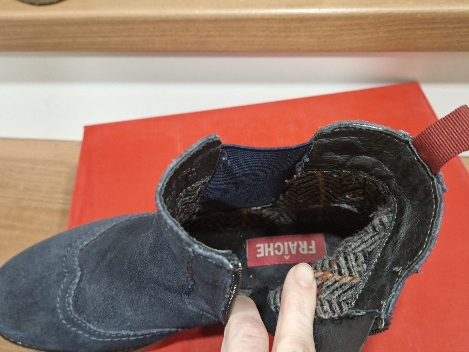 Krásne kvalitné tmavomodré kotníkové topánky z brúsenej kože, značka Fraiche, veľkosť 36. Zapínanie na zips, mierne zateplené, vhodné na teplejšie zimné dni alebo prechodné obdobie.Obuté max 4 krát, dcéra má veľmi širokú nohu a ten predok ide do mierneho špicu a tlačia ju = nie sú vhodné na širokú nohu. Pôvodná cena: 59,95 €.