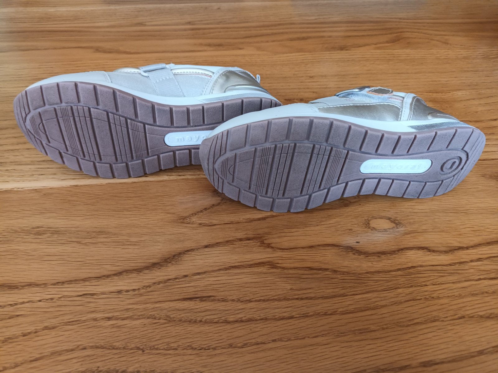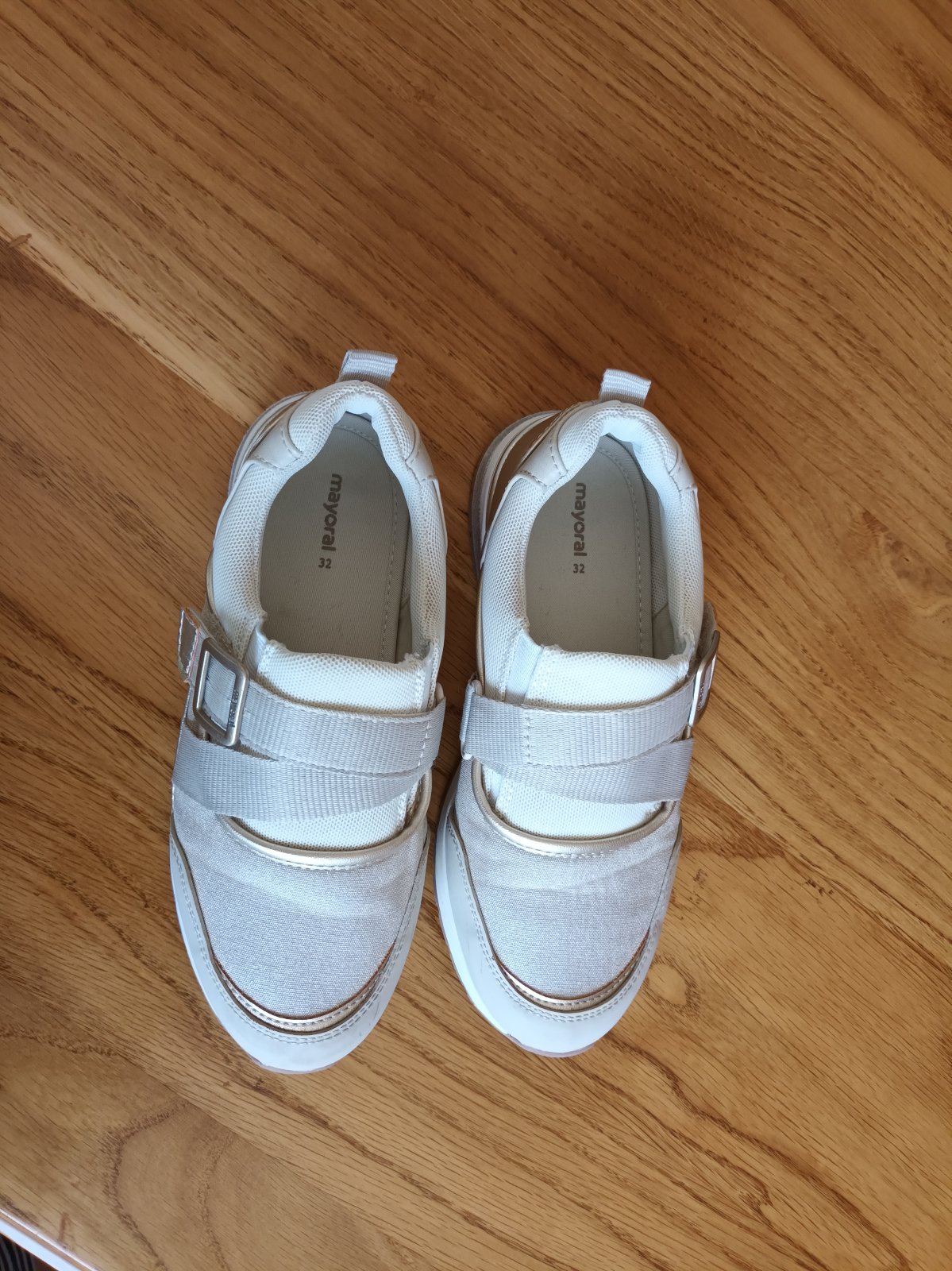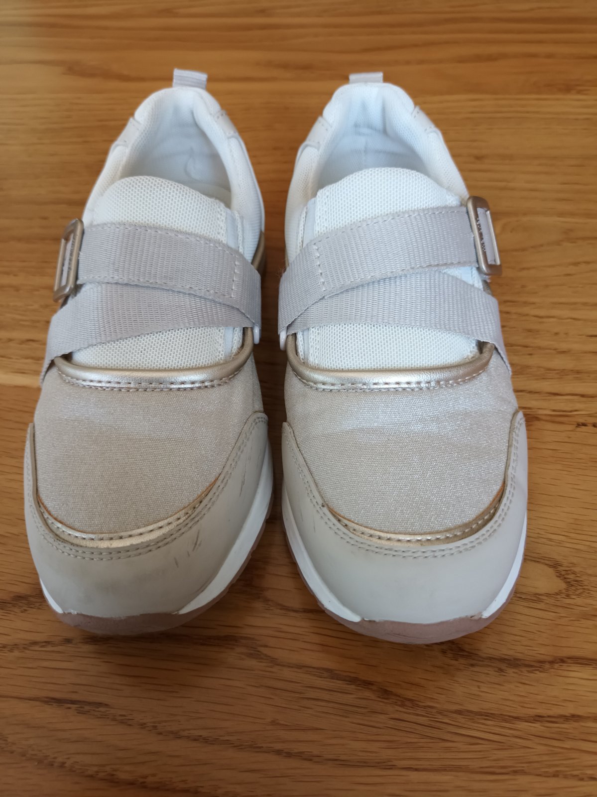 Krásne topánky pre dievčatá krémovo - zlatej farby. Veľmi dobre kombinovateľné. Vpredu sú známky nosenia, ale nie sú výrazne poškodené. Cena je 5,00 eur plus poštovné.