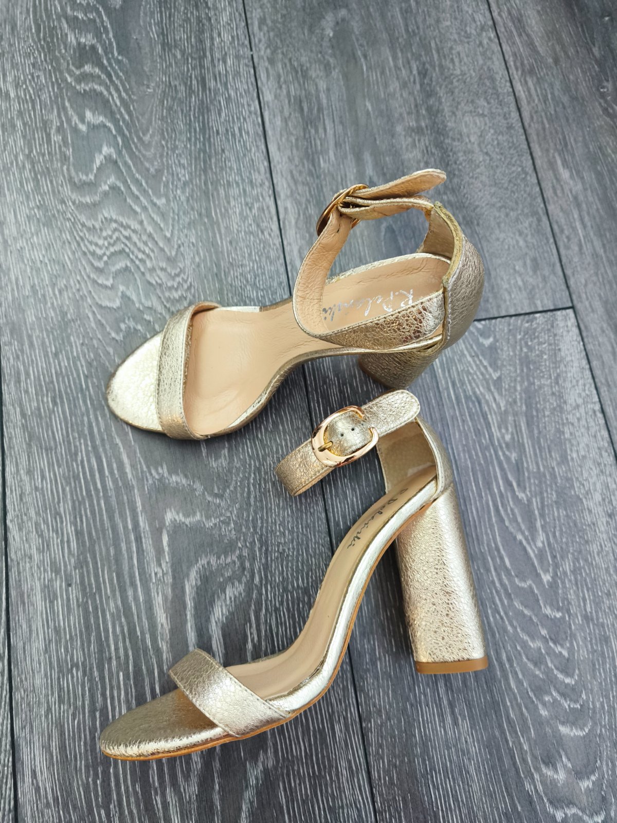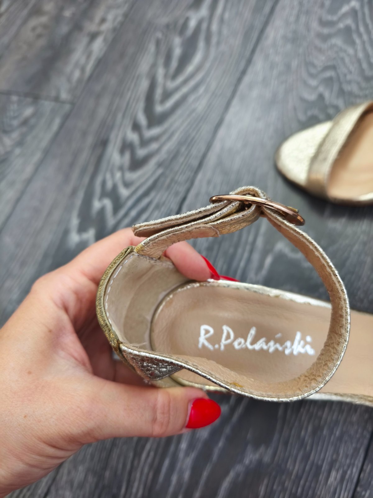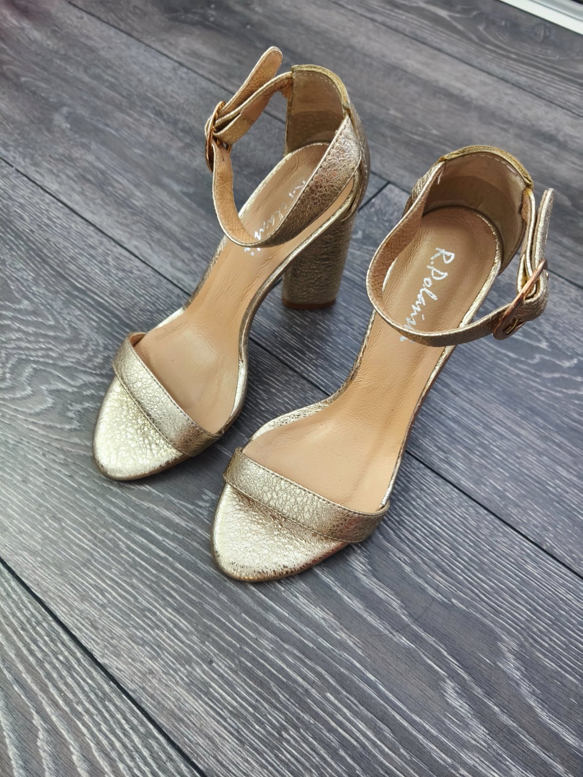 Dokonale zlate sandalky R.Polanski makkucke kvalitne kozene nadherny drahy kusok. Velkost 35 sedi vhodne skor na uzsiu nozku. Obute len chvilu na foteni vo vnutri, su mi zial uzke mam sirsiu nohu. Povodna cena bola vysoka.