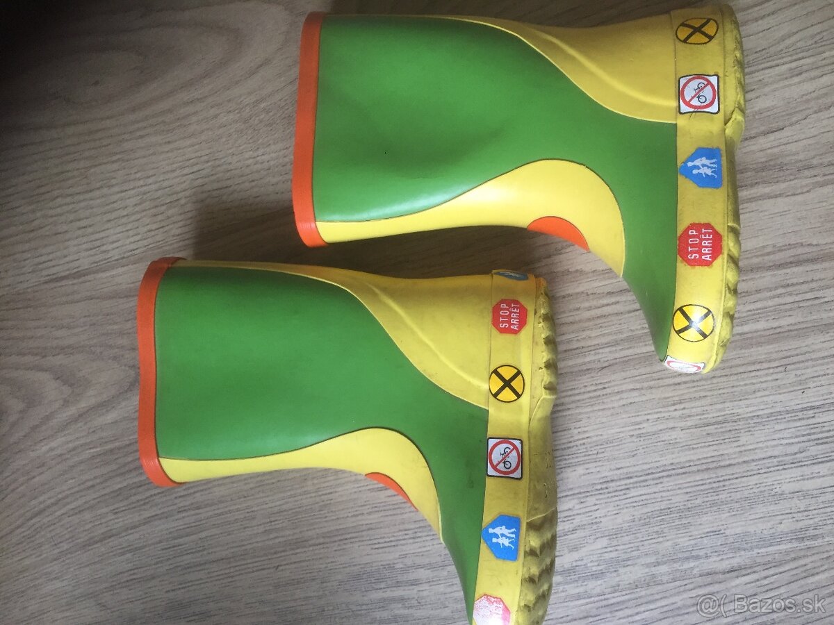 Gumáky vhodné pre chlapčeka alebo dievčatko. Nosené, ale bez väčších poškodení. Určite ešte výborne poslúžia. Vnútorná dĺžka 14 cm.