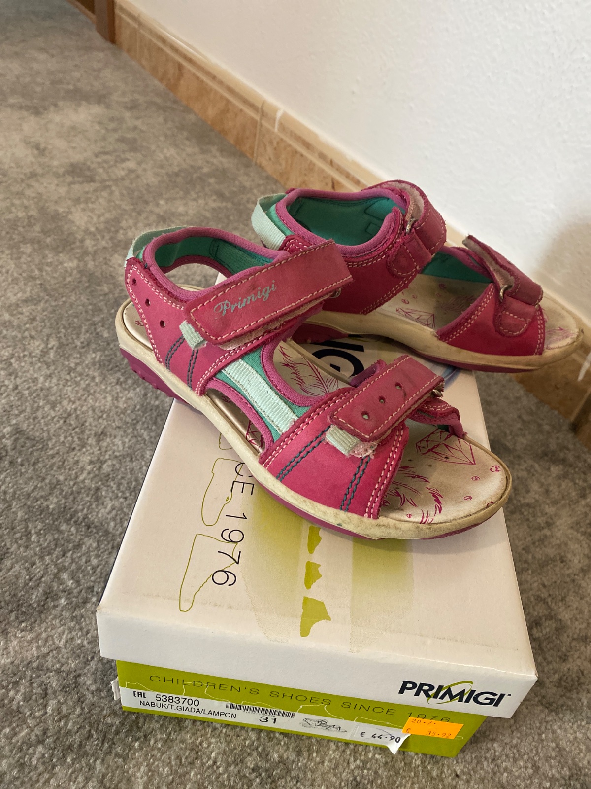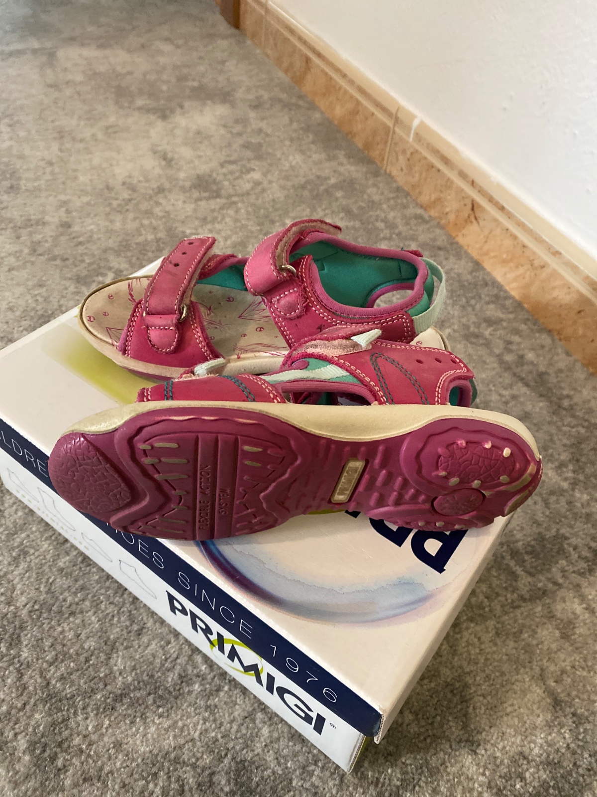 Sandálky nosené iba ako prezuvky v škôlke. Prasknuta koza na jednom ramienka. Inak veľmi zachovalé.