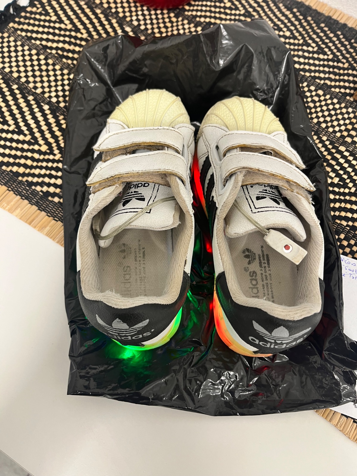 Predam parádne svietiace adidas tenisky. Nosene, nepoškodené. Suché zipsy sú opravené obuvníkom takze držia super. Svietenie na podrážke je kontrolované zapinane/vypinane/prepinane gombíkom na rôzne farby cez káblik kt.sa ukrýva pod jazykom topánky. Da sa nabíjať cez micro USB vstup. Cena je bez poštovného.