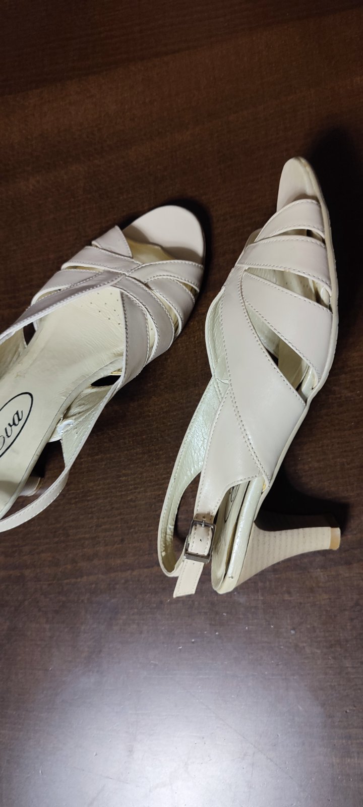 Béžové kožené sandálky, kupované v obuve. Vonkajši materiál koža. Mala som ich dvakrát. Dlho som nenosila opätky, stoja mi tu. Už sa začína uvoľňovať trošku vnútro. Niekomu ešte poslúžia.