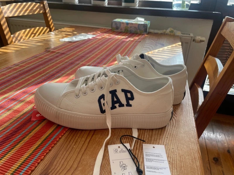 Nove nenosene tenisky GAP navy, biele , namornicke s visackou, predna cast je gumena cize sa nezaspini. Nema vysoku patu preto neobryzie , vyssia platforma.