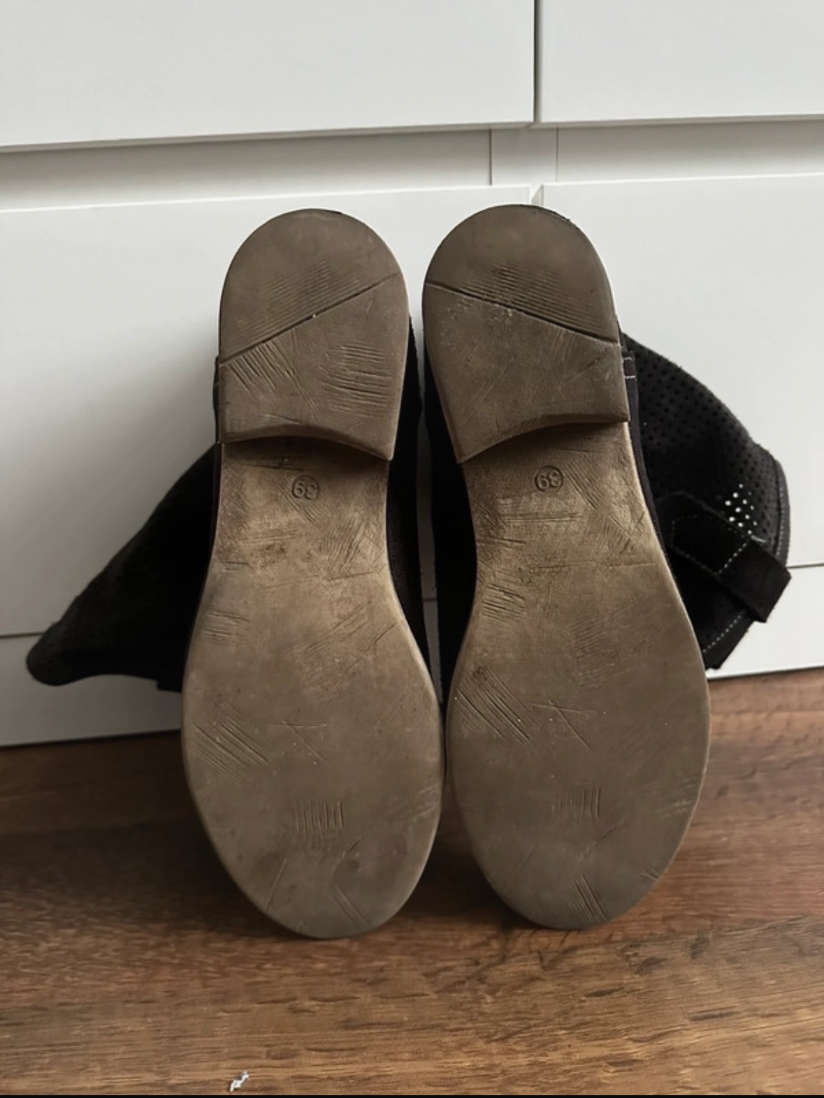 Krásne kožené čižmičky v top stave, z brúsenej kože, pár krát obuté, neviem chodiť v takých vysokých opätkoch . Veľkosť písaná 38, ale nosím 39 sú mi ok. Vnútorný rozmer cca 26 cm. Bez chybičky.