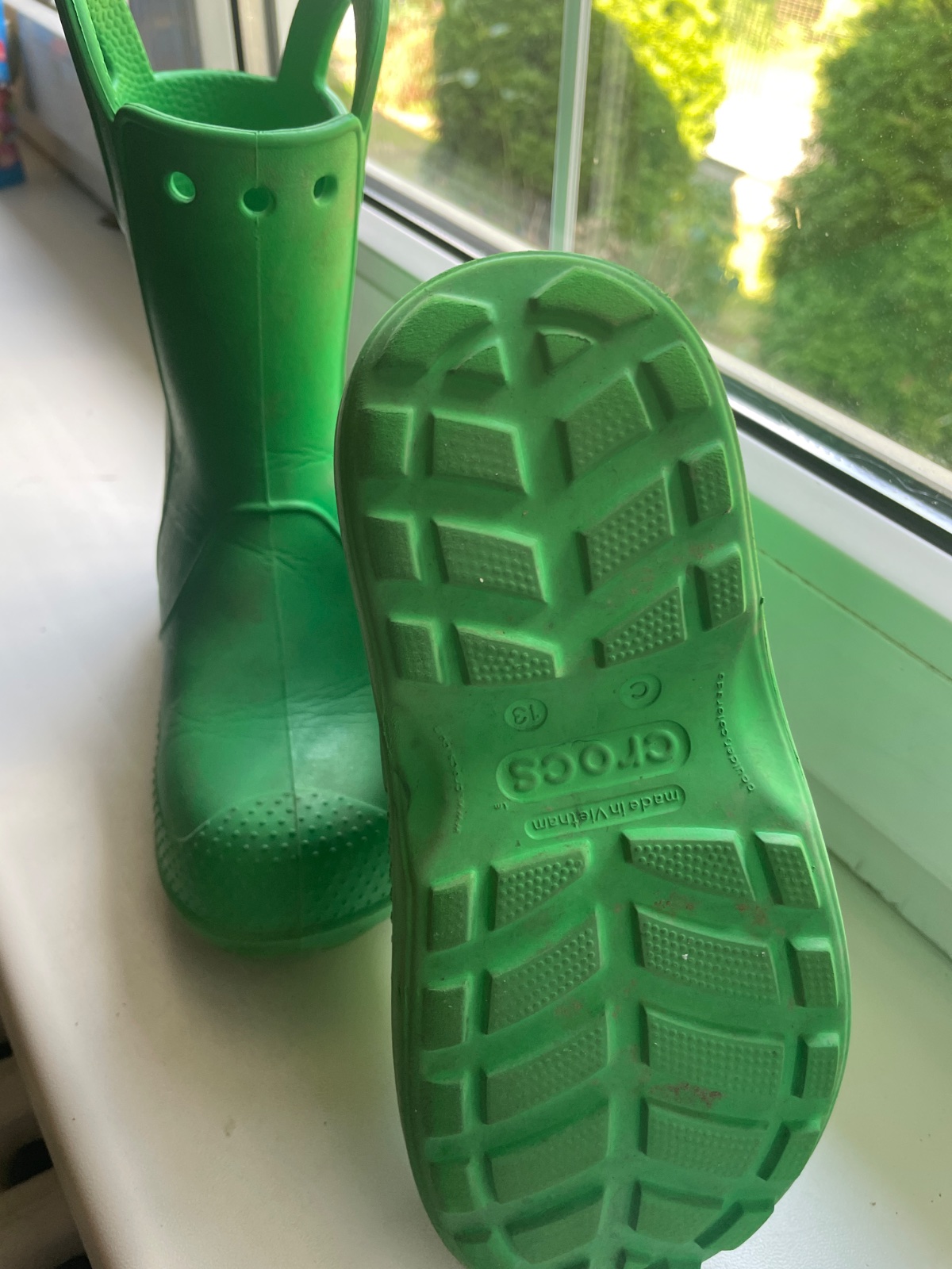 Ponúkam známe gumáky od značky Crocs. Anglická veľkosť je 12-13, čo zodpovedá našej 29-31, takze uvádzam 30, vnut. dlzka určená pre cca od 18,3-19,1cm. Boli nosené pomenej, ale drobné známky použív...