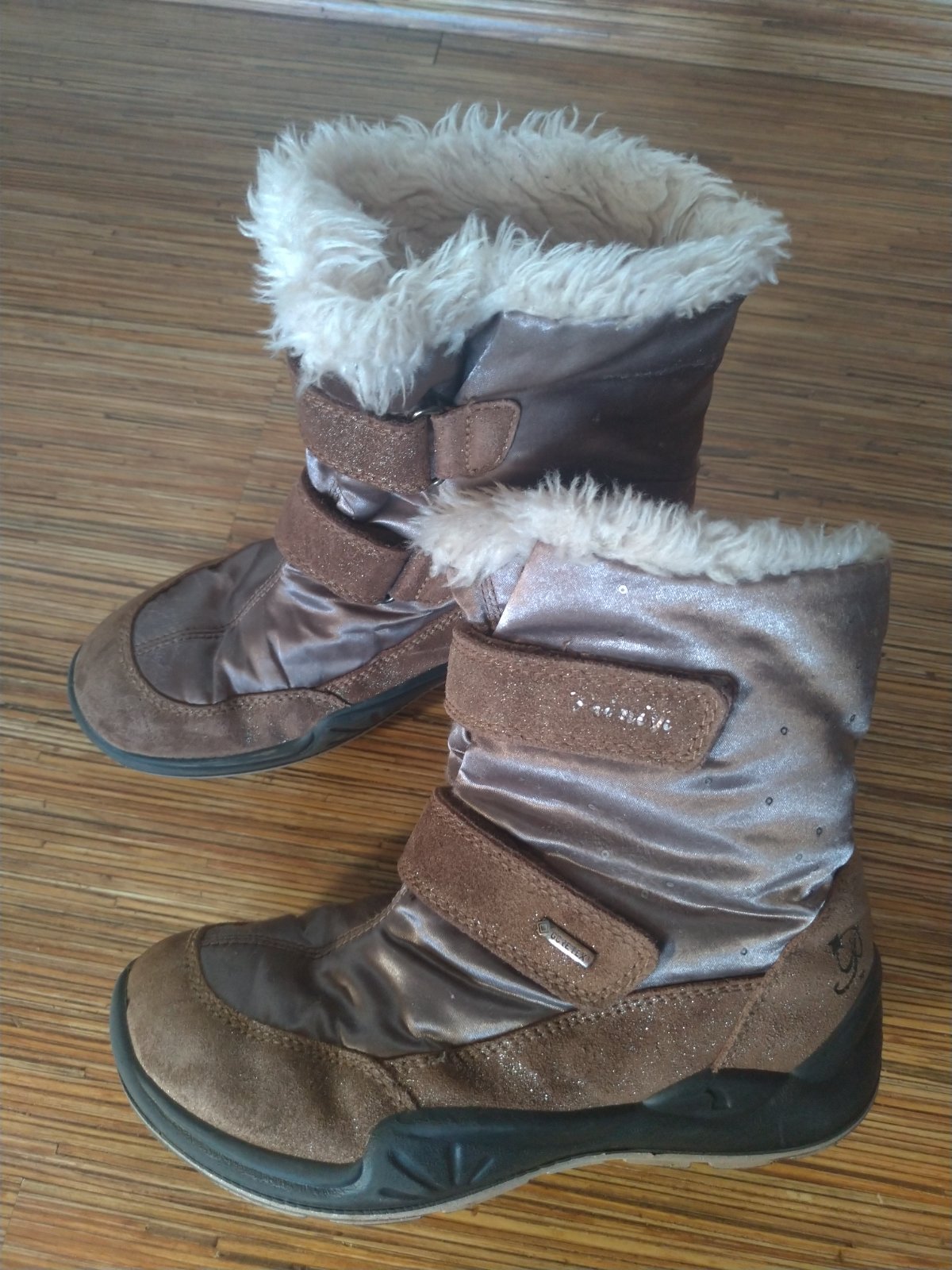 Veľmi pekné, nepremokavé a teplé čižmičky k leginkam aj sukničkám. Snehu veľa nebolo, tak sme moc nezodrali, sú ako nové. VD 22cm