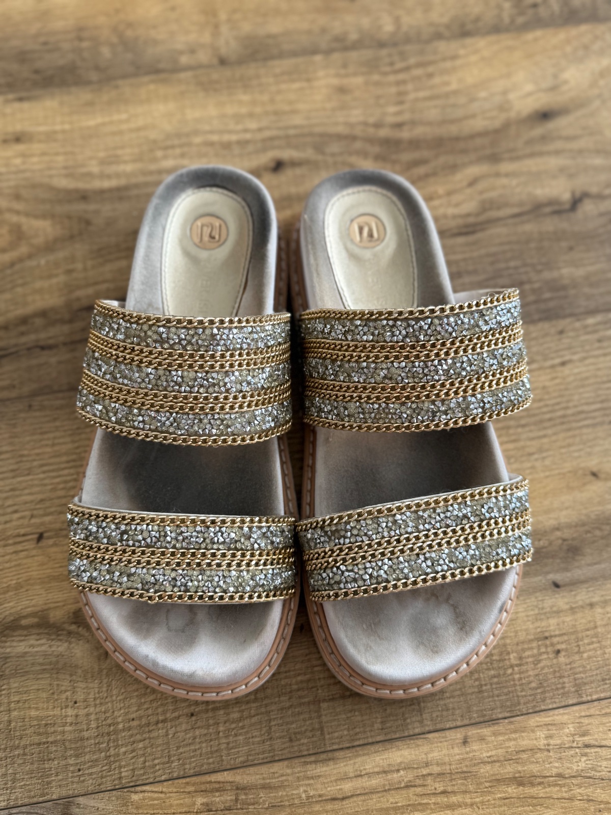 Efektné šlapky v zlatej farbe na prst, v predu kameň (priestvitný plast). Kúpené v UK, darček a nesedí :( Majú etikety a zbytky po cenovke / viď foto.
