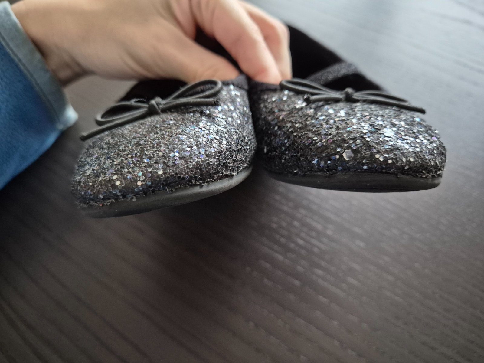 Dievčenské čierne trblietavé balerínky v dobrom stave.Nosené krátko. Vo vnútri balerínok je látka trocha odlepená inak nemá žiadnu chybu.Veľkosť 29.