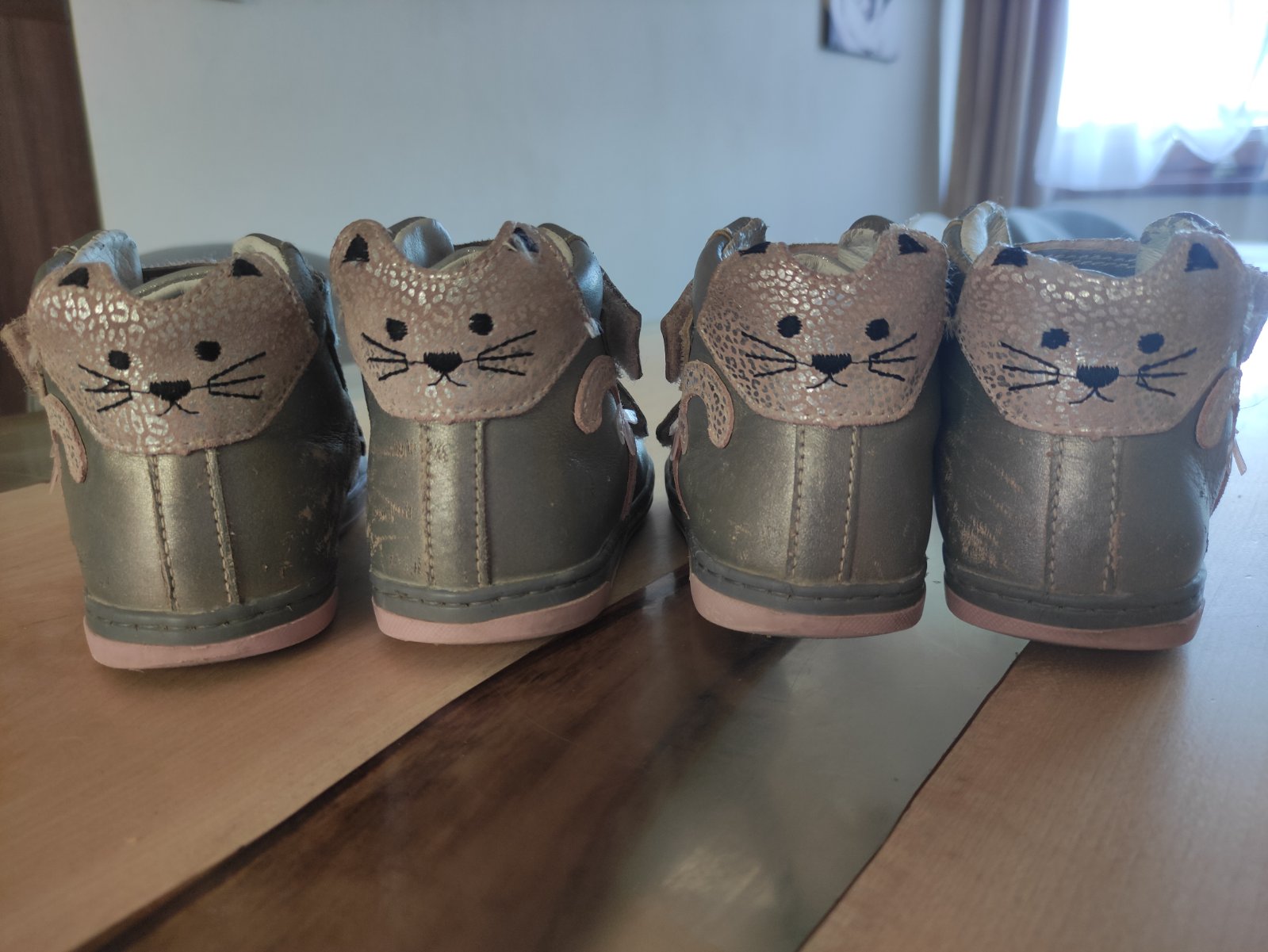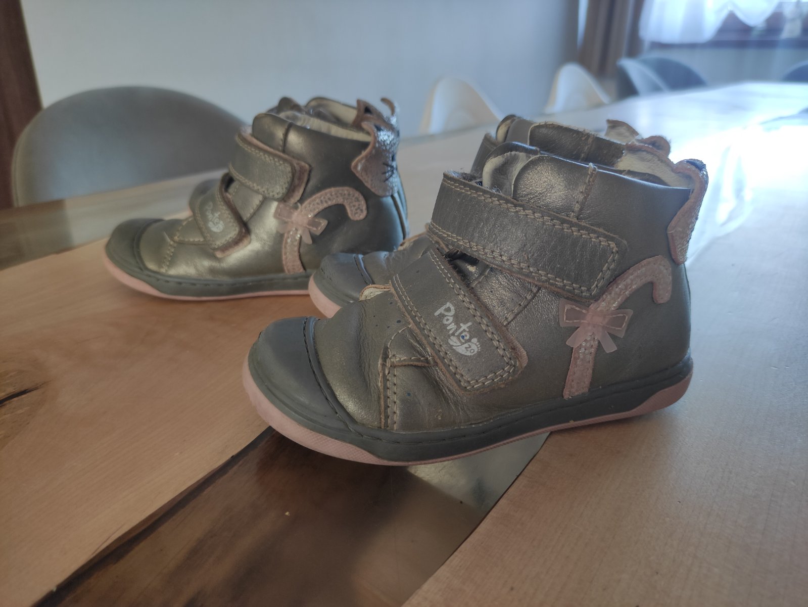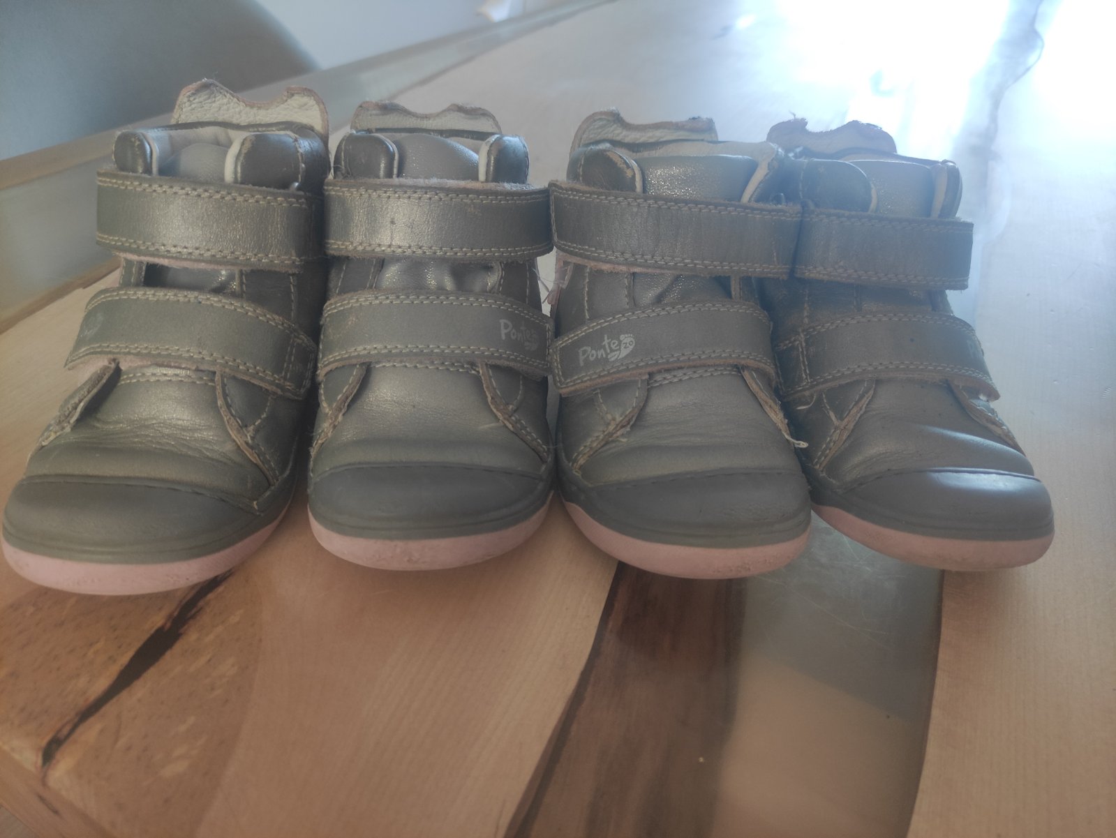 Používané topánky našimi dvojičkami, kupované boli nové. Celokoženné,nepremokavé a veľmi pohodlné. Majú nezničitelnu špičku 😀 najviac ošúchané sú z vnútornej strany (keď pri chôdzi šúchali nôžkami o seba),ale používanie vidieť celkovo,preto je to aj zohľadnené na cene. Aj keď na tej striebornej farbe to až tak nekričí...Značka Ponte, kvalitná, vhodné aj pre širšie nožičky. Cena 8€/pár.