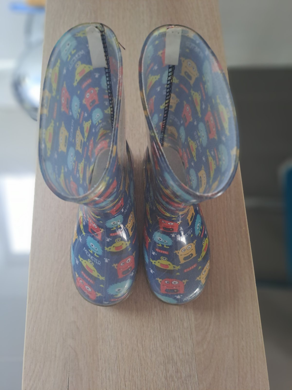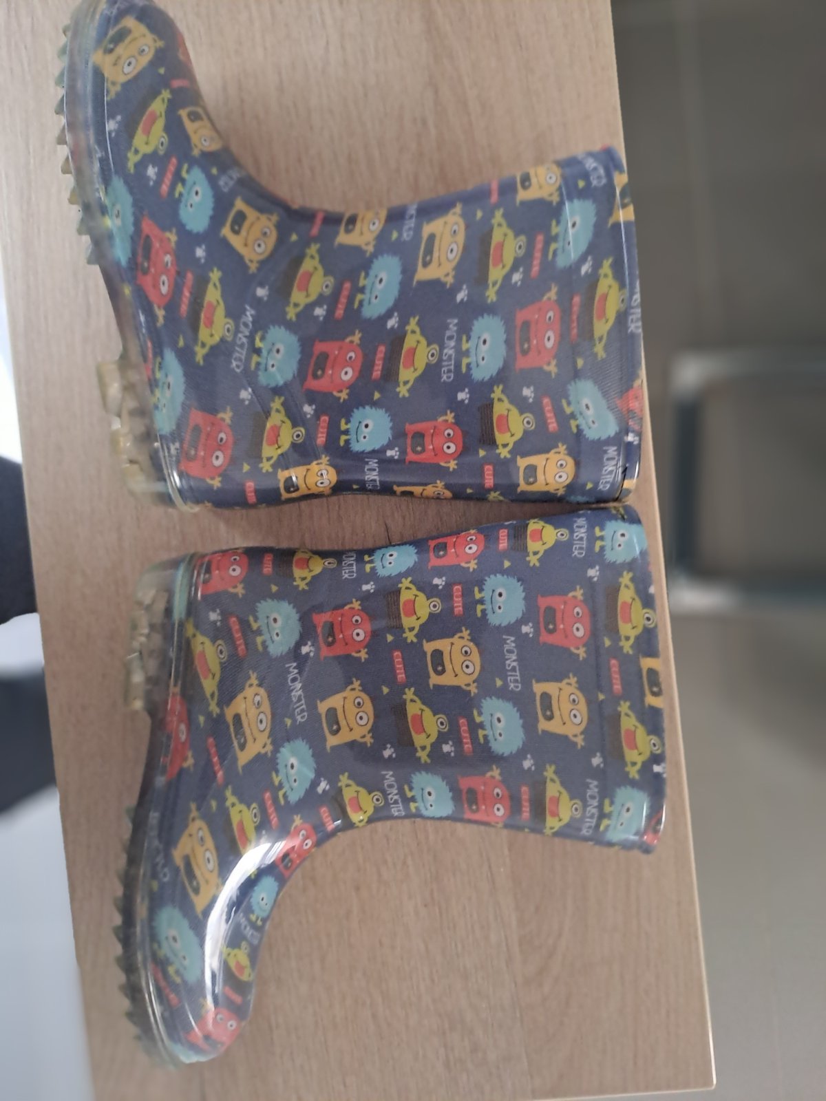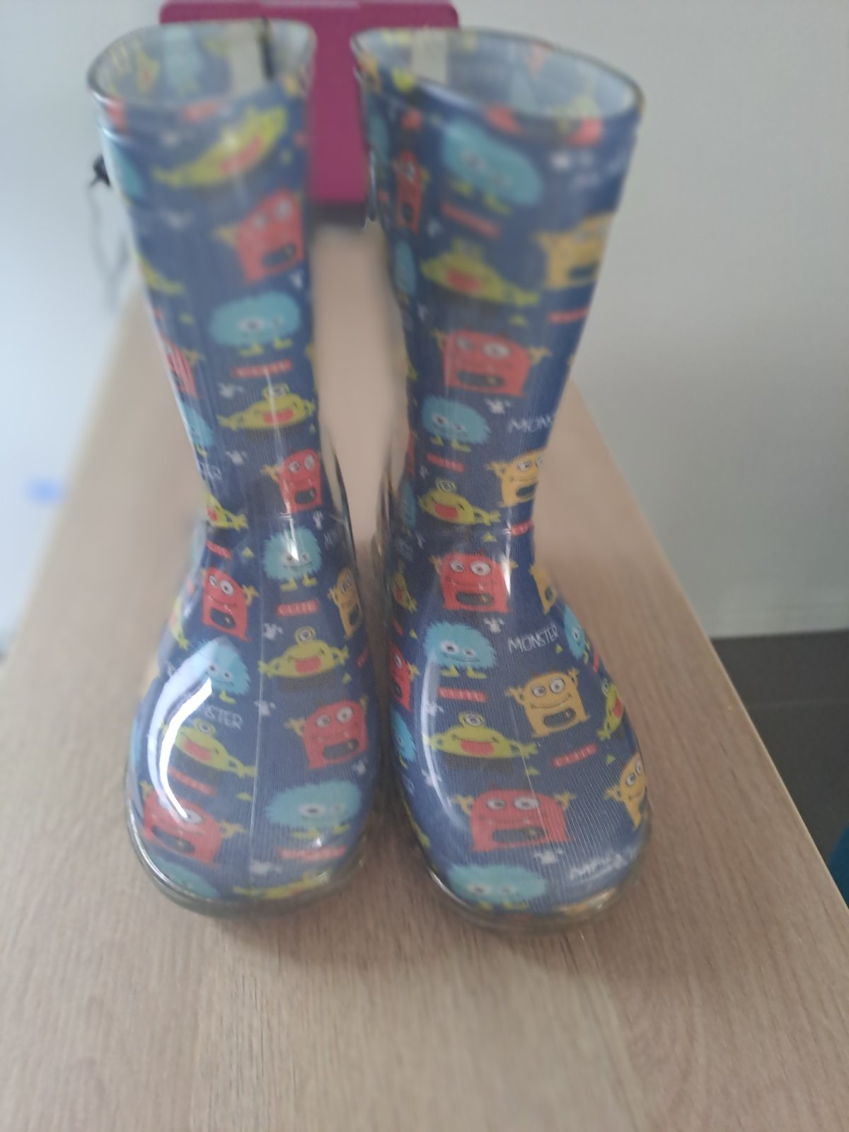 Gumáčiky obuté asi 4 krát.Podrážka v bezchybnom stave neschodné. Už sú našemu malé. Gumáčiky sú zle odfotené, tážko sa mi to fotilo lebo oni majú obrázok a na ňom majú priesvitnú gumu. Vd je 16cm.