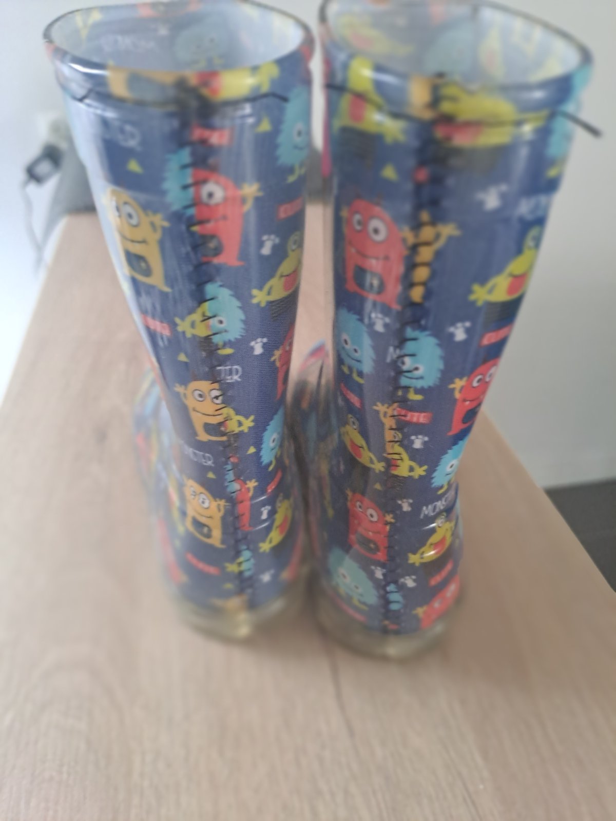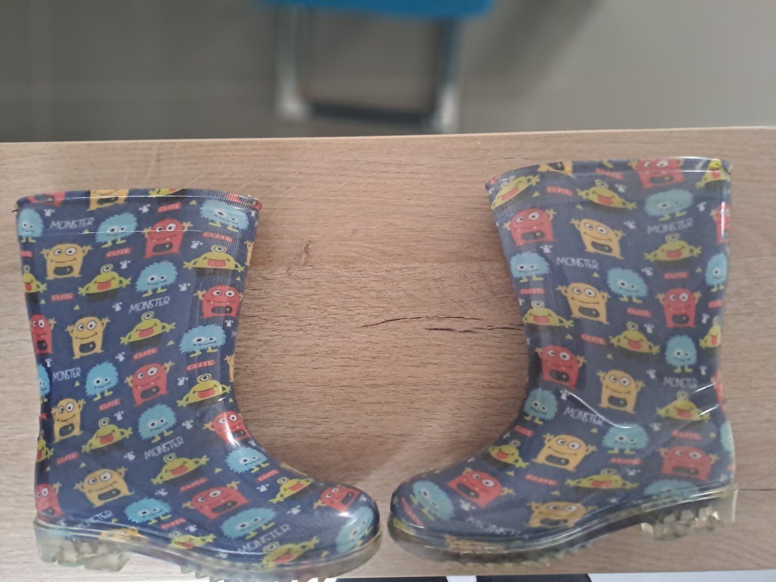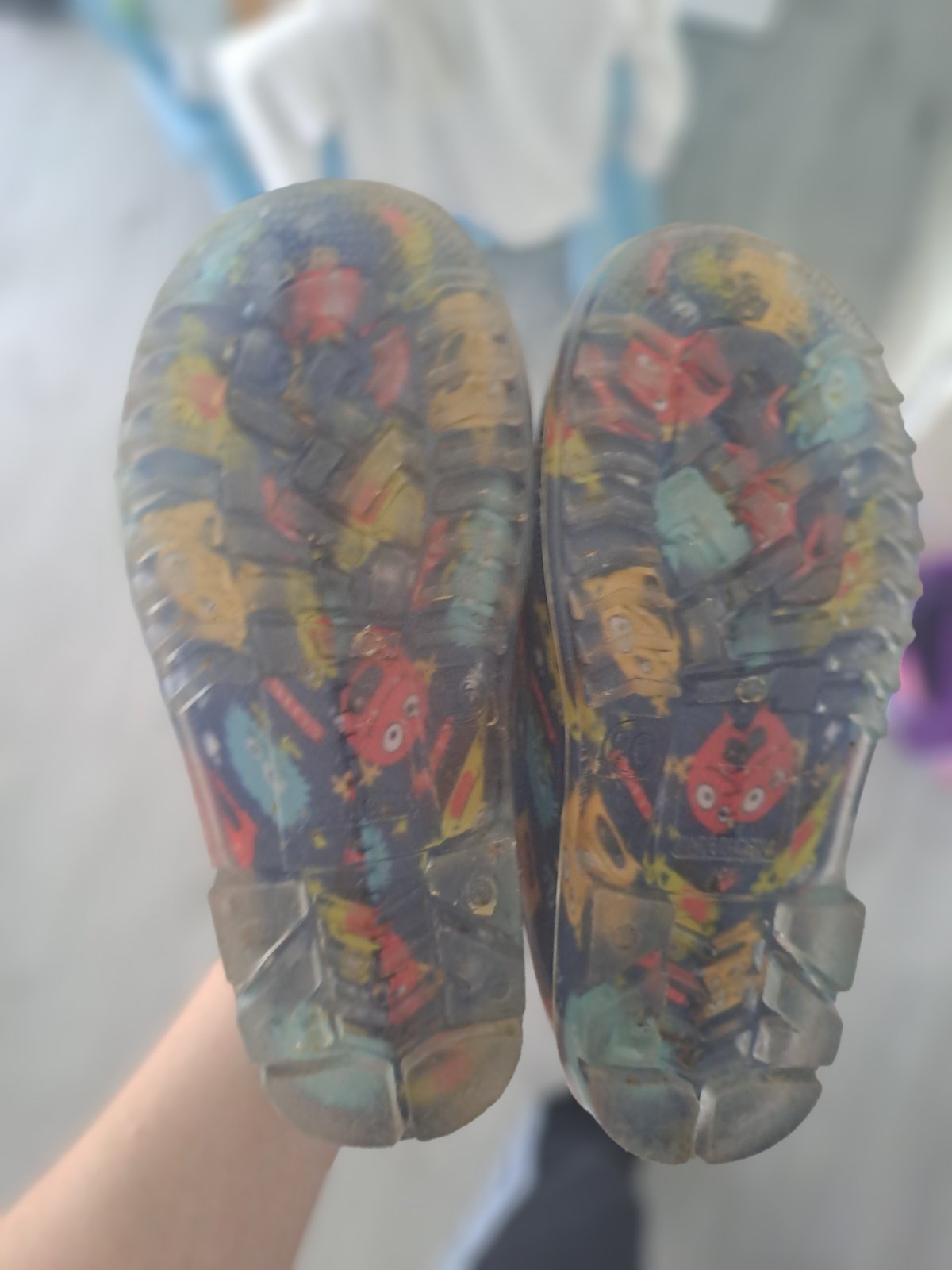 Gumáčiky obuté asi 4 krát.Podrážka v bezchybnom stave neschodné. Už sú našemu malé. Gumáčiky sú zle odfotené, tážko sa mi to fotilo lebo oni majú obrázok a na ňom majú priesvitnú gumu. Vd je 16cm.