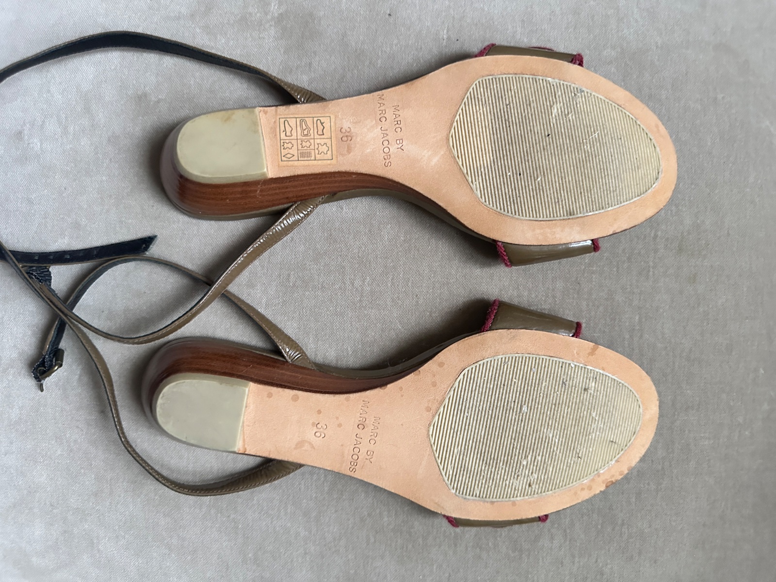 Sandálky v lakovanej koži so zvýšeným opätkom. Zapínanie - remienkom okolo kotníkov. Málo ponosené, vo veľmi peknom stave.
